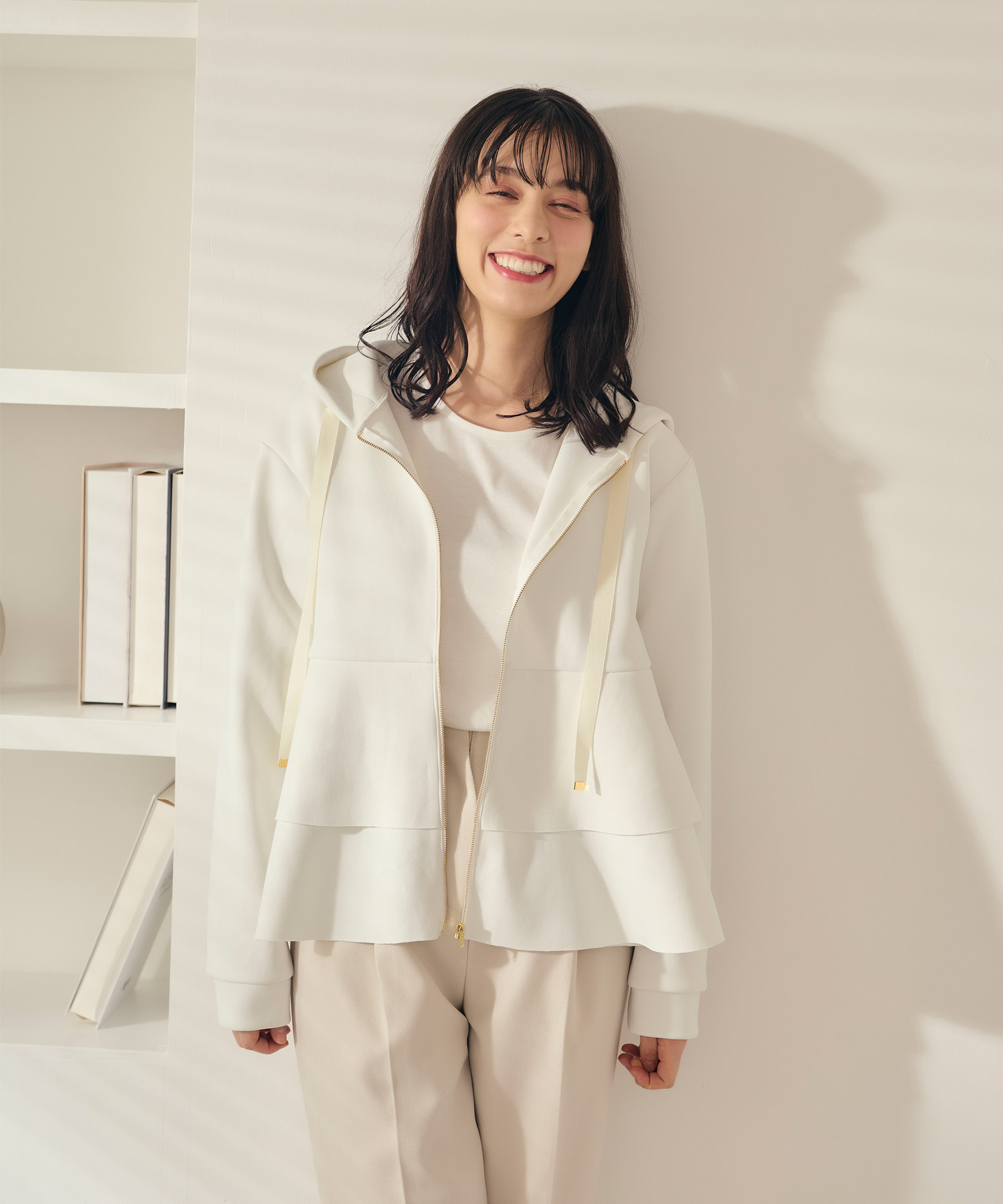 フード付きのパーカーはカジュアルなアイテムの代表格ですが、ボンディングニット素材ならきれいめに仕上がり、滑らかな肌触り。裾はフリル付きで女性らしく着こなせるところにも注目です。ワンマイルのお出かけから、アクティブな遊園地デートなどにもおすすめのアイテムです。