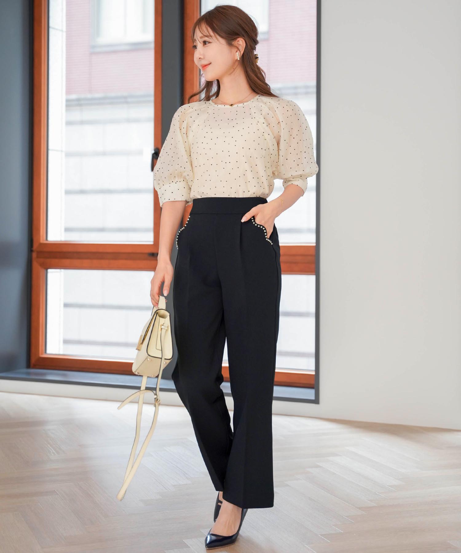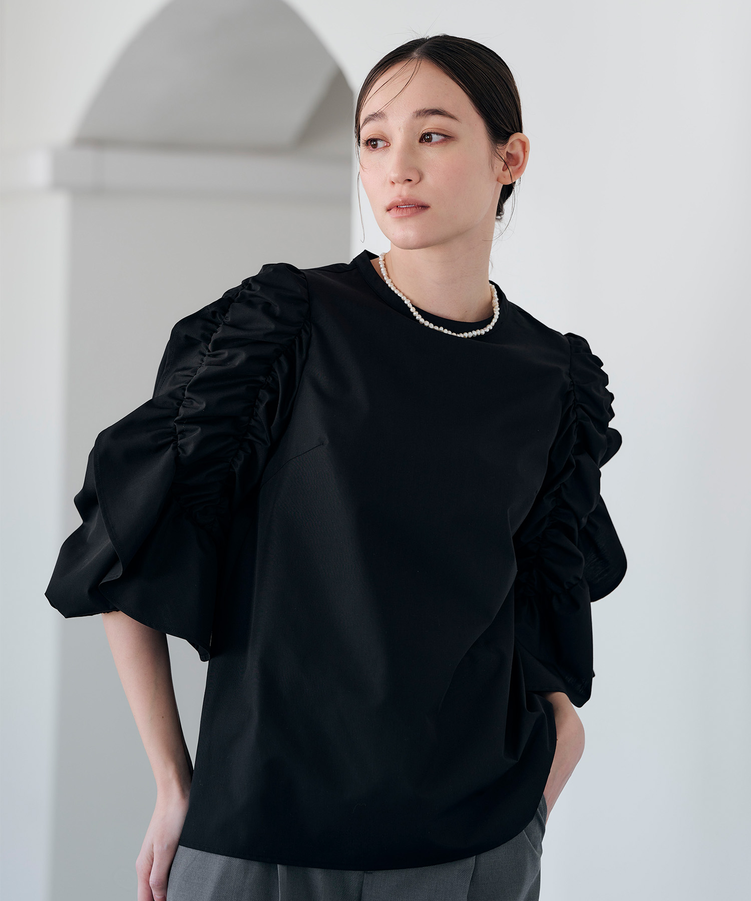 袖にギャザーやフリルが付いたデコラティブなブラウスなら着るだけで即旬顔に。黒ならシックに決まるので、甘さの中に大人っぽさを引き出せます。首元はパールの変形デザイン”バロックパール”で上品さをトッピング。
