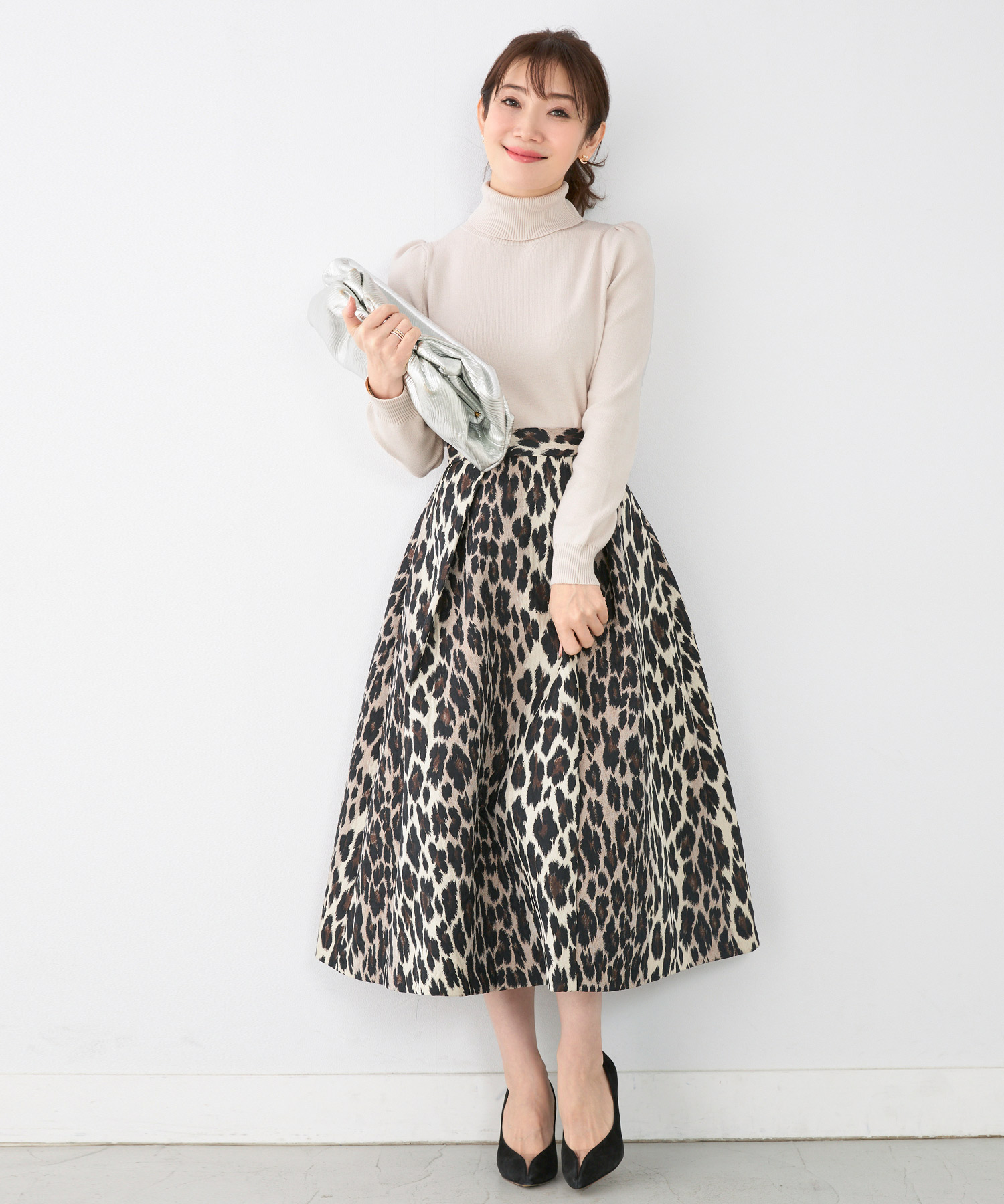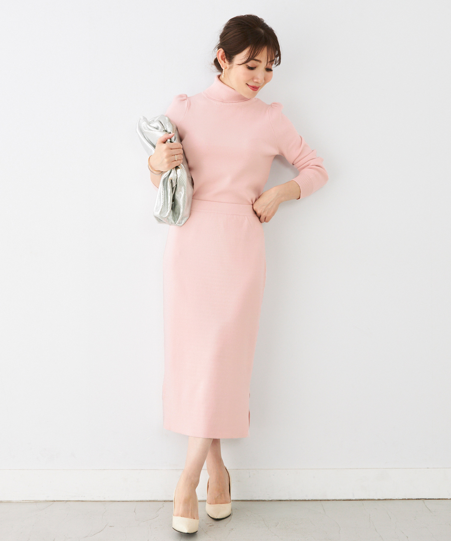 柔らかいニット素材の中にいやらしさのない光沢感がプラスされ、より上品な印象に。