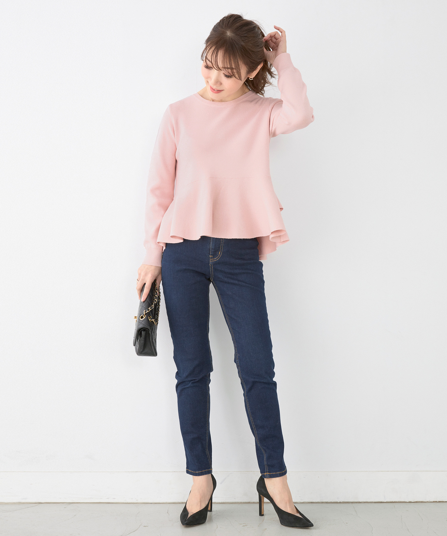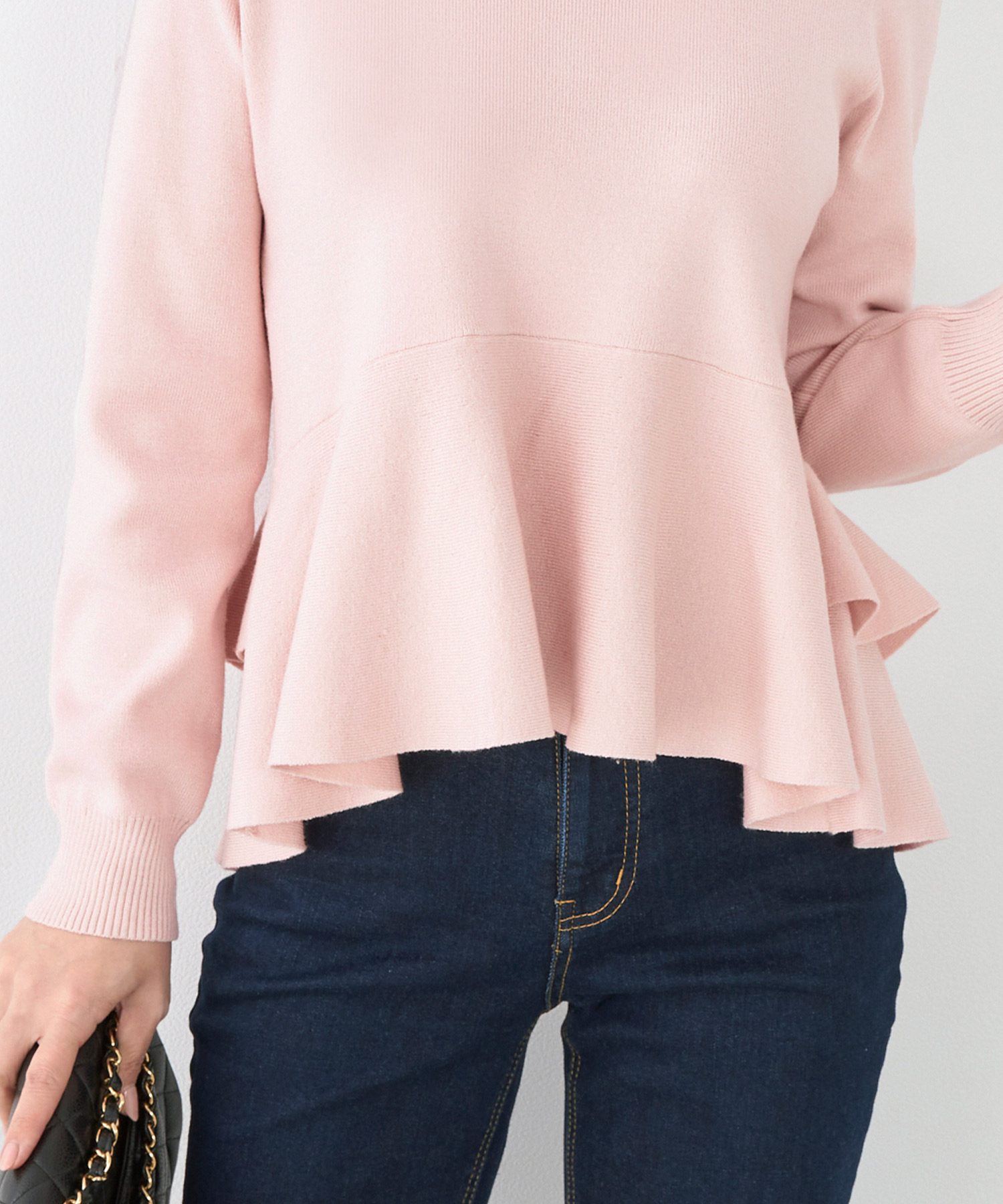 裾にフレアのデザインのあるプルオーバーは1枚でサラッと着こなすのがおすすめ。