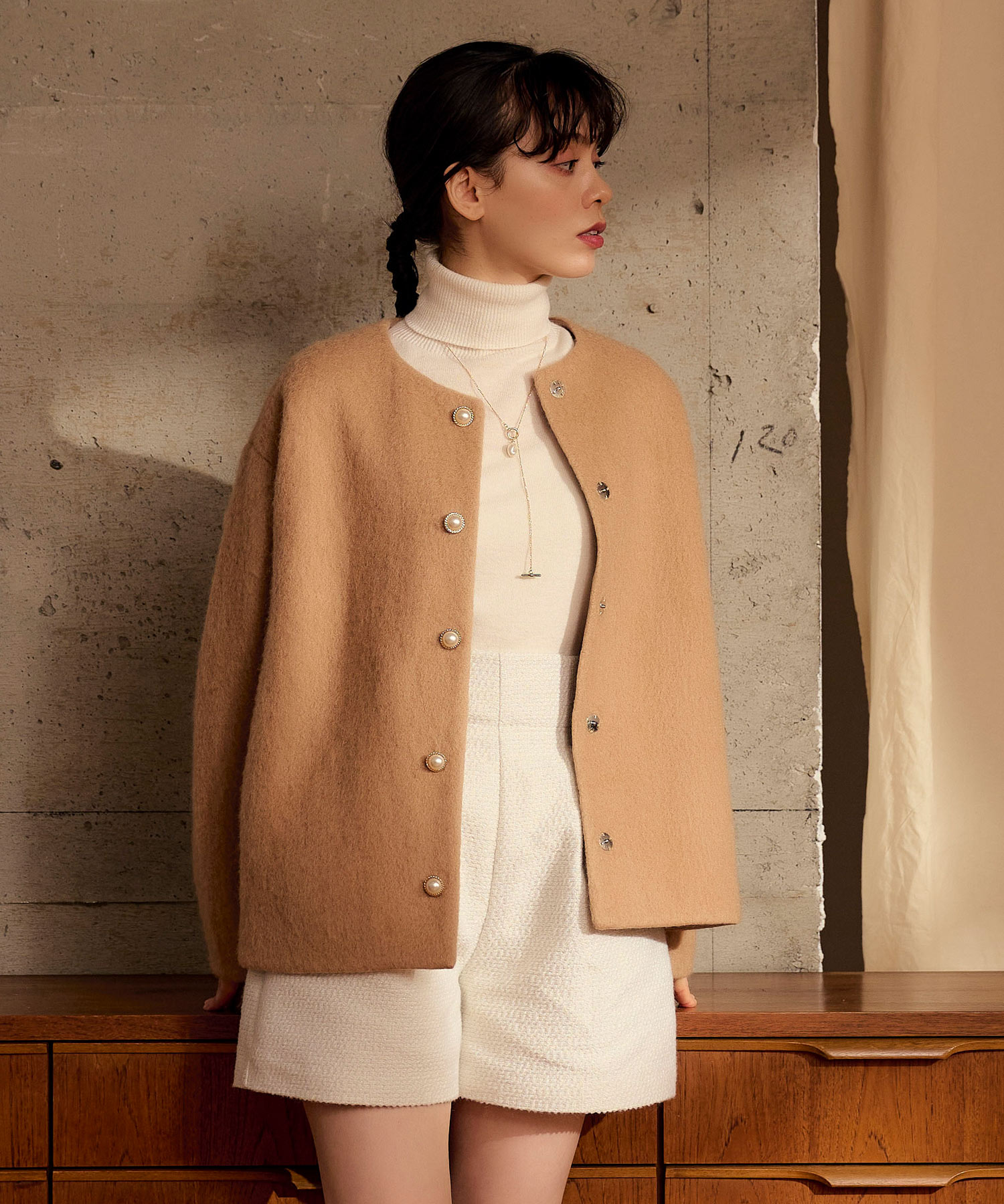 ホワイト×キャメルのふんわり優しげなグラデーションコーデは洒落見え確実。ショートパンツスタイルも落ち着いた雰囲気に着こなせます。アクセサリーいらずでコーデを洗練させるツヤのあるコートのパール釦にも注目!