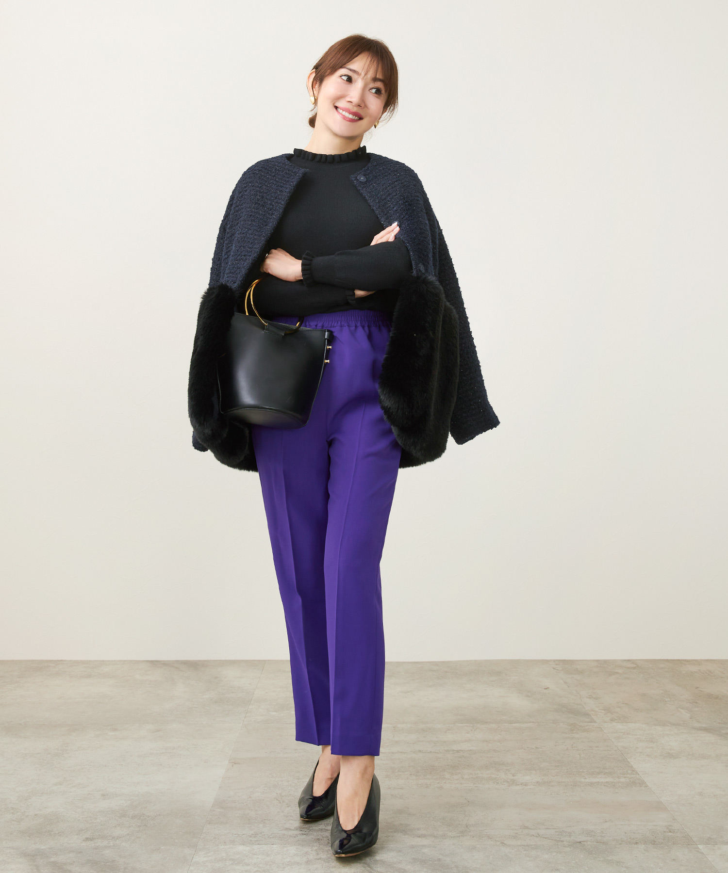 ツイードがベースのミドルコートに旬のエコファーがドッキング。羽織るだけで高級感が増して、大人のエレガントな着こなしに仕上がります。あえてカラーパンツで外すコーデはこなれ感があって◎。