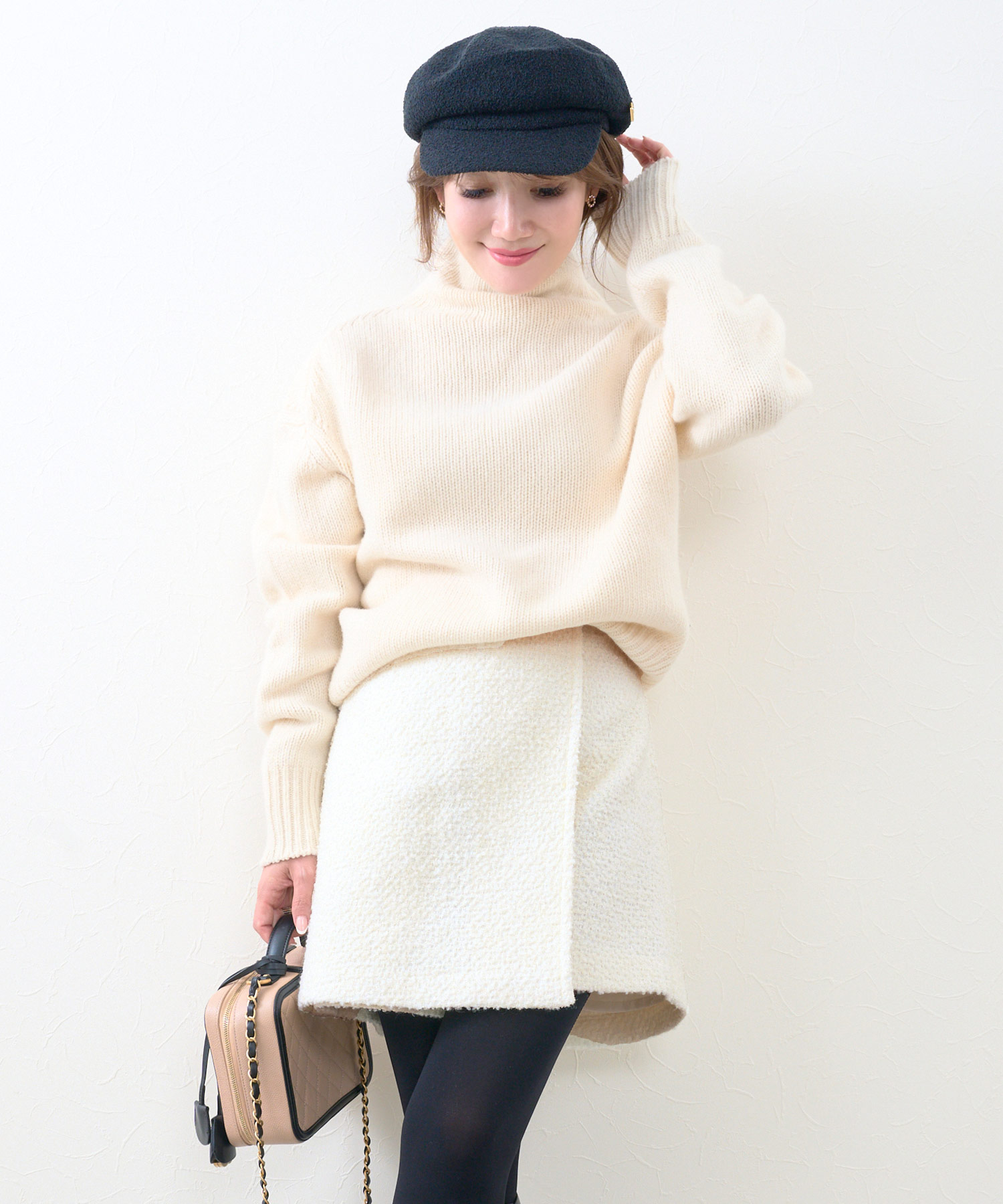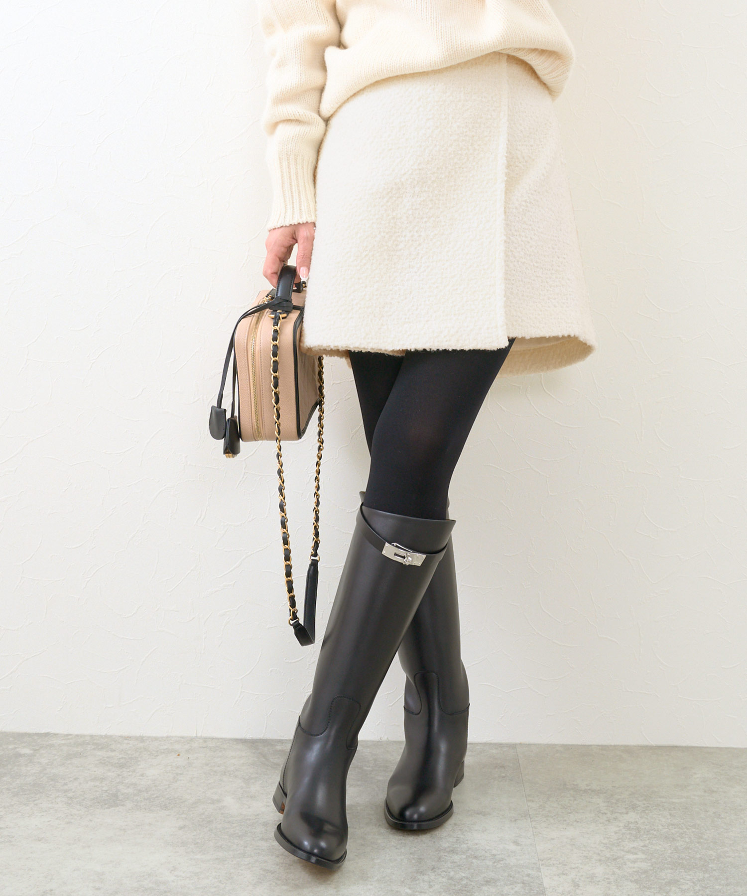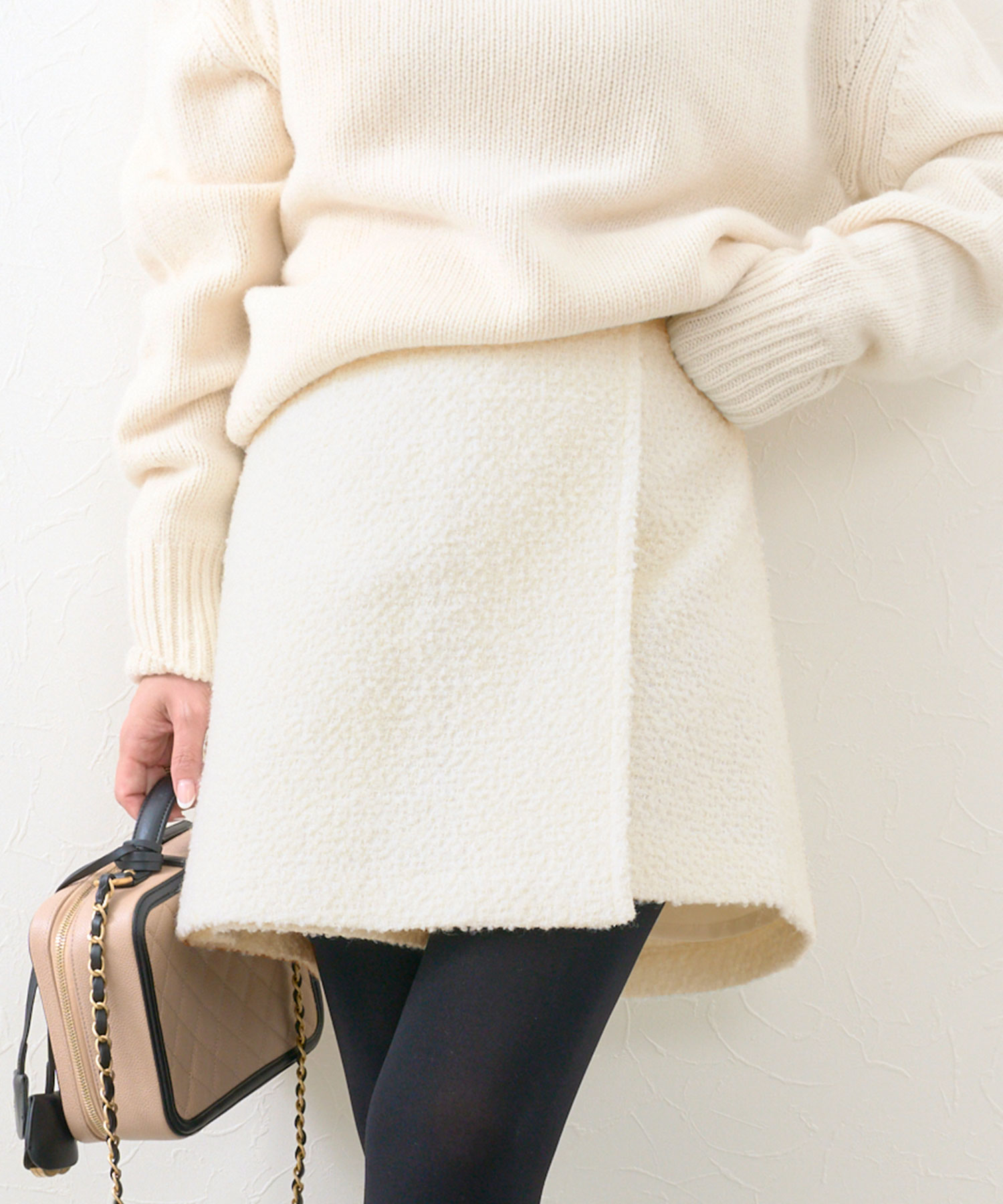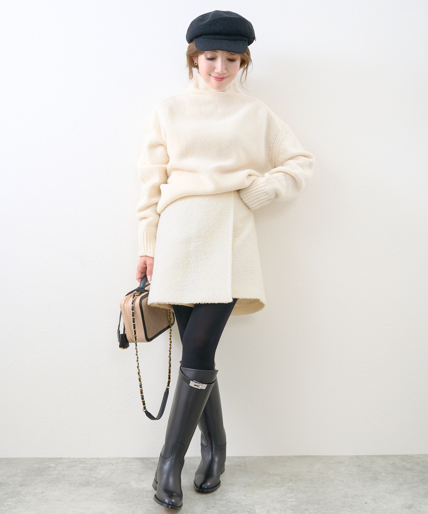 昨年から人気が再燃しているミニスカートを、ラップ風デザインでショートパンツに仕上げました。ロングブーツとセットでスタイリングして防寒&トレンドを意識。