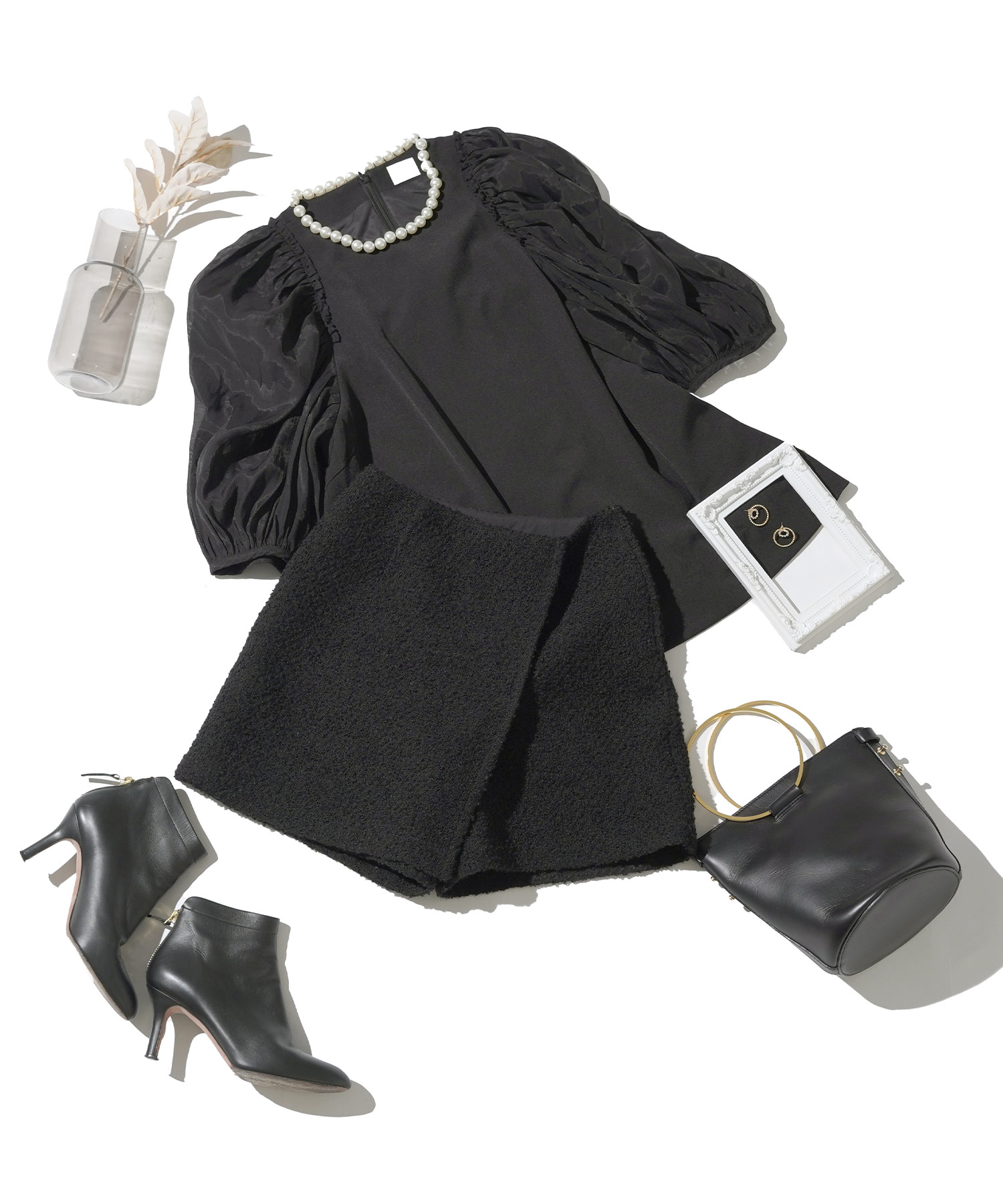 楽ちんではあるものの大人の女性には合わせるのが難しいサロペットをツイード素材でエレガントに。女子会やホテルディナーなど、インナーの選び方によってさまざまなシーンで活躍してくれます。