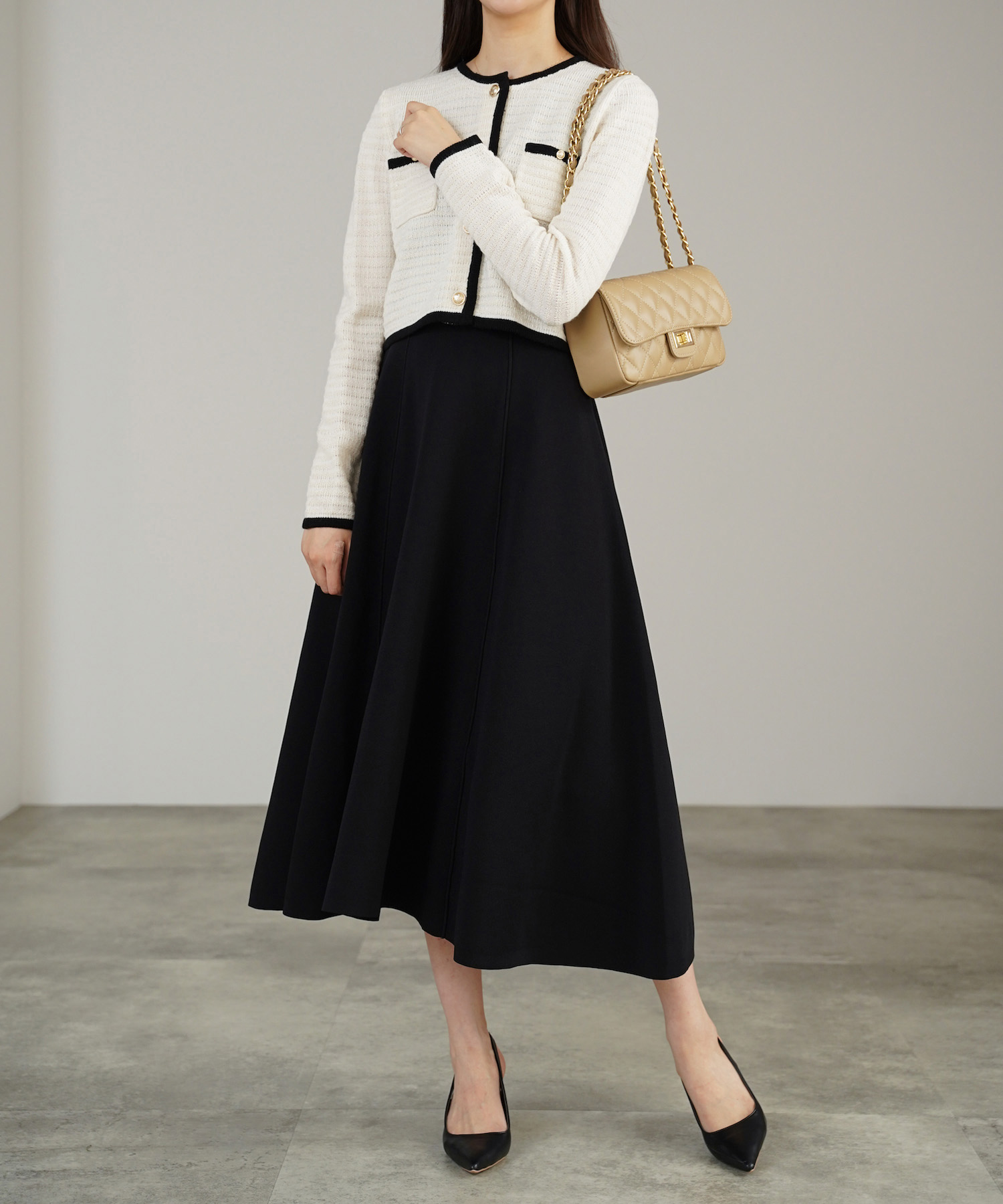 流行りの袖コンシャスデザインをツイードで秋仕様に。通勤はもちろん、子どもの学校行事やセレモニーなどでも活躍するシーンレスなアイテム。形はやや長めのフレアシルエットで気になる腰回りをカバー。