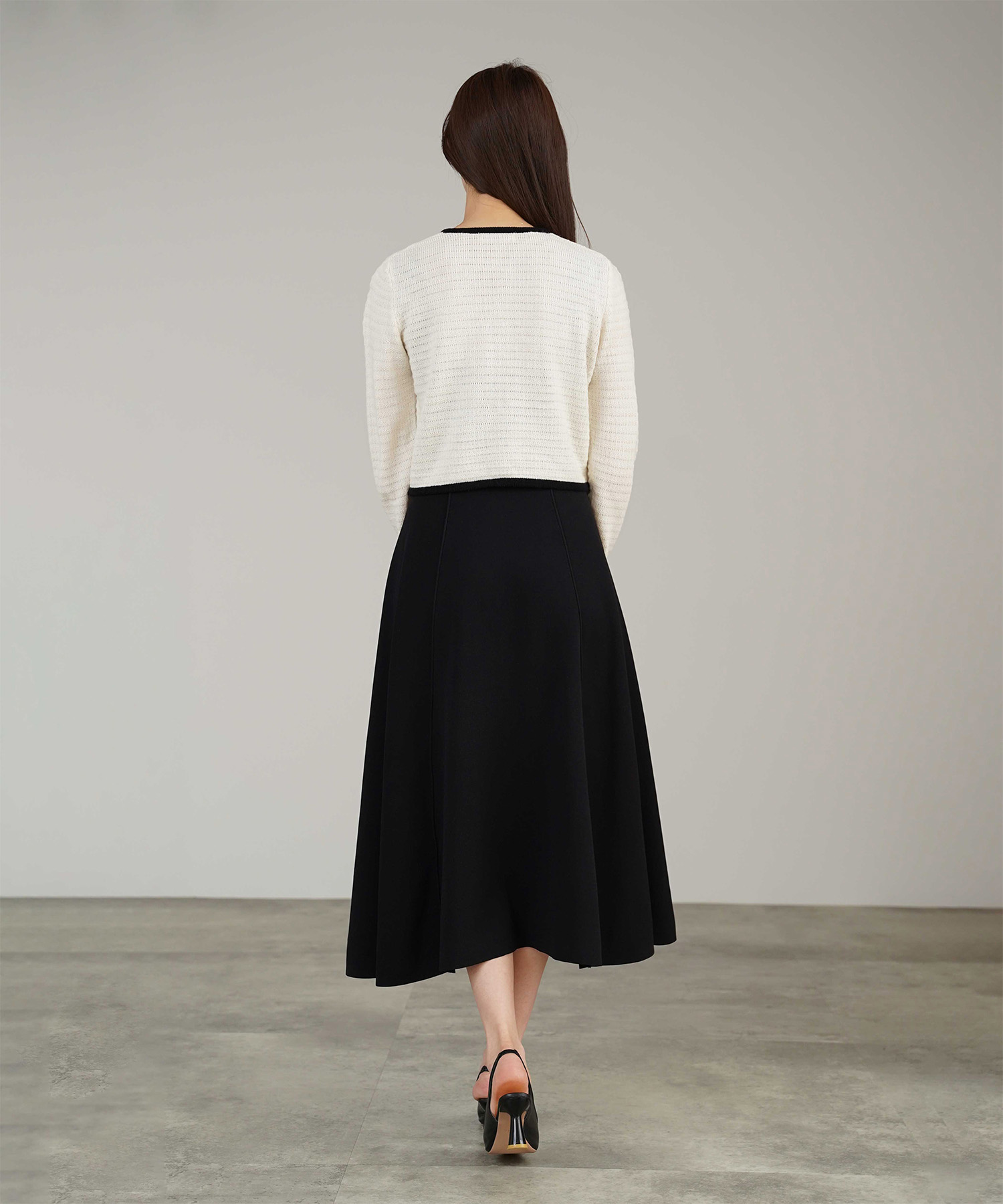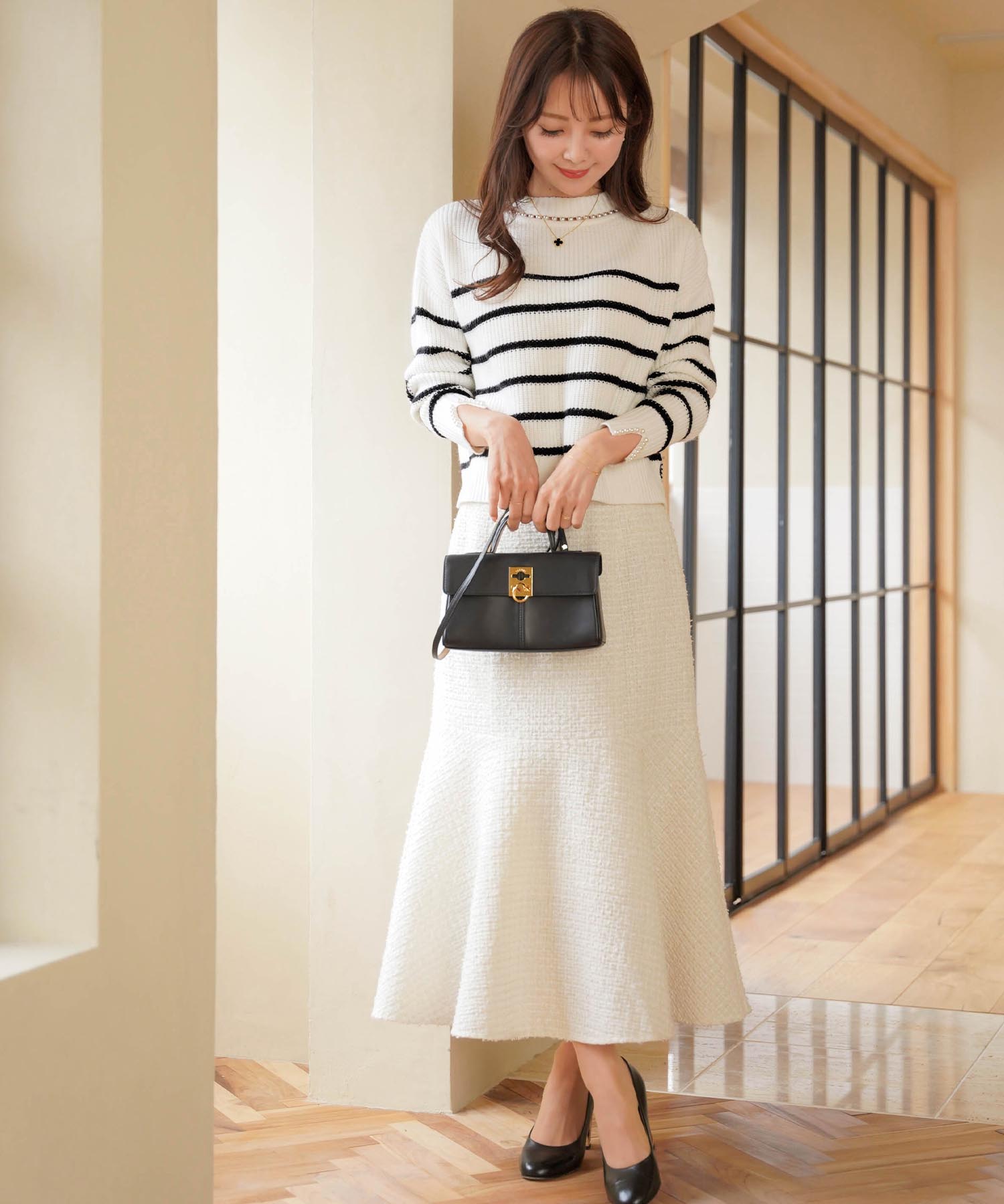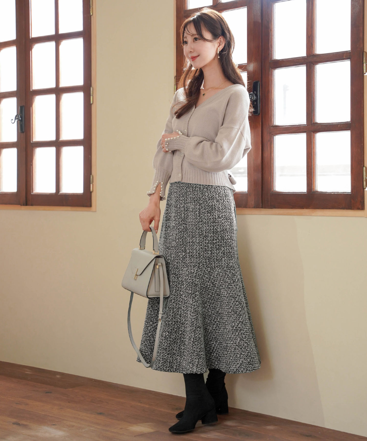 裾に向かって広がるフレアラインが美しいマーメイドスカート。スカートと同系色のハイゲージニットを合わせたワントーンコーデで洗練された着こなしに。