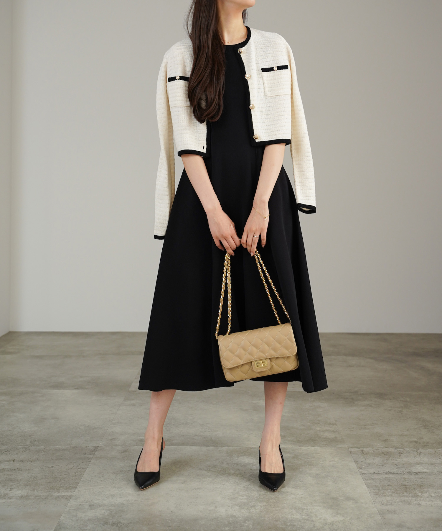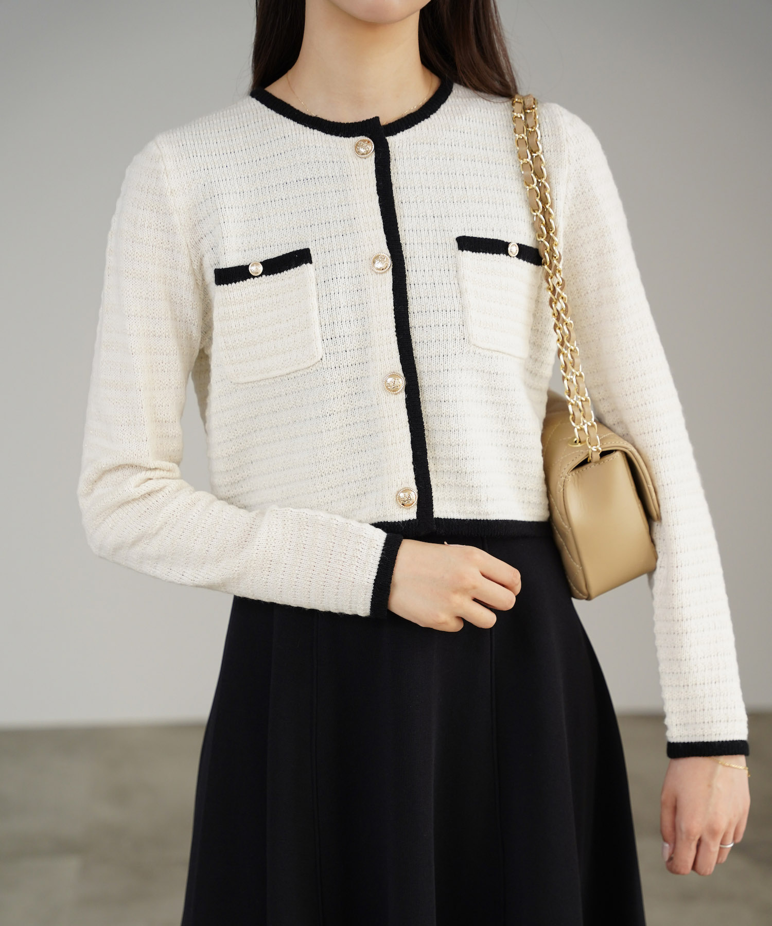 長時間着ても肩が凝りにくいニットジャケットは通勤スタイルの強い味方! ツイードのような見た目ならカジュアルな印象もなく、大人女子のコーディネートにマッチ。ショート丈デザインで合わせるボトムスを限定しないところも頼れるポイント。