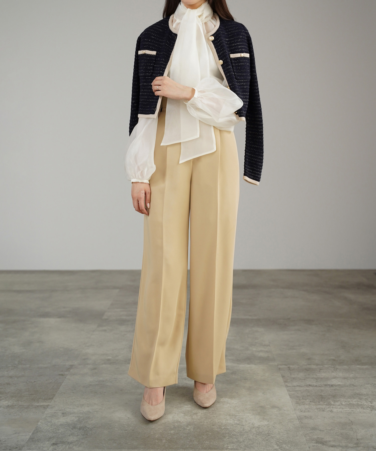 白糸をミックスした爽やかな配色のツイードパンツ。セミワイドのセンタープレス入りデザインが脚をすっきり長く見せてくれます。軽やかなペプラムブラウスと合わせたフェミニンなコーディネートがおすすめ。