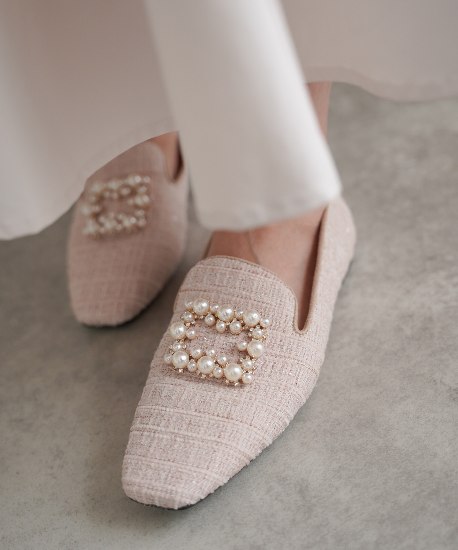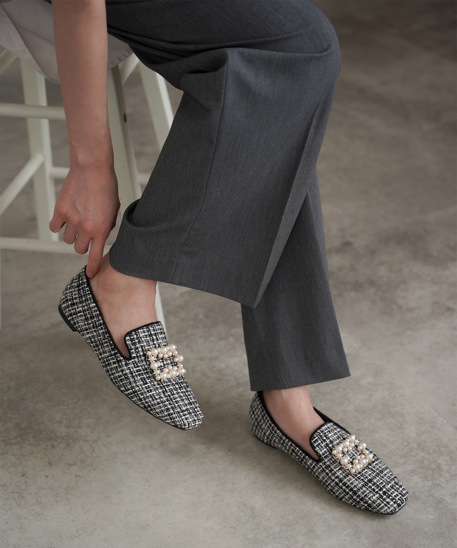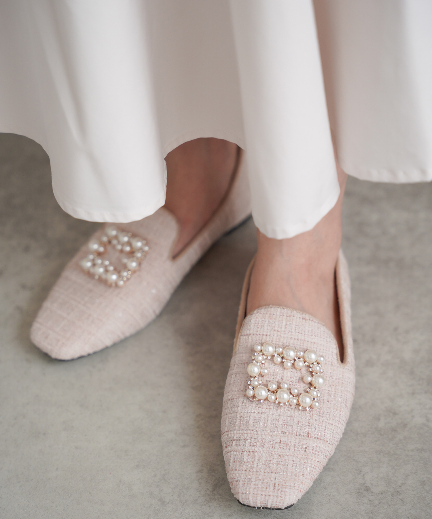 キラッと光るパールビジューが上品なツイード素材のフラットシューズ。クッション性に富んだ中敷き入りで長時間歩いても疲れにくく、仕事でよく歩く方におすすめです。また、先がスクエア形になっているので足の甲が広い方にもおすすめ。