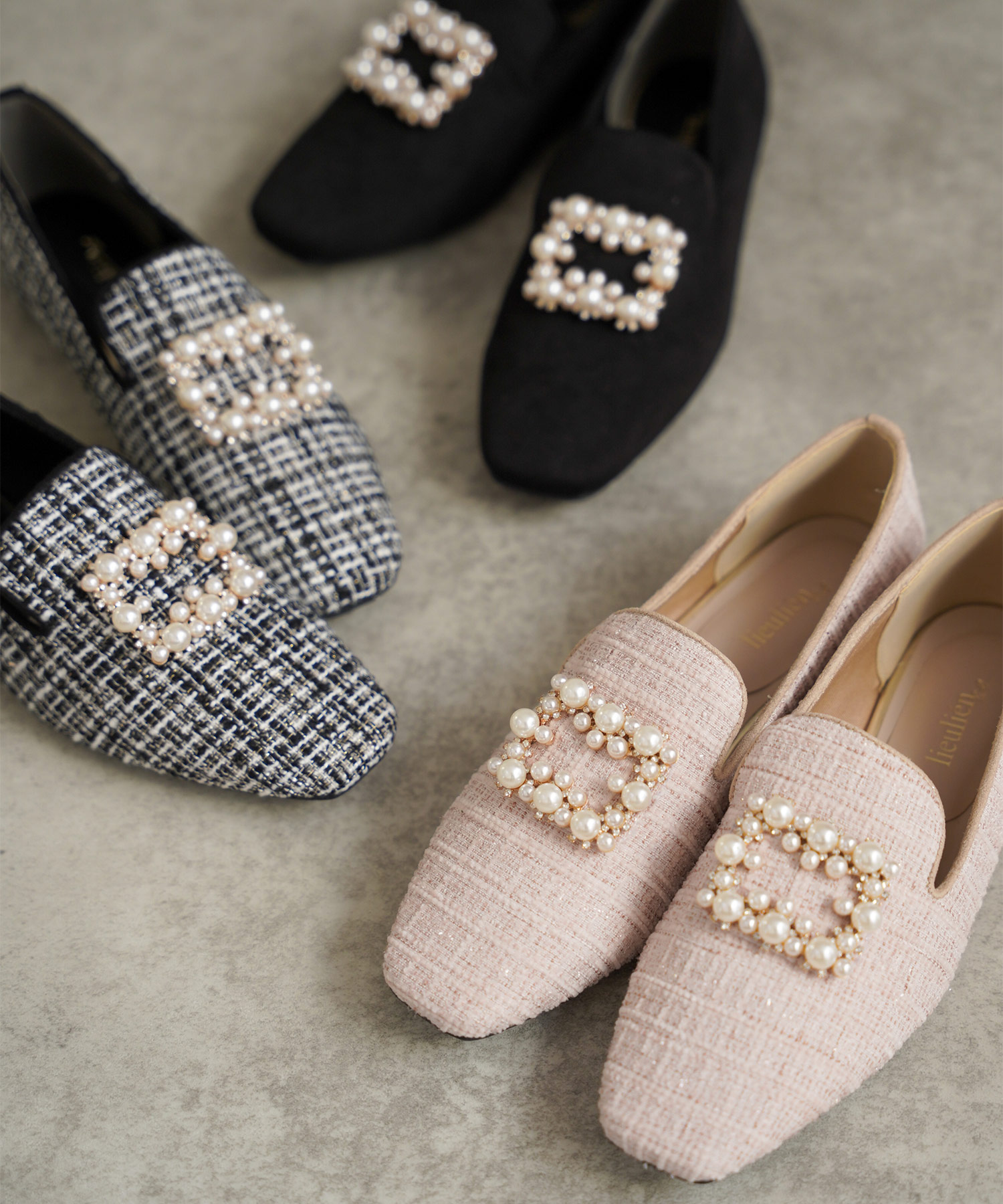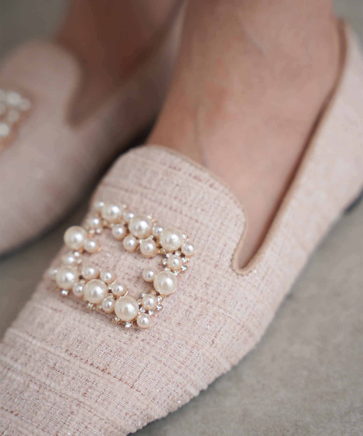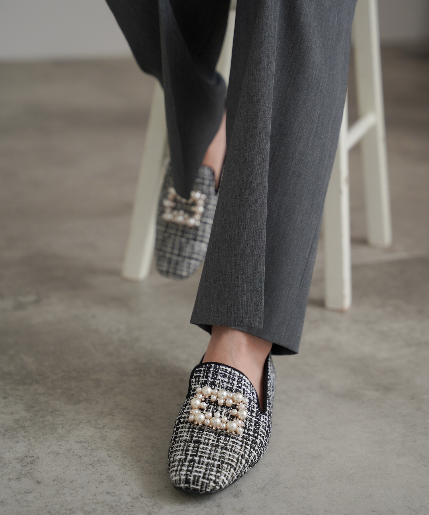 キラッと光るパールビジューが上品なツイード素材のフラットシューズ。クッション性に富んだ中敷き入りで長時間歩いても疲れにくく、仕事でよく歩く方におすすめです。また、先がスクエア形になっているので足の甲が広い方にもおすすめ。
