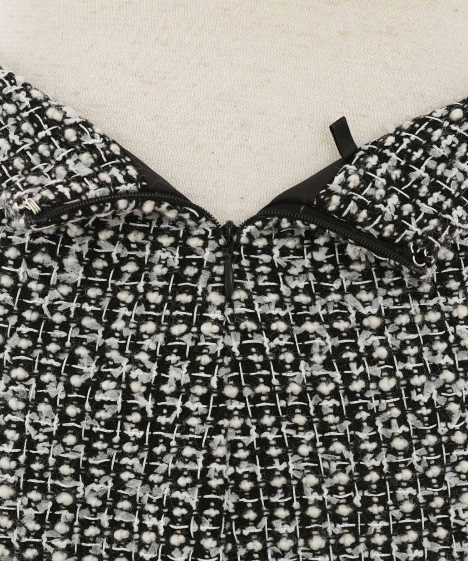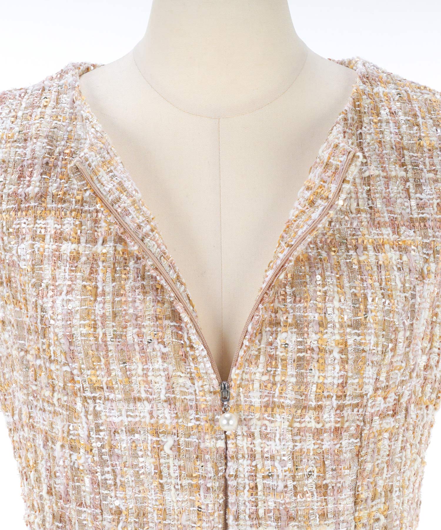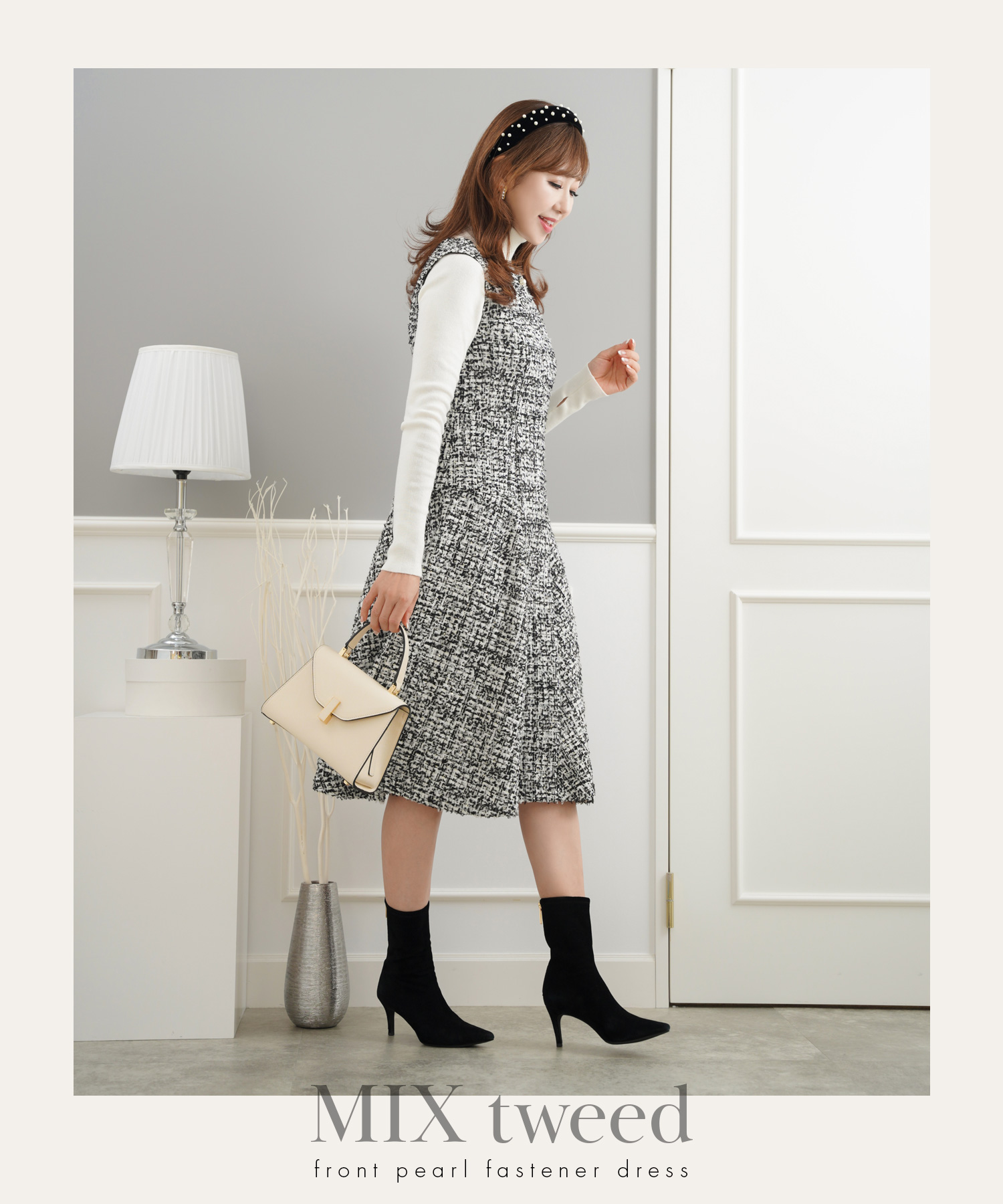 表情豊かなツイードが主役のミックスツイードワンピース。会食やオケージョンなどきちんと感が必須のシーンにぴったりのアイテムです。着脱に便利なフロントファスナーでスライダー部分のパールがさり気ないポイントに。