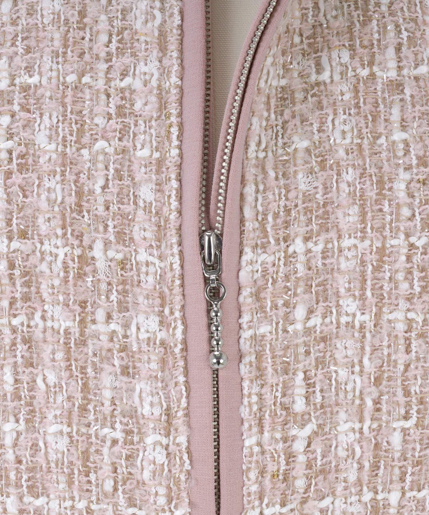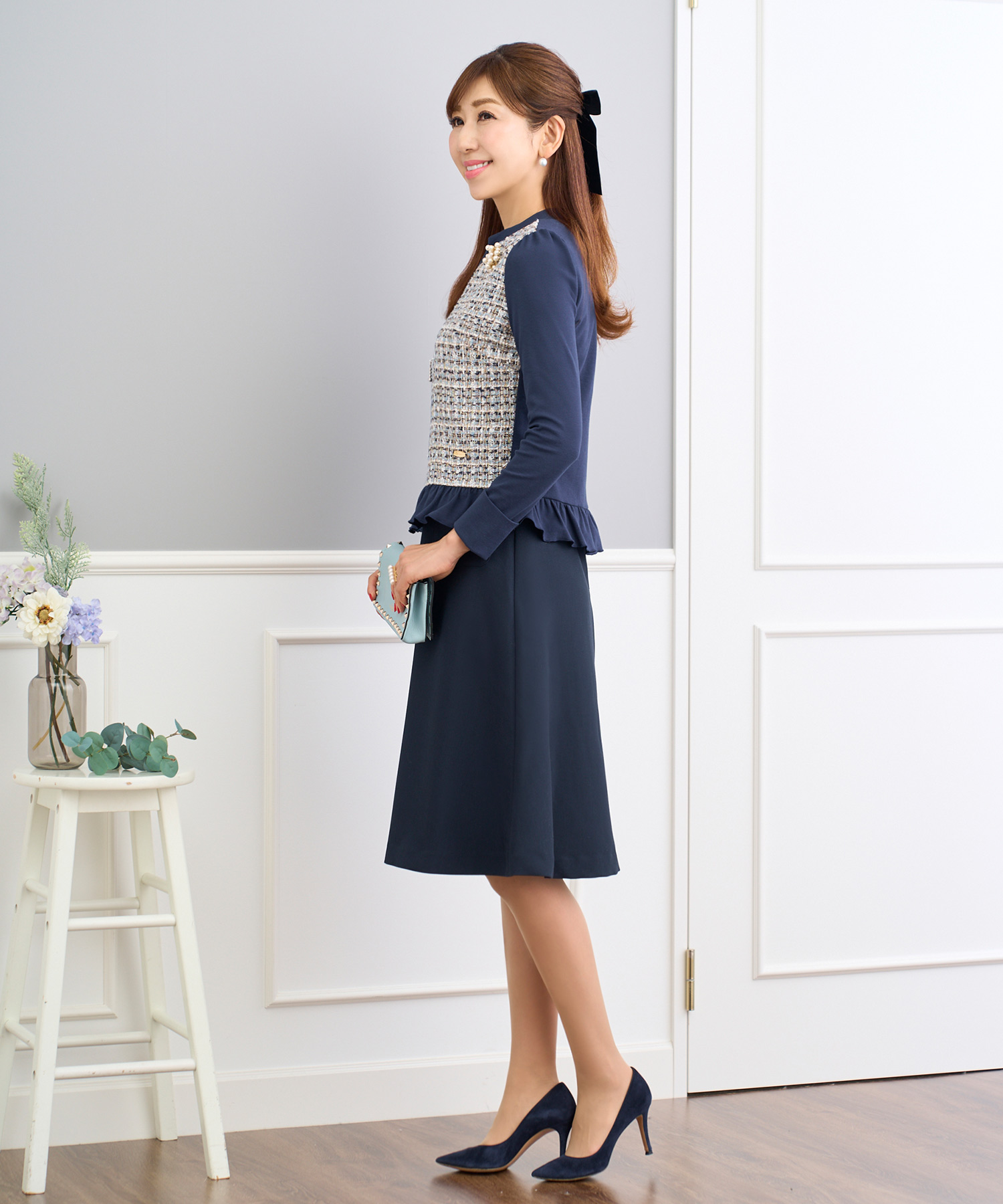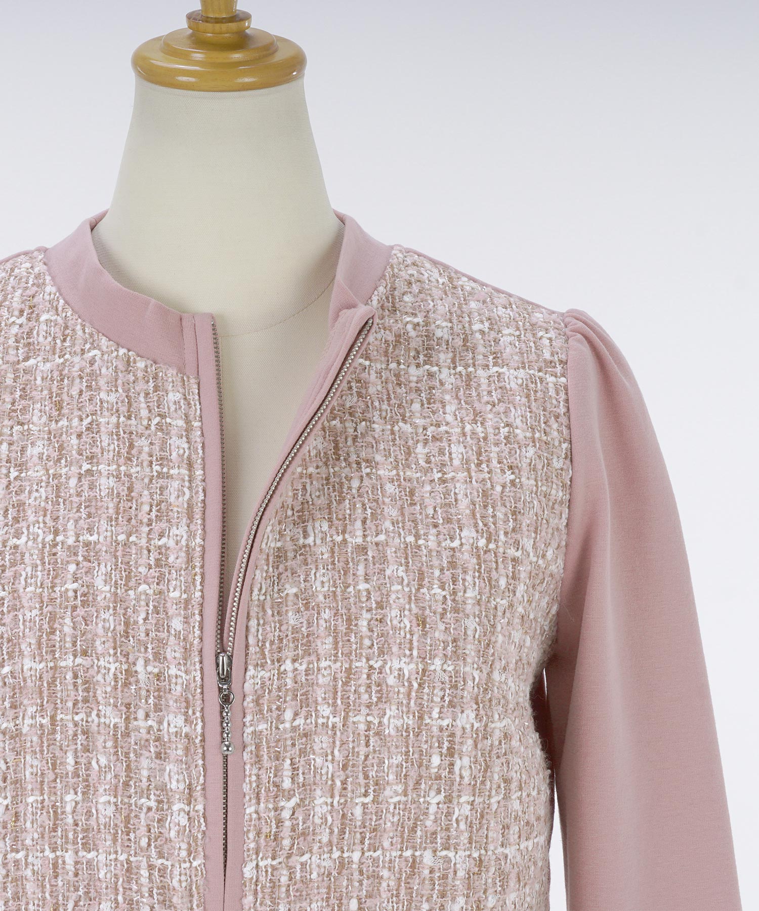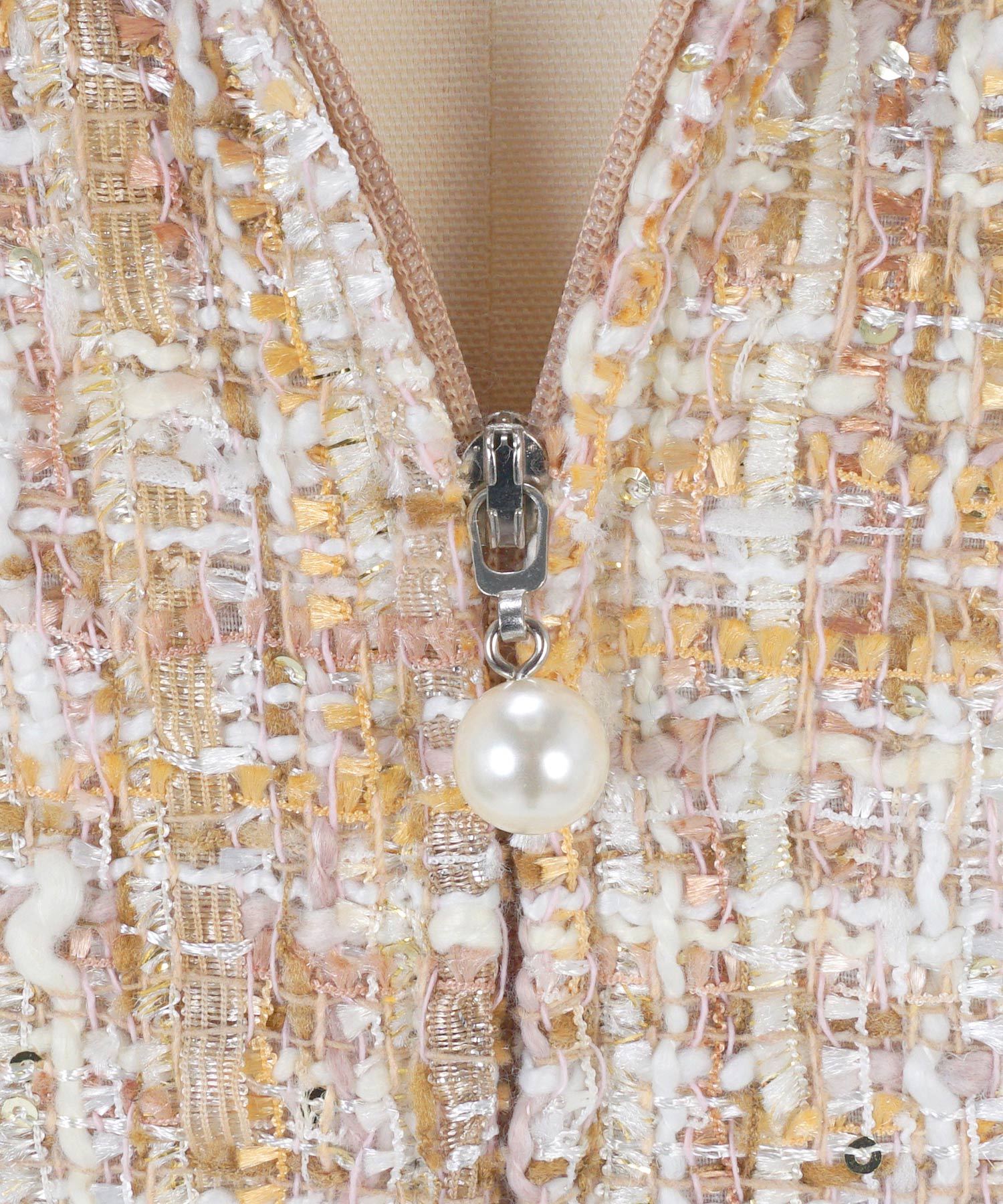 表情豊かなツイードが主役のミックスツイードワンピース。会食やオケージョンなどきちんと感が必須のシーンにぴったりのアイテムです。着脱に便利なフロントファスナーでスライダー部分のパールがさり気ないポイントに。