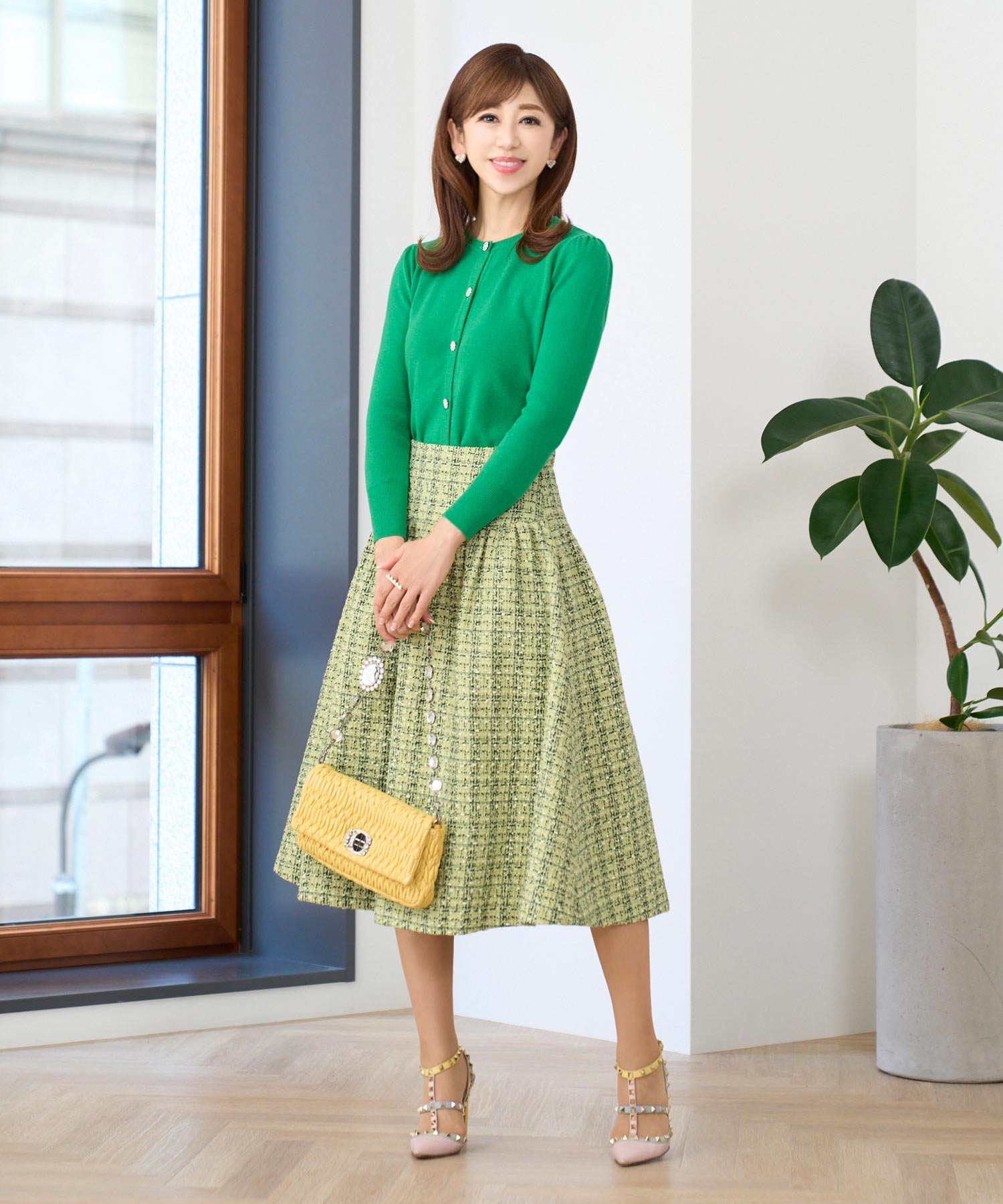 重たい色合いの服装が多くなるこの時期、これくらいカラフルなスカートが新鮮。スカートはハイウエストシルエットで穿くだけで脚長効果を期待できます。フレアシルエットなのでトップスはブラウスや薄手のニットをインしたスタイルがおすすめです。
