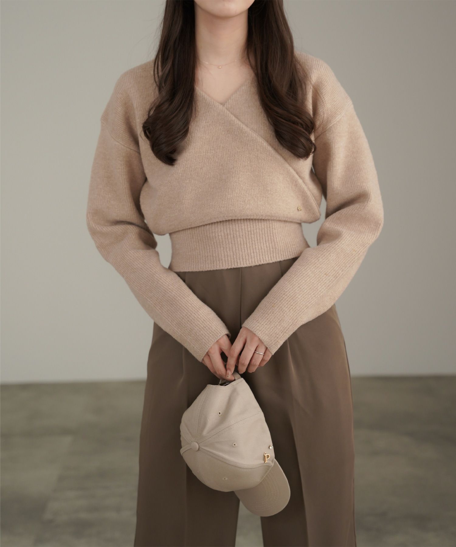 今年トレンドのラメを上品に編み込んだデザインなら仕事はじめのスタイリングに華やかさをプラス。カシュクールディテールで女性らしさを演出し、胸元部分は開き過ぎないよう留をいれています。これにより仕事の日も安心して着用する事が可能です。あえてボトムスをワイドパンツなどカジュアルなアイテムで合わせたギャップの効いたスタイルが◎。
