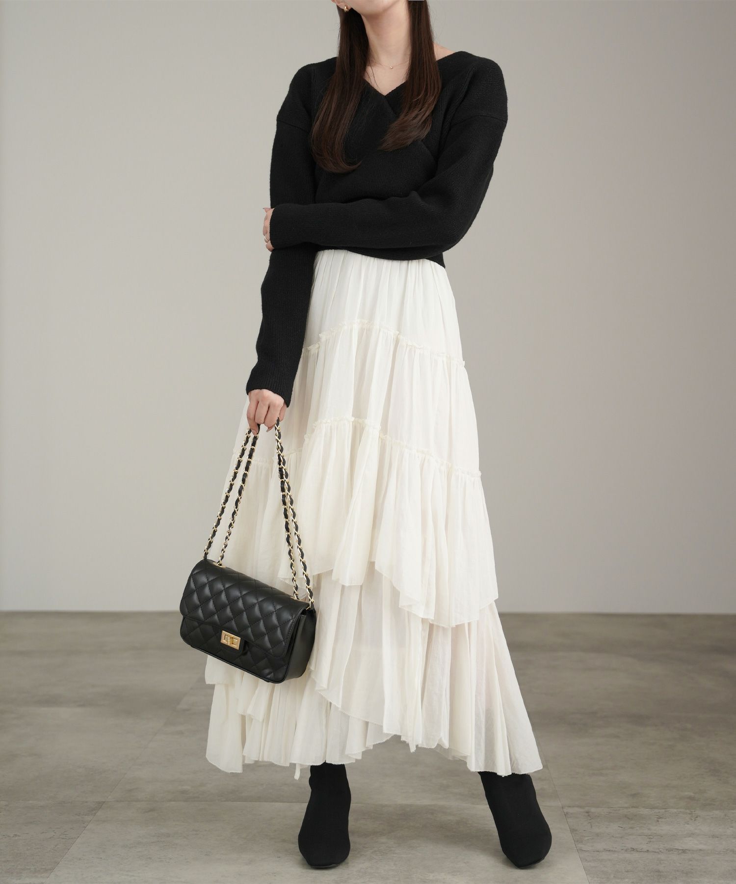 カラフルな糸や太い糸が混ざったネップツイード生地のマーメイドスカートが冬らしい華やかコーデを牽引。腰回りはすっきりと、裾にかけて広がるフレアラインで柔らかな女性らしいシルエットに仕上げました。またハイウエストデザインで脚長効果も期待できます。