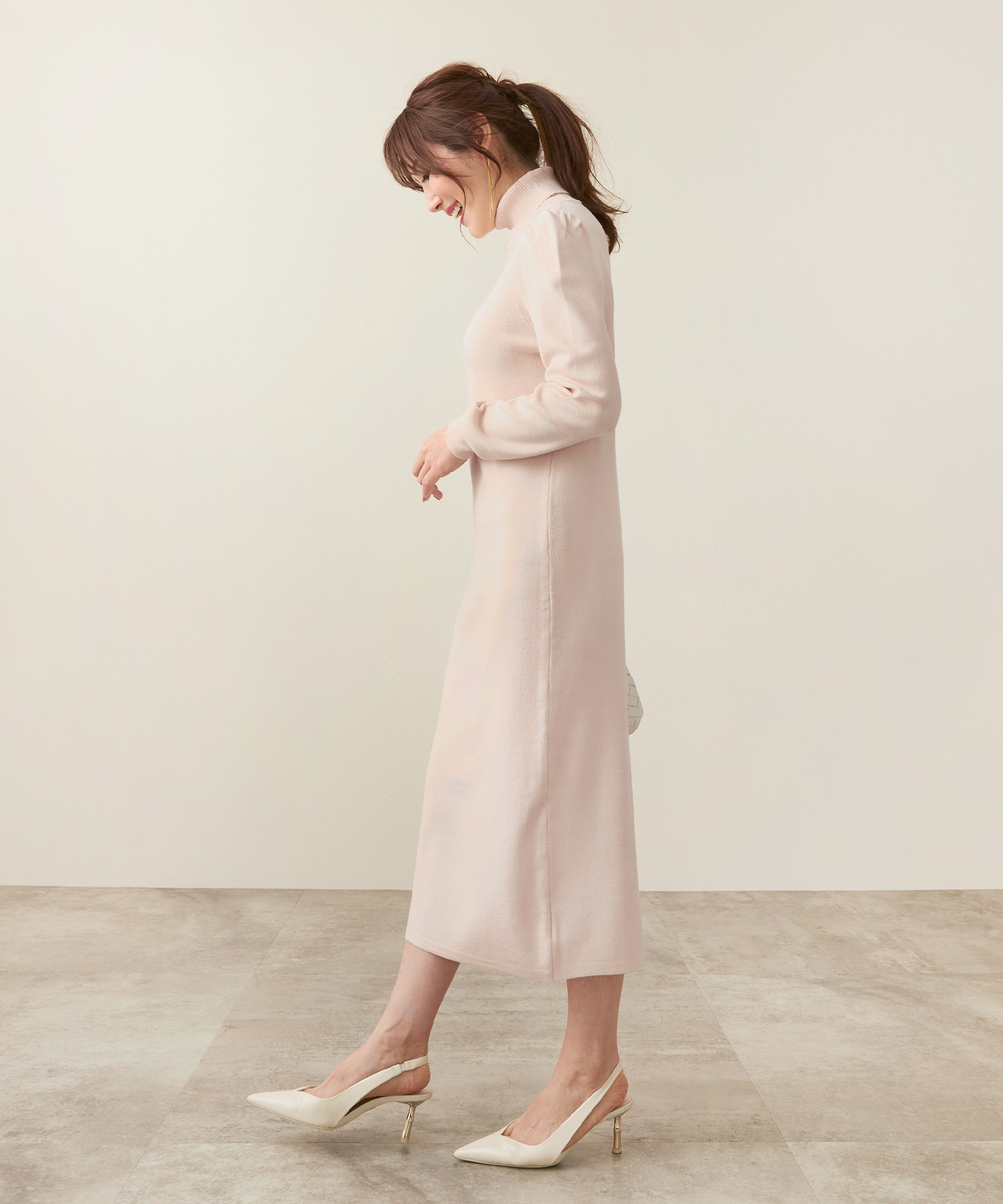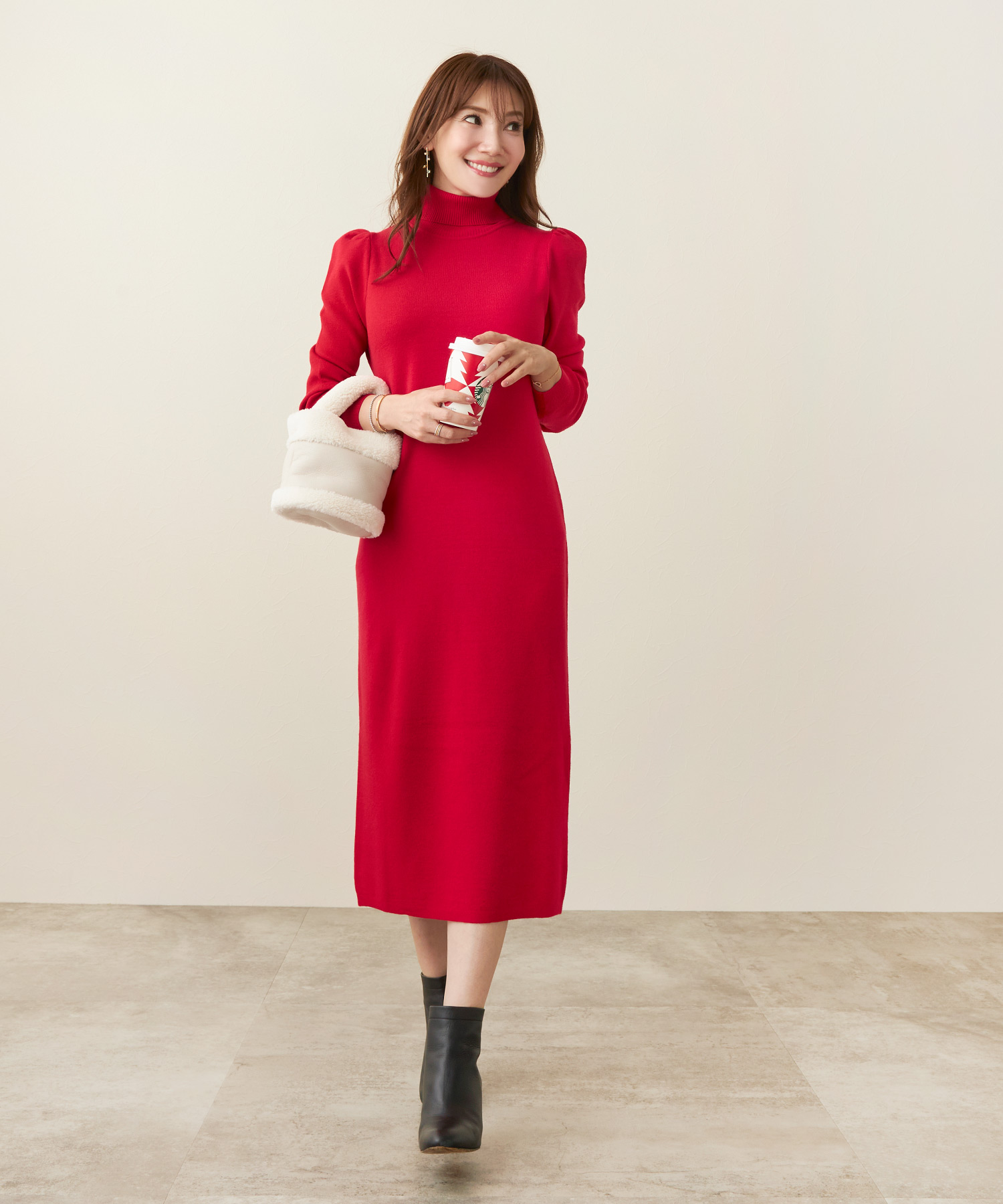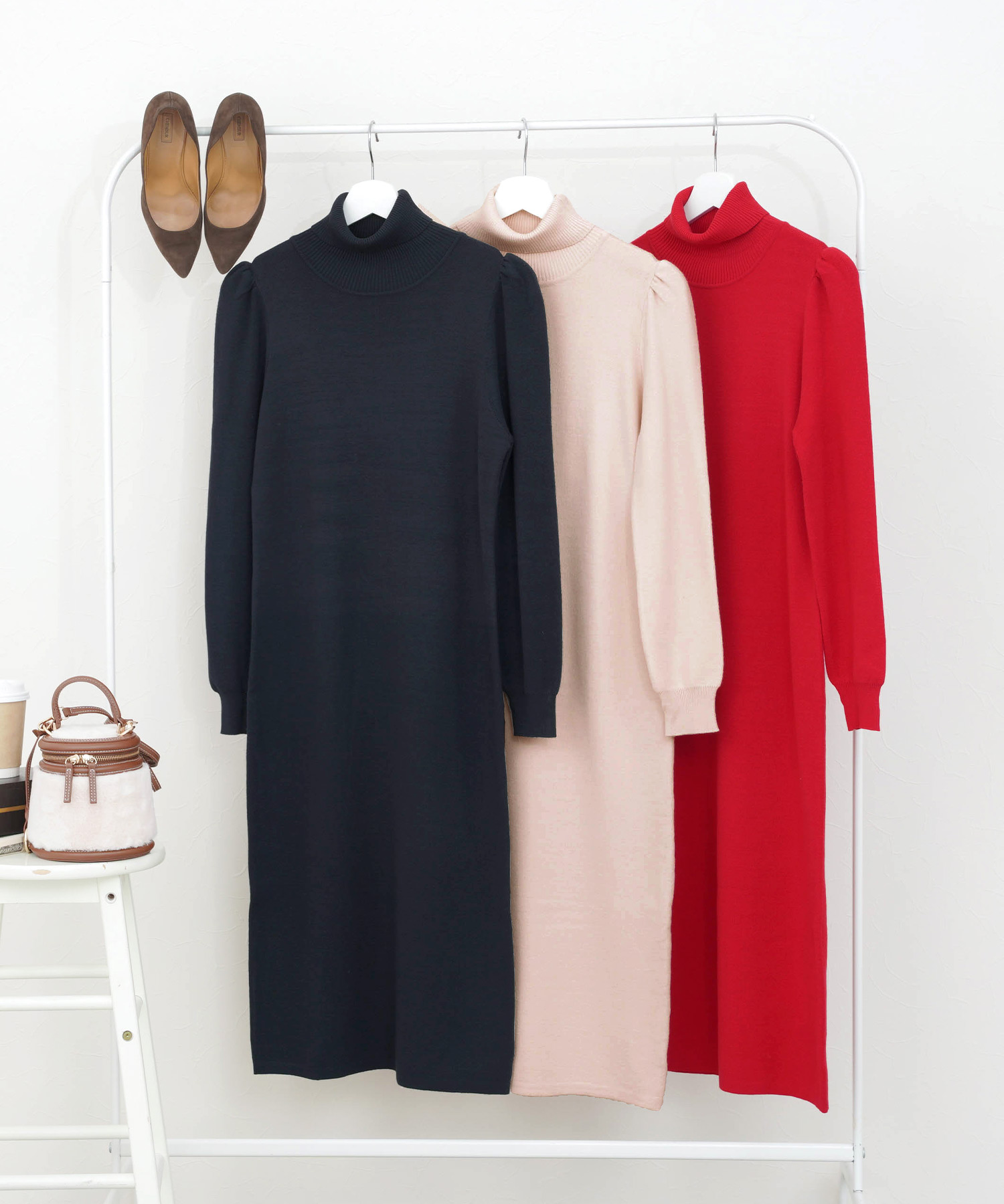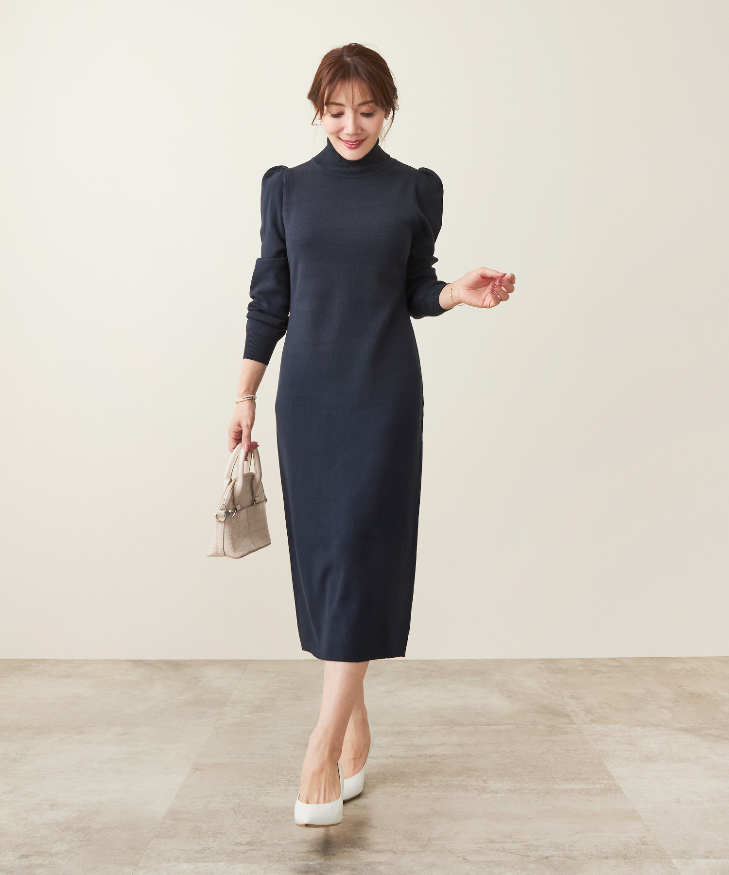 伸縮性のあるニットワンピースなら肩に力が入り過ぎず仕事はじめの服装にぴったり。シンプルな形ながら袖にギャザーを入れることでフェミニンな印象に仕上げ、着るだけでさらっとおしゃれに決まります。首元はタートルネック仕様であたたかさとすっきり感アップ。