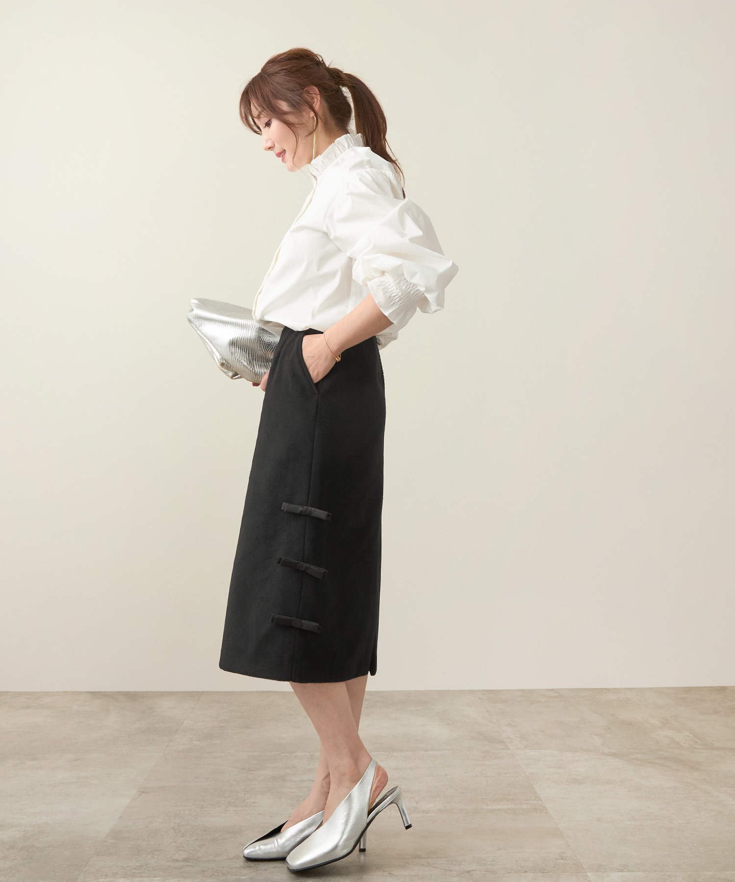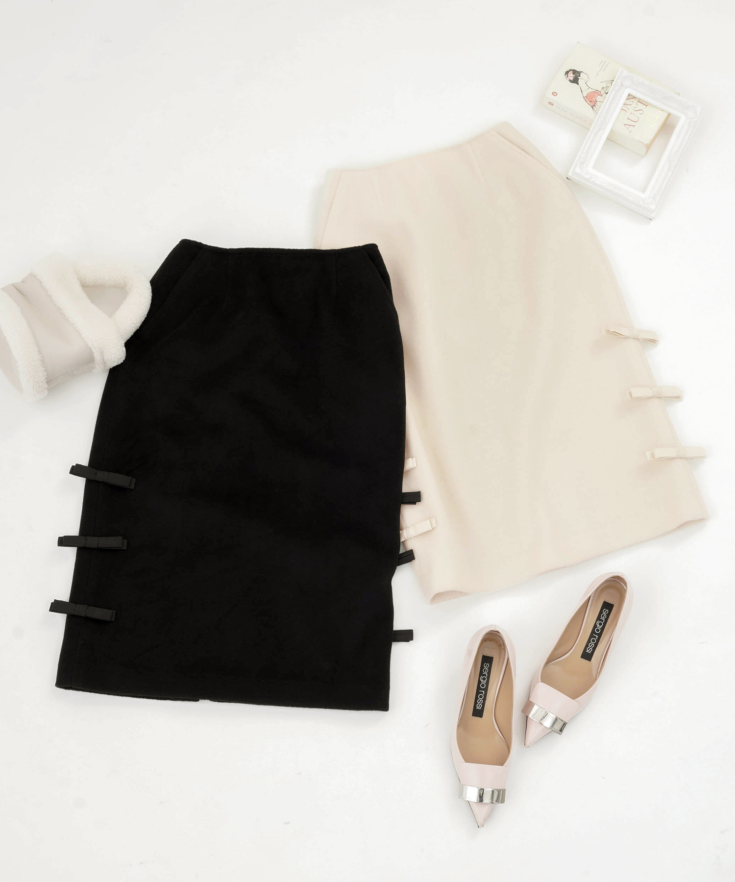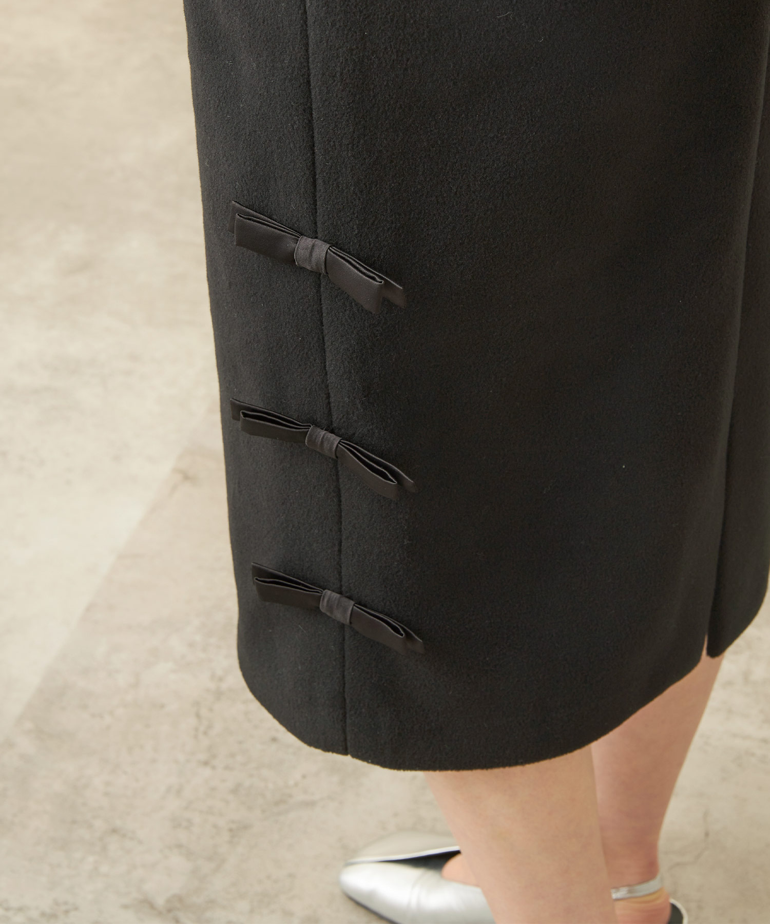 スカートのサイドにマットなサテン素材のリボンをあしらった大人の甘さが魅力のタイトスカート。起毛感のあるソフトな素材を使用しているので、冷え込む年明けもぬくもりをキープしてくれます。バックスリット入りで歩きやすさも◎。