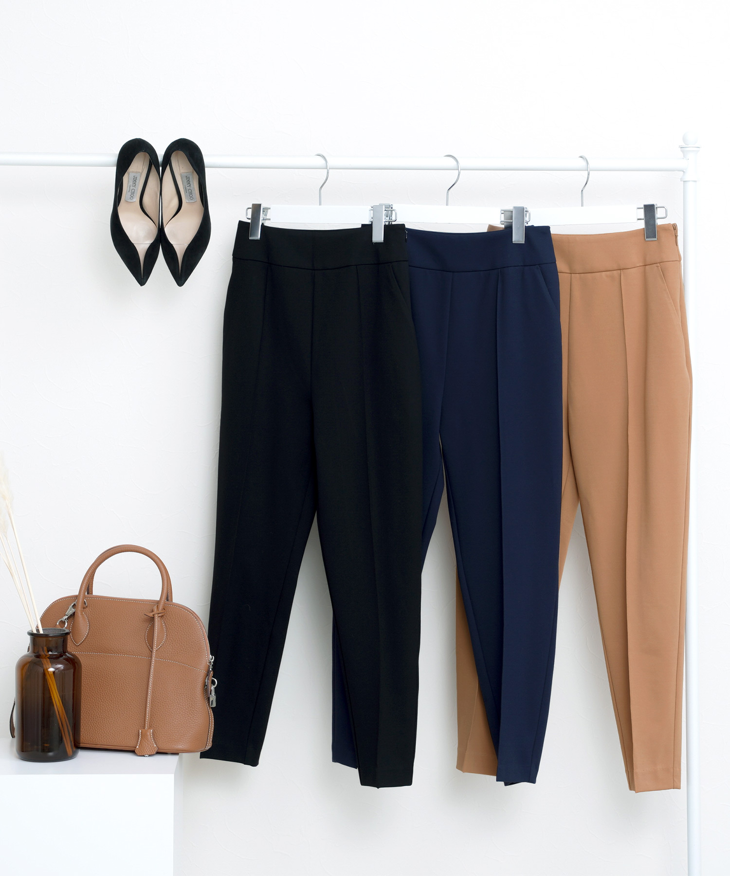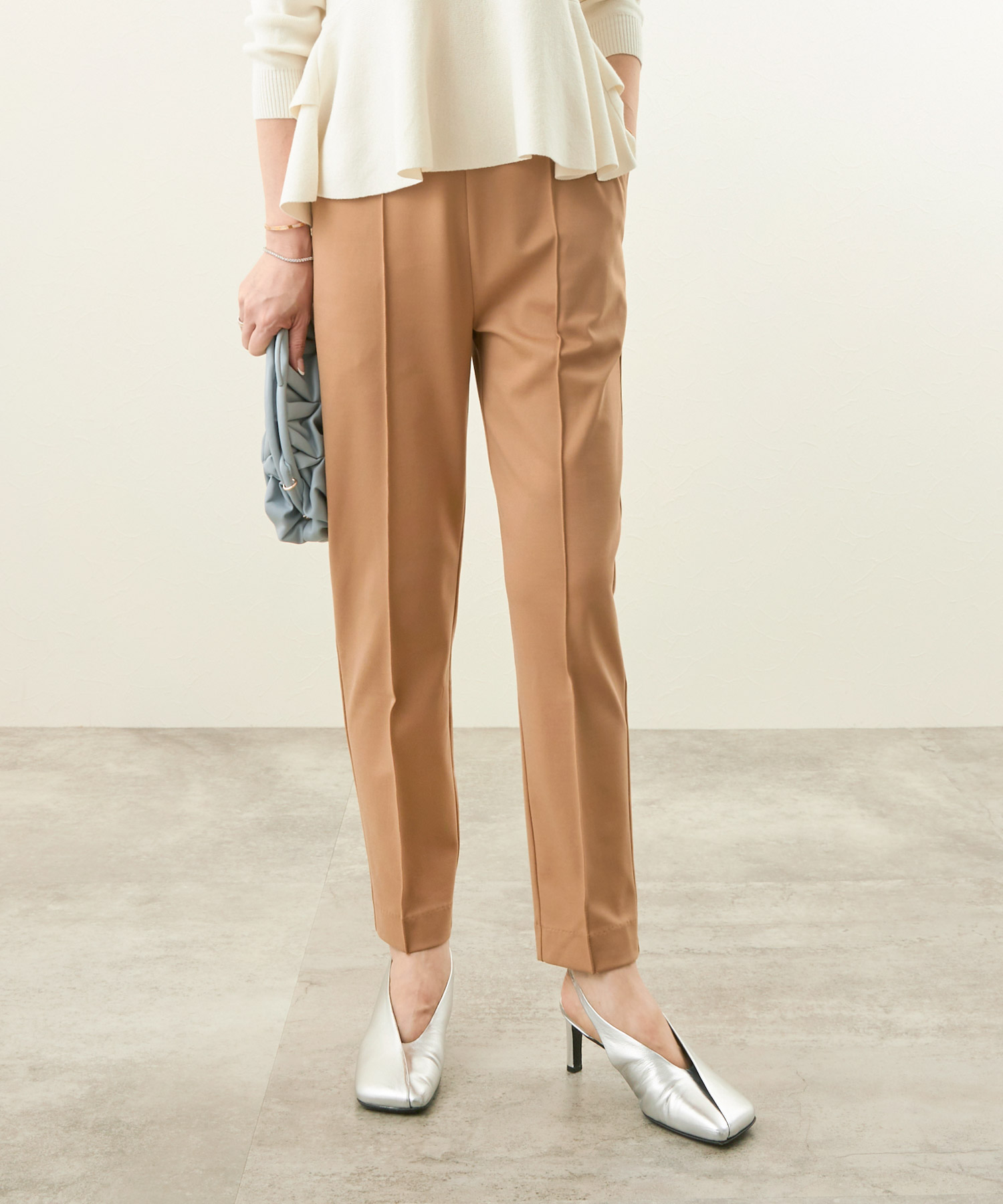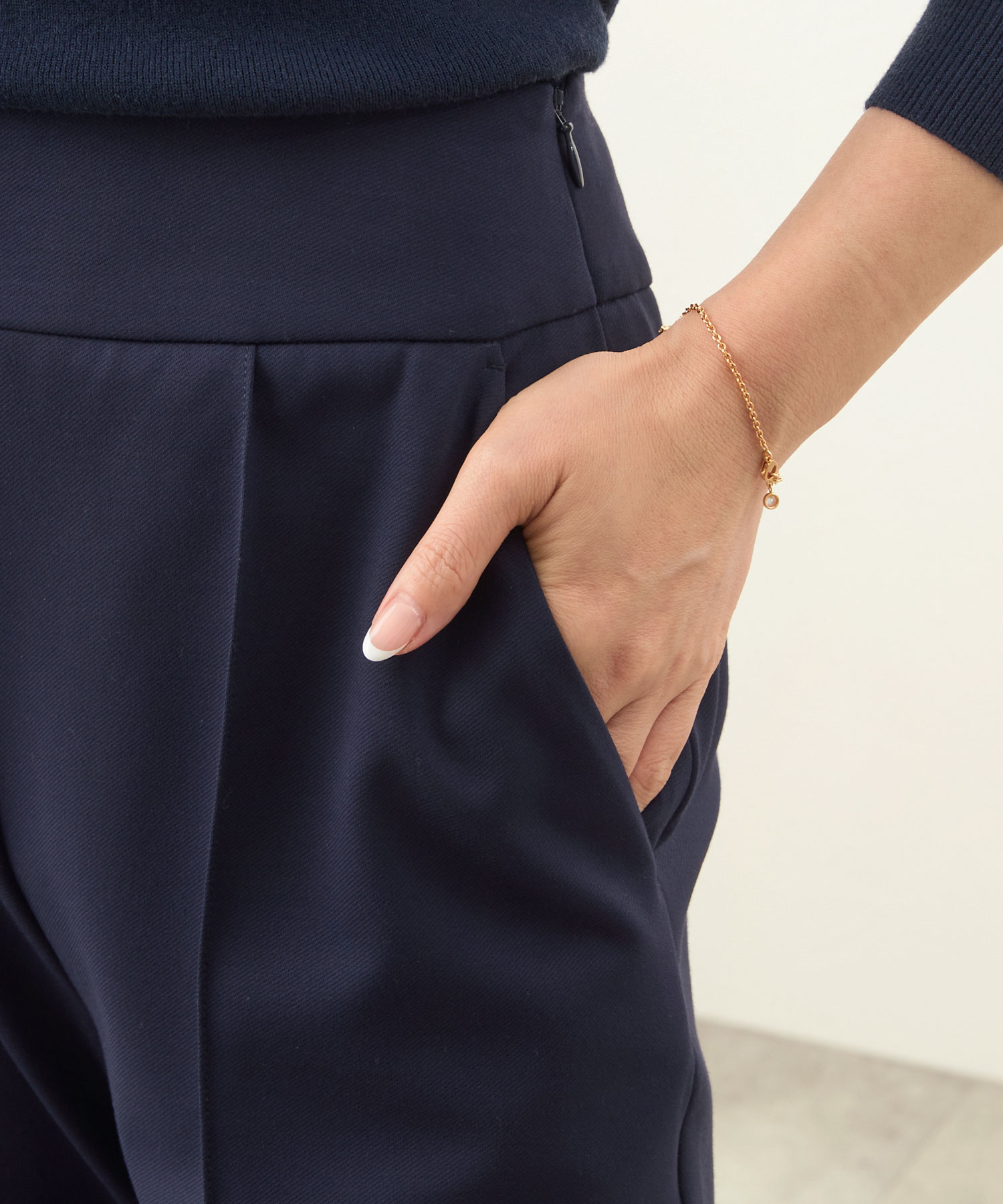 ピンタックが入ったセンタープレスパンツで脚長効果抜群の一本。脚にぴたっとくっつく形ではなく絶妙にゆるさがあるので窮屈感なく穿きこなせます。厚すぎない中肉素材で春秋冬の3シーズン活躍してくれるボトムスです。
