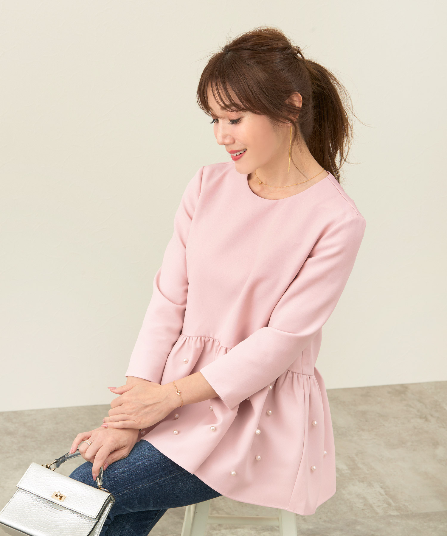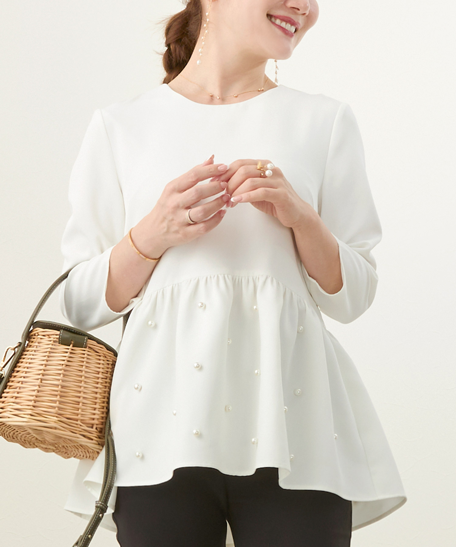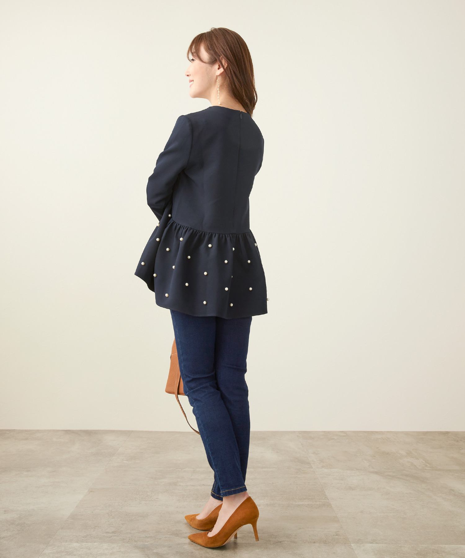 ペプラムの裾部分にパールをあしらったエレガントで女性らしいデザイン。着丈は後ろをやや長めに設定し、張りのある素材で腰回りをふんわりとカバーします。細身のパンツと合わせたスタイリングですっきり合わせるのがおすすめ。