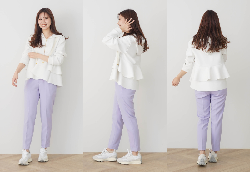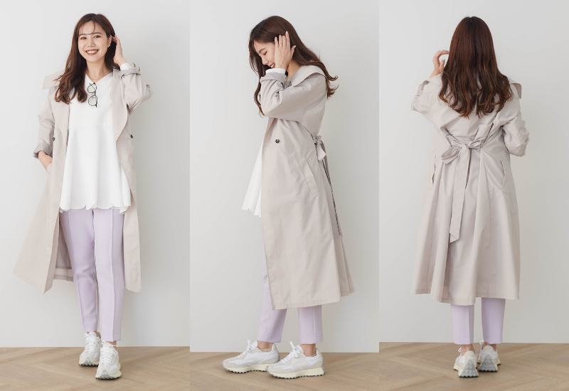 まだまだ気温差の激しいこの時期、防寒対策にもなるロング丈のトレンチコートを使って直線的なラインを強調。ボリューム感のあるリラクシーなデザインは、骨格ストレートの方が苦手とするシルエットですが、ベルトを後ろでキュッと締めることでほっそりしたラインをアピールできます。さらにセンタープレス入りのストレートパンツを取り入れて着痩せ効果を後押し!ラベンダーカラーをアクセントにした春色通勤コーデの完成です♪