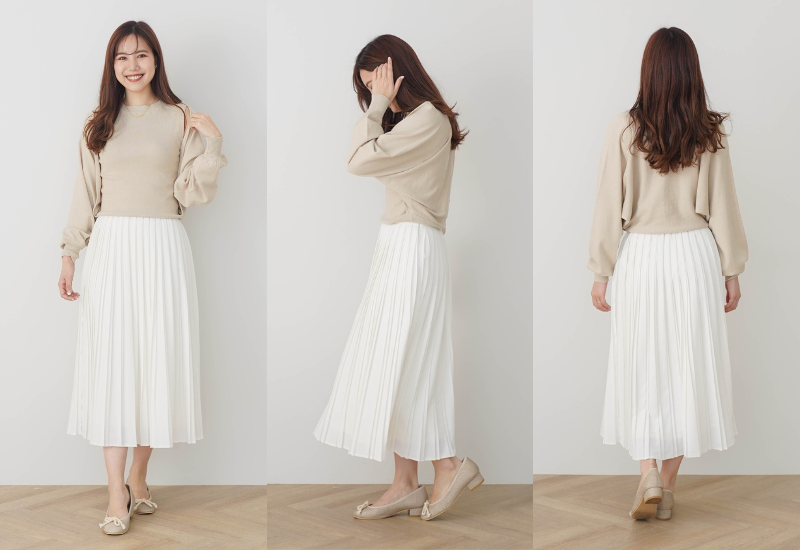 縦ラインを強調するプリーツスカートは骨ストさん鉄板アイテム。キュッと引き締まった足首が見えるミモレ丈を選ぶことでさらにスタイルアップに繋がります。トップスのニットはノースリーブニットとカーディガンのセットアイテムのように見えて、実はドッキングアイテム。適度にゆるいシルエットで骨ストさんの体型にちょうどよくフィットします。着丈はショート丈なのでボトムスとのバランスもグッド!デートなど清楚でかわいく決めたい日におすすめです。