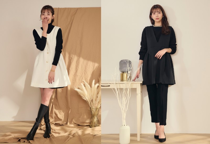 マンネリコーデにワンピースにもジレにもなる2wayアイテムをオン。シンプルなトップスやボトムスを着映えさせるならボタンが付いたデザインを前に、きちんと感のあるファッションでまとめるならVネックの方を前にすることで異なる雰囲気のスタイリングに仕上がります。