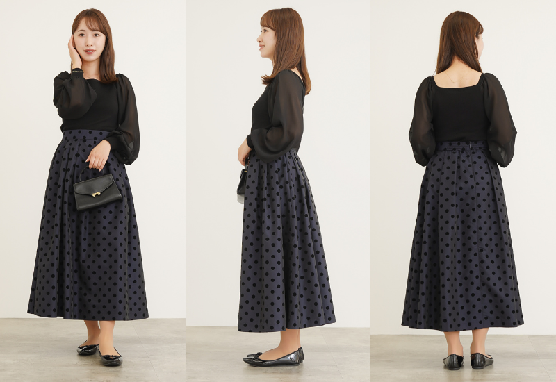 ディナースタイルは袖に透け感のある黒のブラウスを合わせてシックでエレガントに決めて。やわらかいシフォン素材なら黒でも軽やかに見え女性らしさを演出してくれます。バッグは小ぶりのワンハンドルタイプをチョイス。大きめデザインよりミニサイズの方が繊細な骨格ウェーブさんの体型にもマッチしやすく、上品に仕上がります。