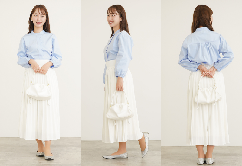 シンプルな通勤コーデをプリーツスカートで華やかに♡ 腰位置が高く見えるハイウエストデザインですっきり見えるところも見逃せないポイントです。足元は丸みのあるバレエシューズをチョイスして女性らしさを後押し!