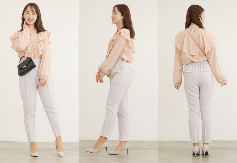 着席時間の長い女子会に顔周りを華やかに見せられるフリルブラウスはマストアイテム。華奢な上半身をカバーする効果もあるので取り入れない手はありません! ボトムスはパンツを選んで甘さを中和。骨格ウェーブさんの得意なテーパード形に加え、センタープレス入りで脚の長さをさらに強調してくれます。