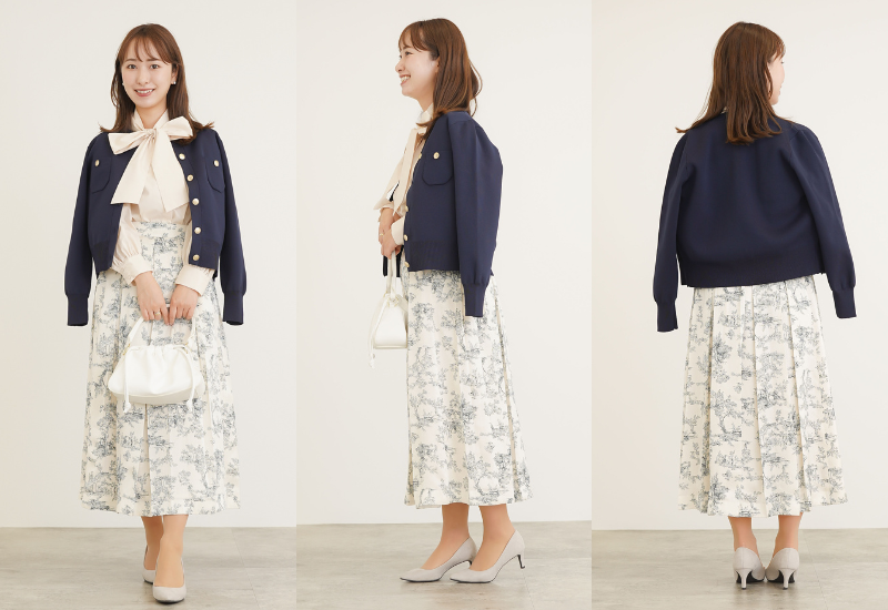 デートスタイルの鉄板・スカートコーデはトレンドのボウタイブラウスとスタイリングして女性らしく着地。トップスとスカートを淡い色でまとめた分、濃色のカーデを肩掛けして単調な着こなしのアクセントにすると◎。また、視線が上がって見えるので下半身重心の骨格ウェーブさんにおすすめのテクニックです。