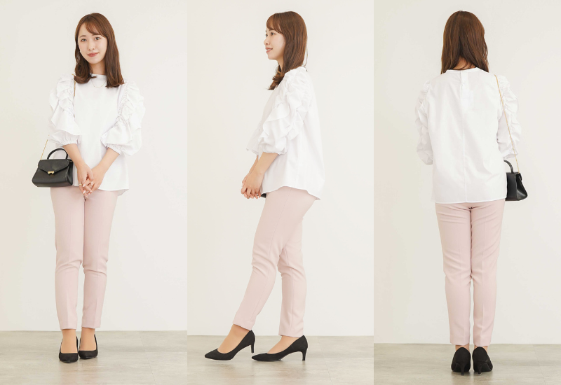 リモートワークの日はカフェで集中してお仕事。とはいえ、急なオンラインミーティングに備えラフ過ぎる着こなしはNGです。袖フリルのブラウスならパソコンの画面上で”映え”を狙えるうえ、レフ板効果のある白で肌がきれいに見えるところも高ポイント。華奢な肩回りもカバーしてくれるので積極的に取り入れると◎。