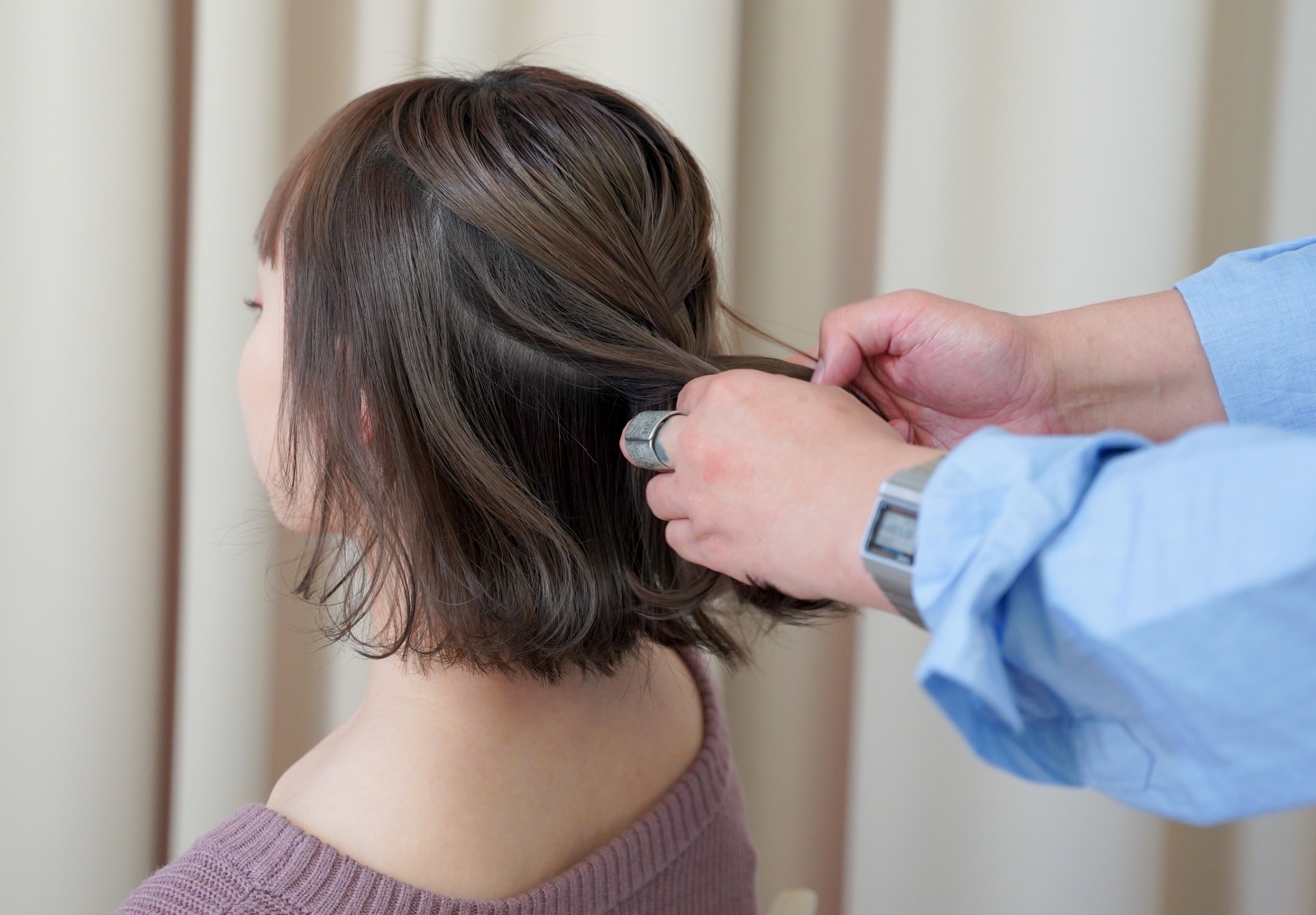 結ばず下ろしている部分は、外はね+ツイスト巻きで動きをつけます。