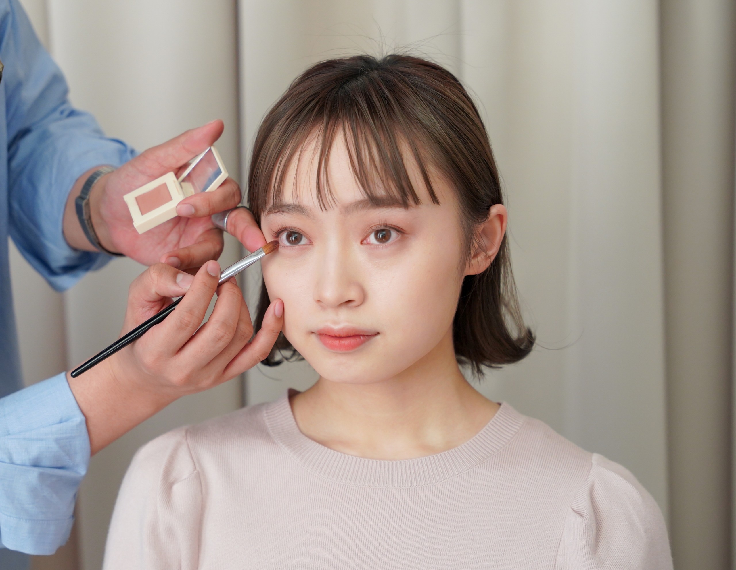 馴染みの良いベージュ系カラーをアイホール、下瞼にのせます。
