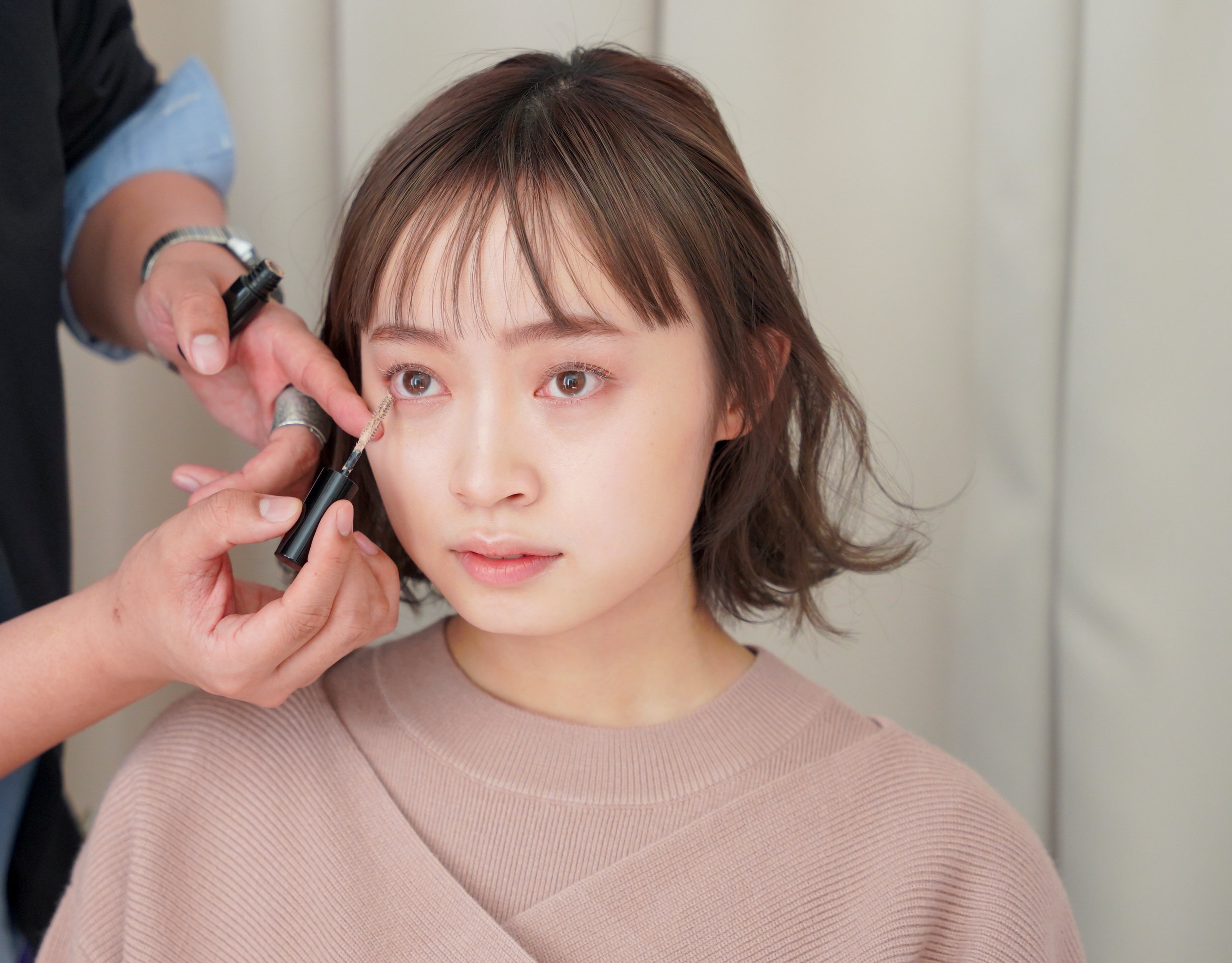 ベースメイクを施し、ヘアは軽くコテでカールをつけて巻いています。