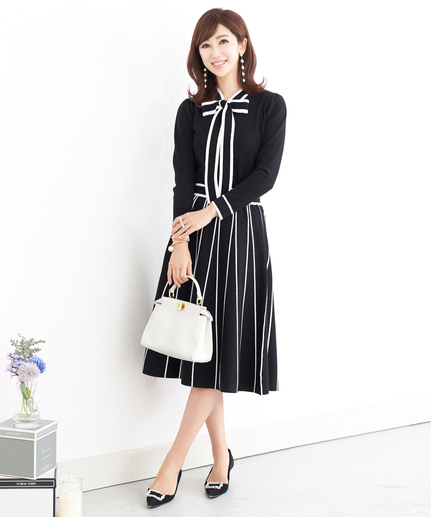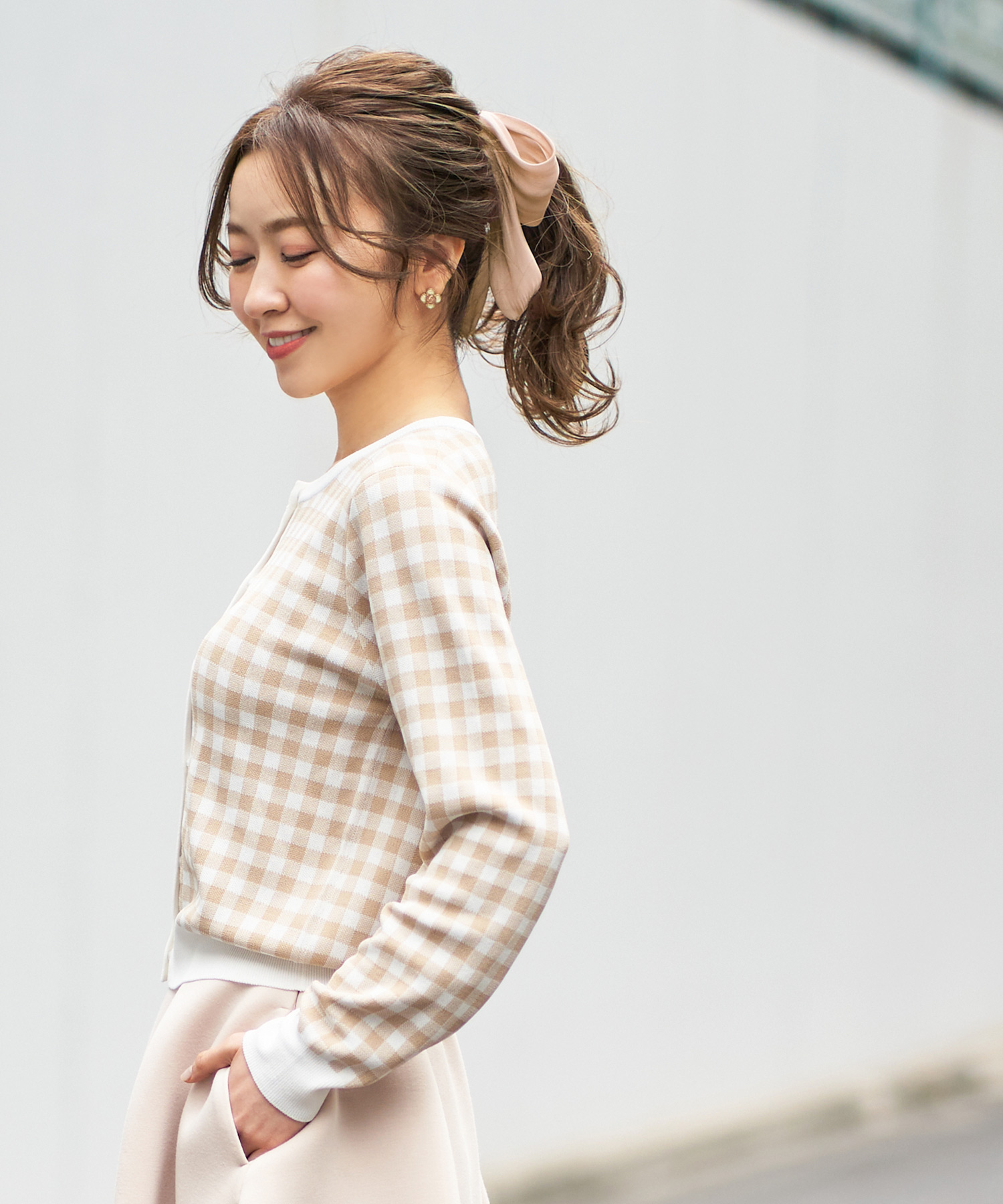 ニット素材のリボンは横に広がるボリュームが少ないのでリボンデザインも大人らしい印象に。