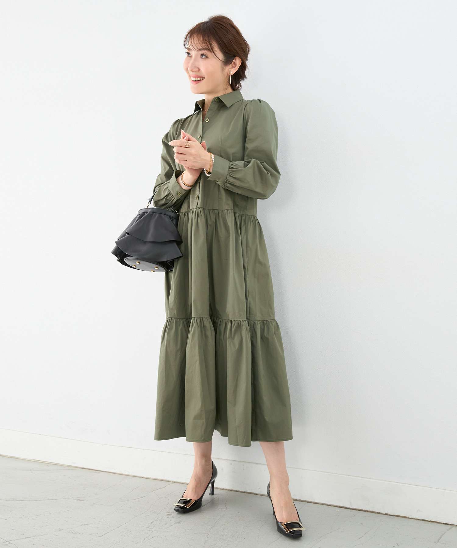スカート部分のティアードデザインが大人フェミニンなムードを高めるシャツワンピース。