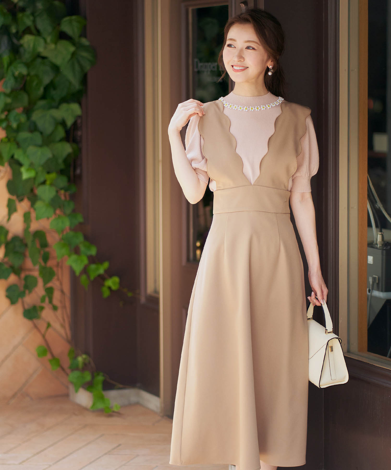 肩紐のスカラップデザインがクラシカルムード漂うジャンパースカート。