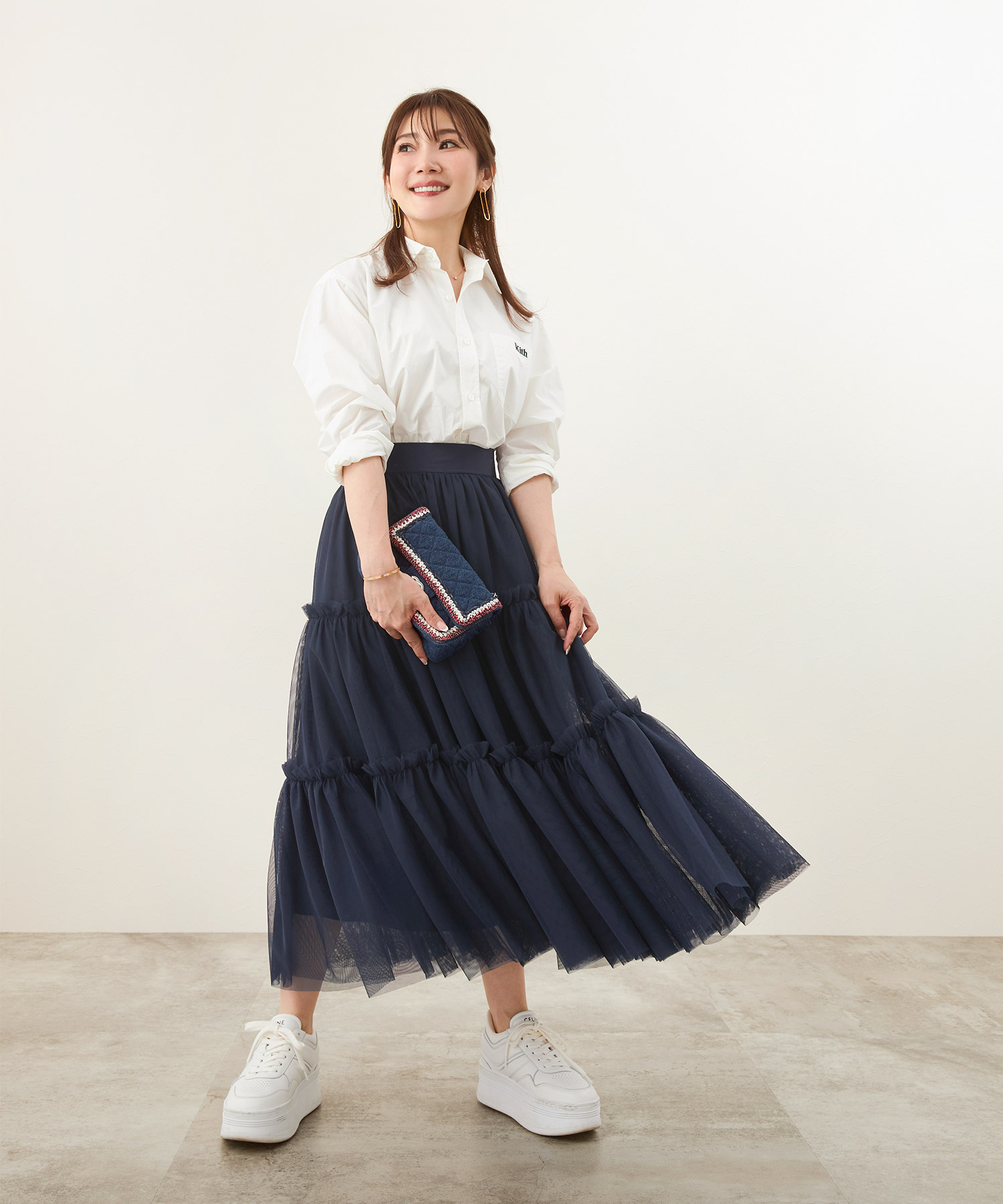 いつものコーデに置き換えるだけで抜け感をあたえてくれるスカート。ボリューミーなシルエットをティアードデザインに落とし込むことでメリハリをプラスしてくれます。