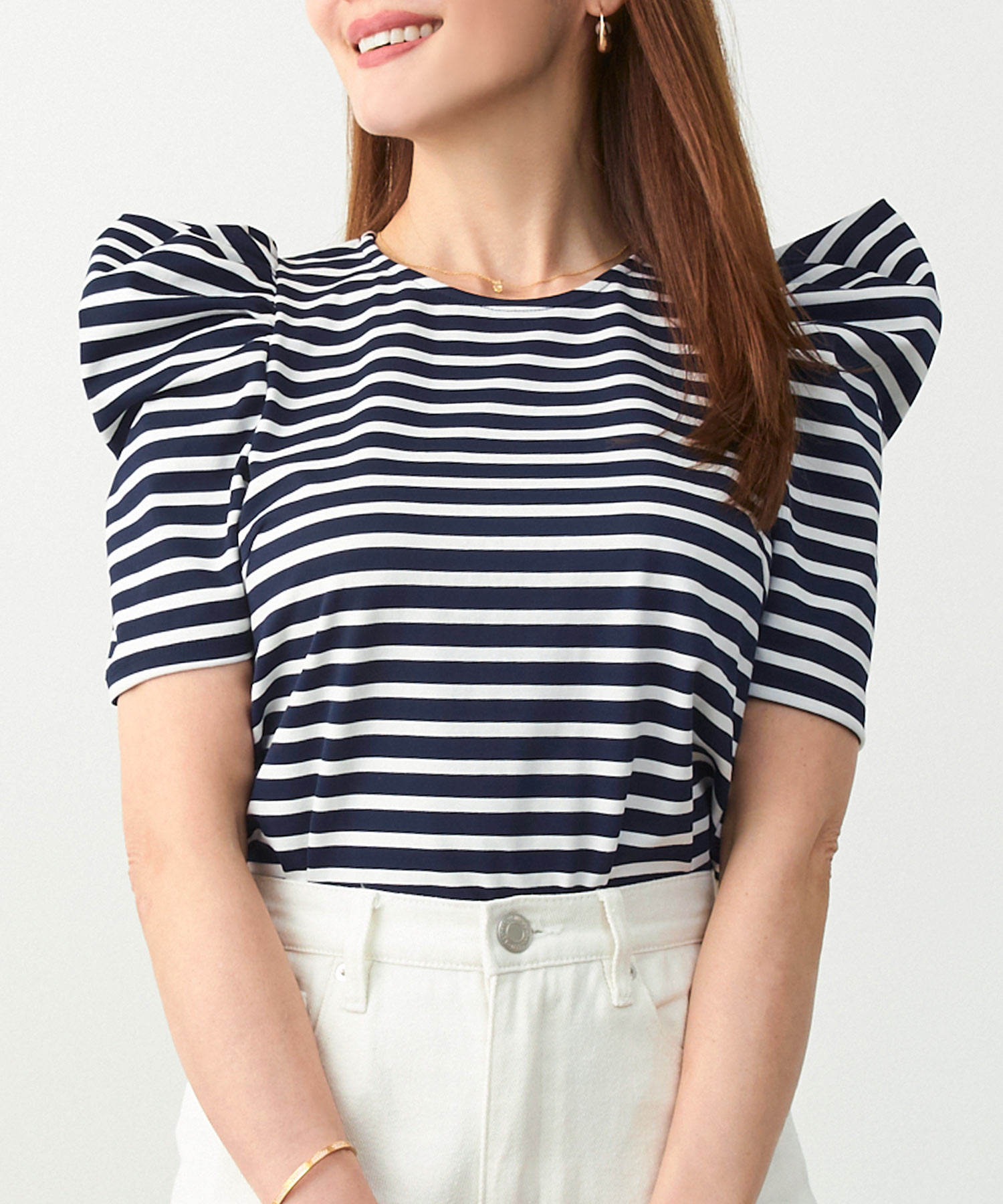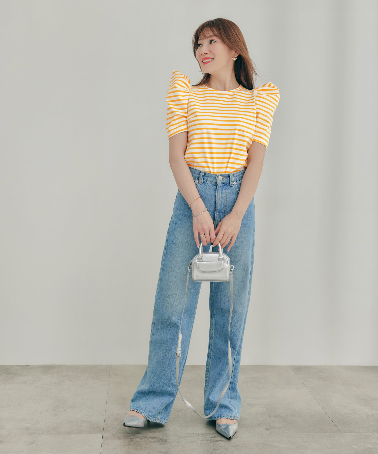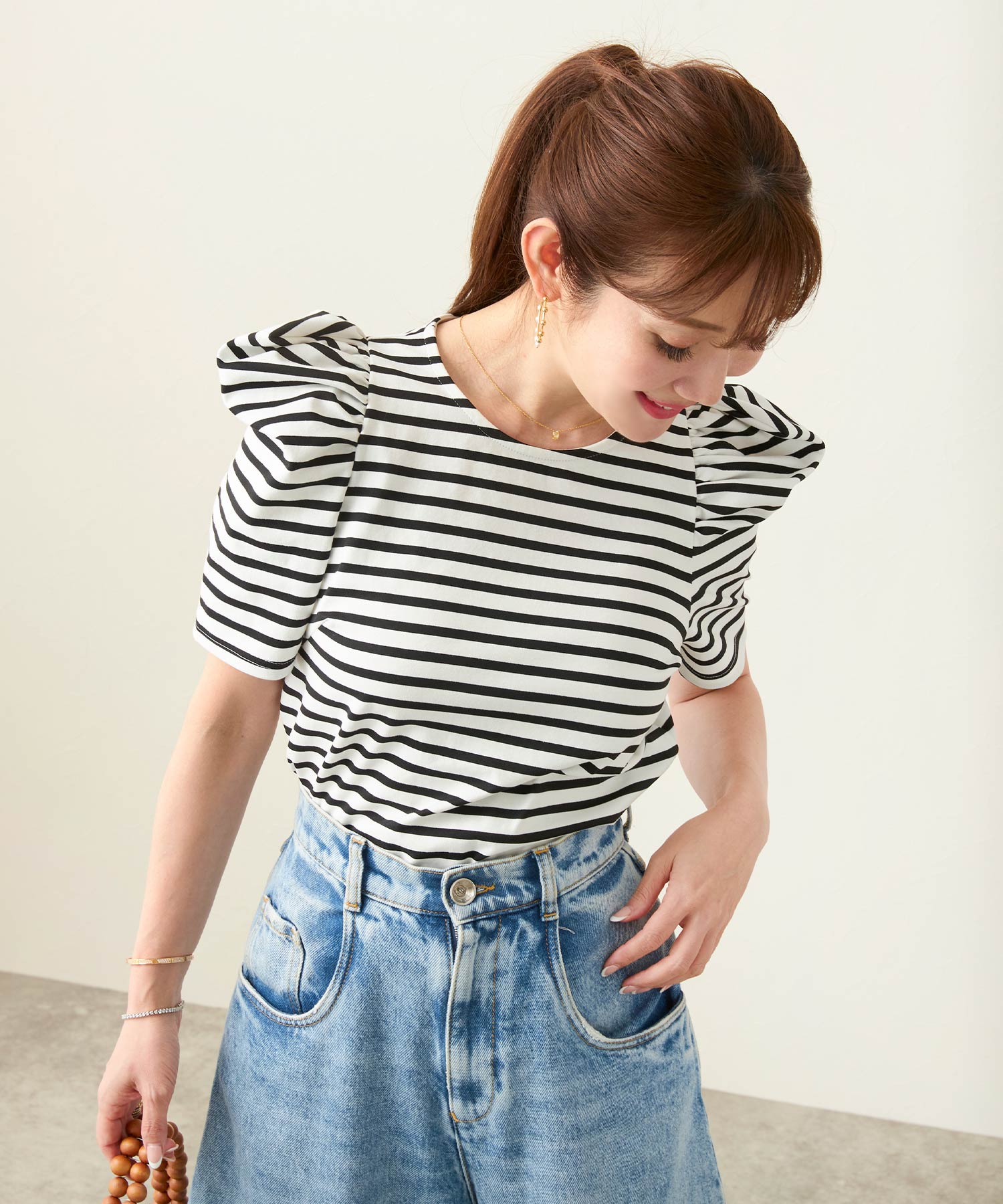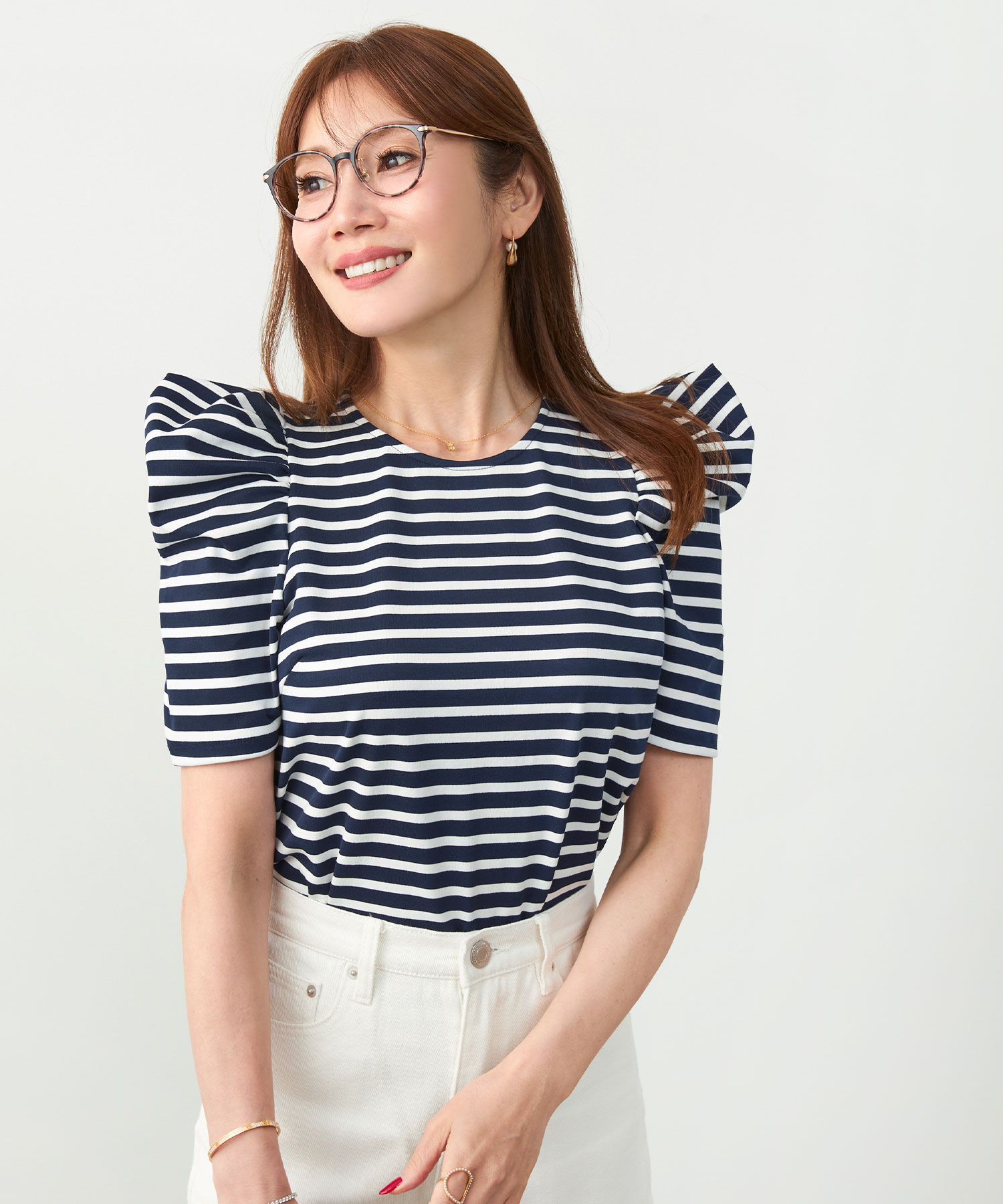 一枚で着映えるボーダートップスは、憂鬱になりがちな雨の日コーデの心強い味方。カジュアルになりがちな柄ですが、立体的なギャザースリーブがほどよく華やかさをプラスし、デートにもぴったりの印象に。モード感がありながらも着まわし力は抜群で、デイリーにも活躍。雨の日も気分が上がる、頼れるアイテムです。