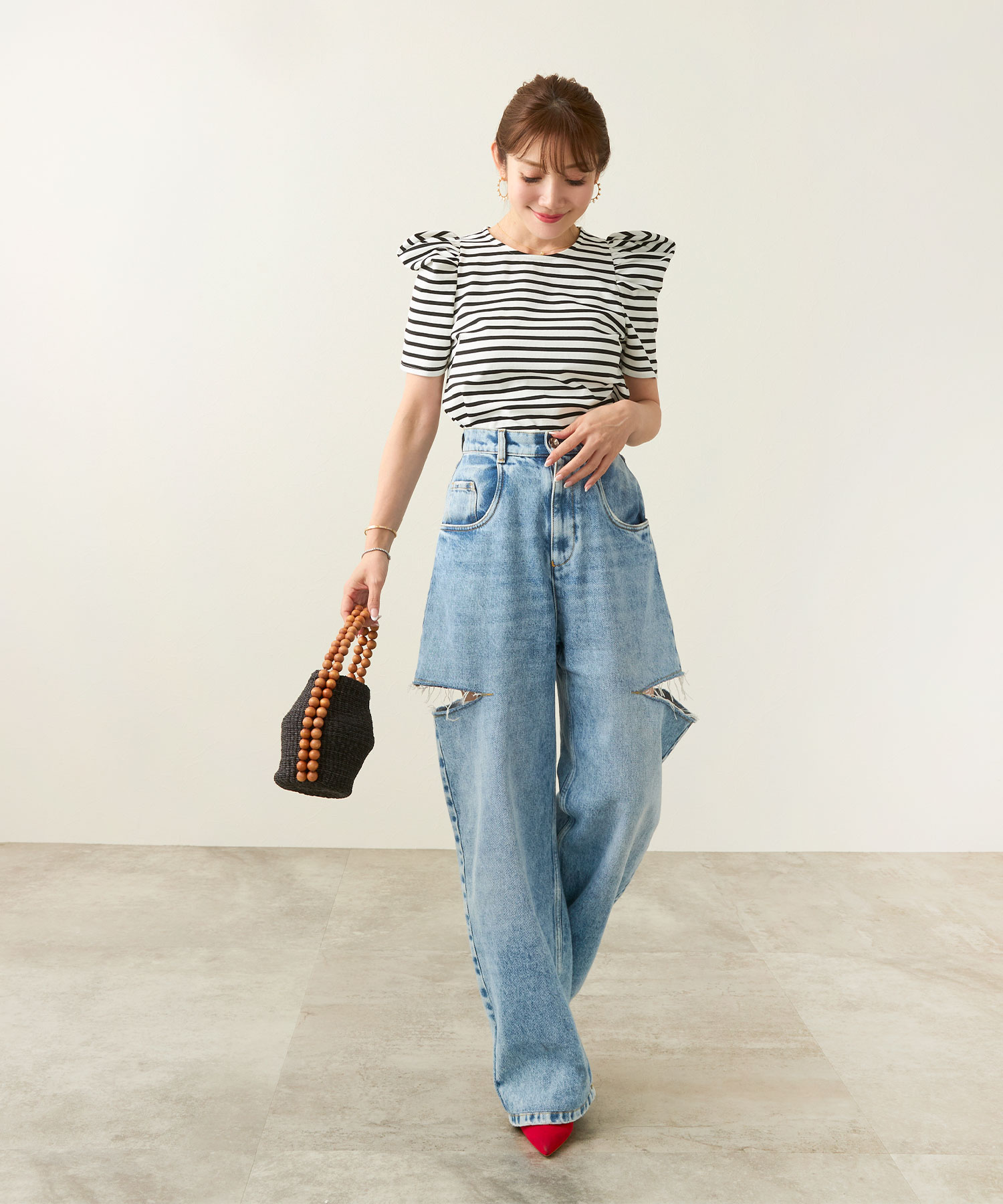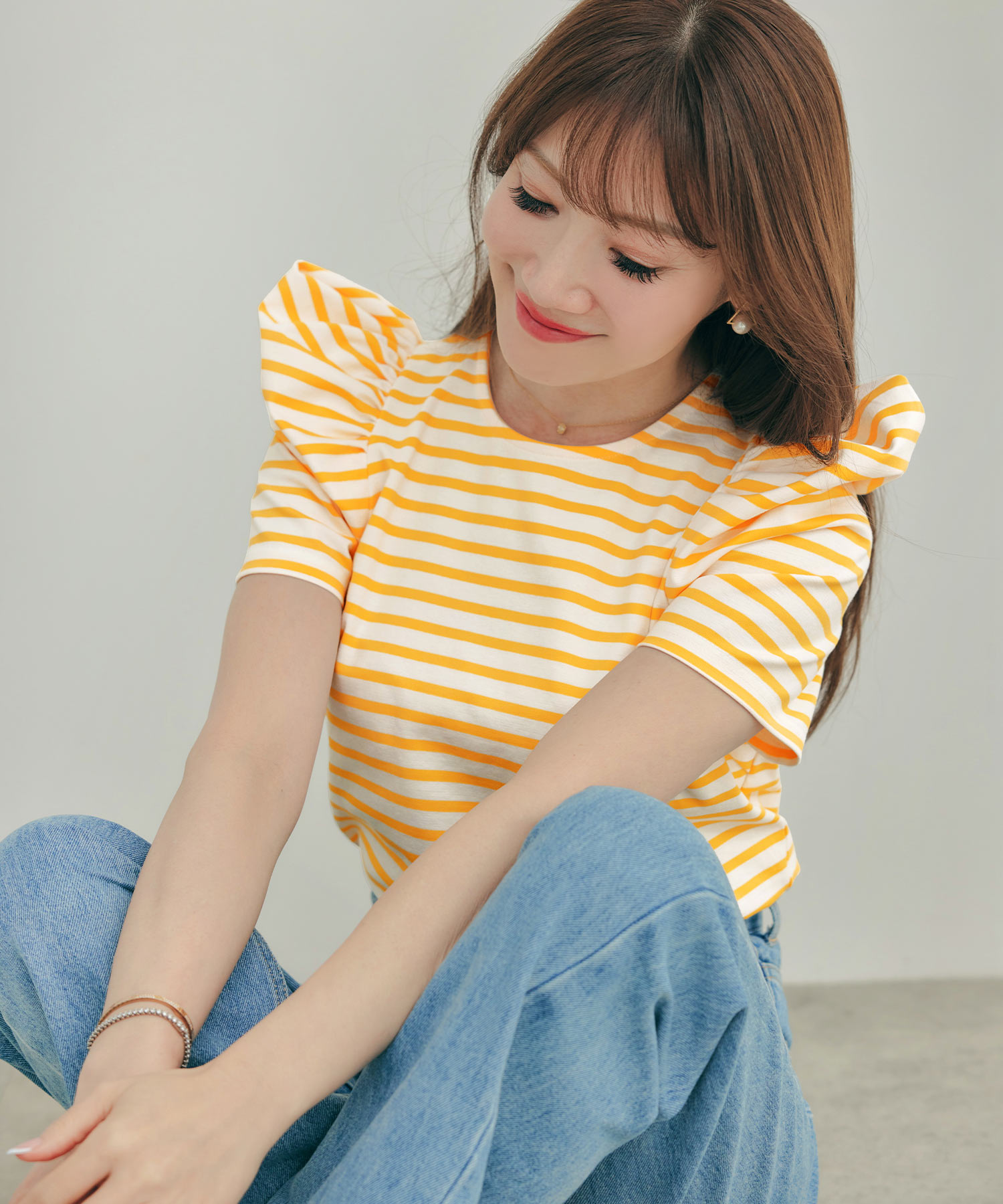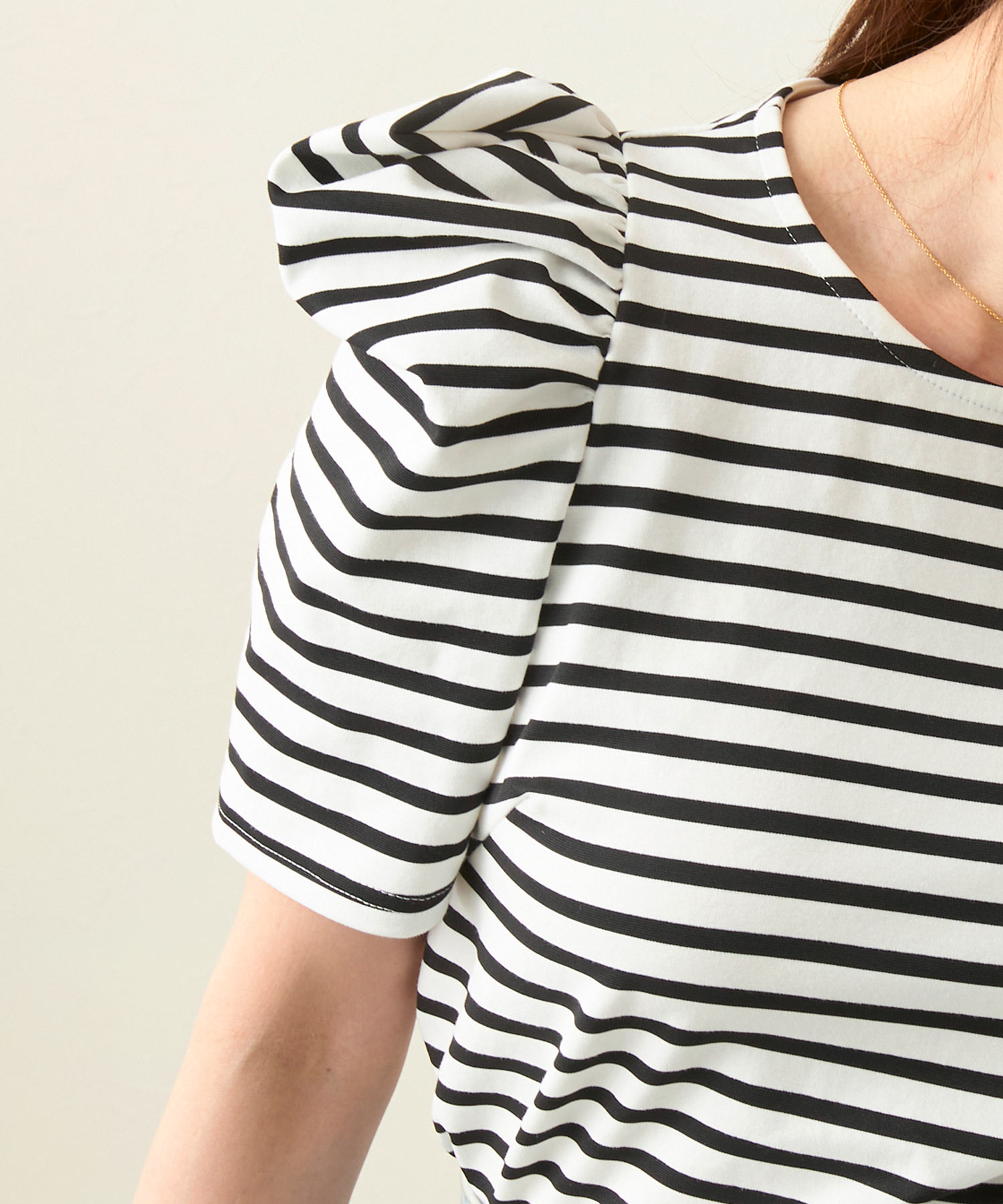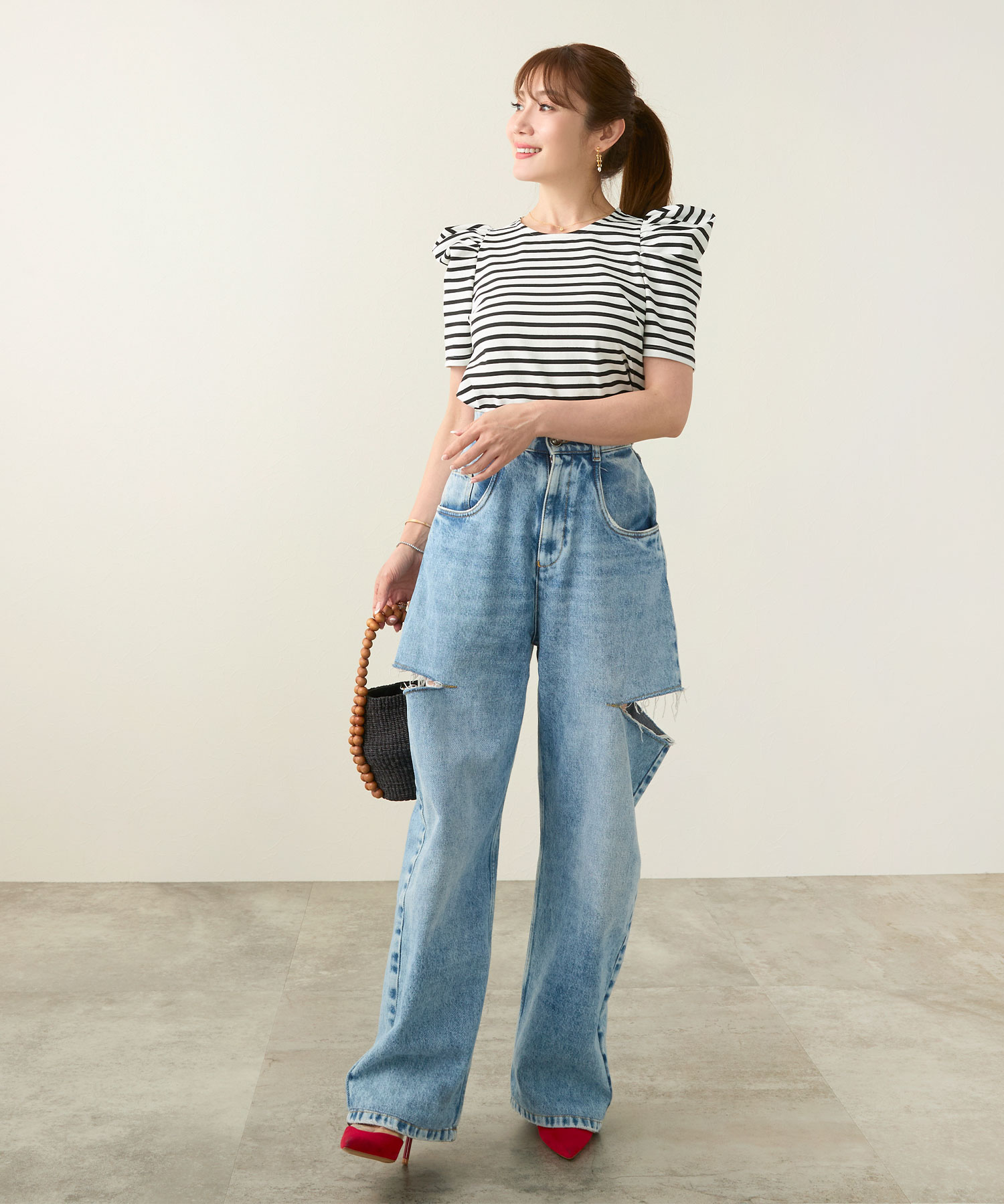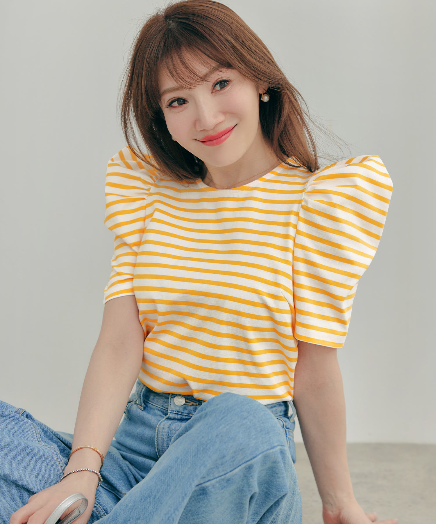 一枚で着映えるボーダートップスは、憂鬱になりがちな雨の日コーデの心強い味方。カジュアルになりがちな柄ですが、立体的なギャザースリーブがほどよく華やかさをプラスし、デートにもぴったりの印象に。モード感がありながらも着まわし力は抜群で、デイリーにも活躍。雨の日も気分が上がる、頼れるアイテムです。
