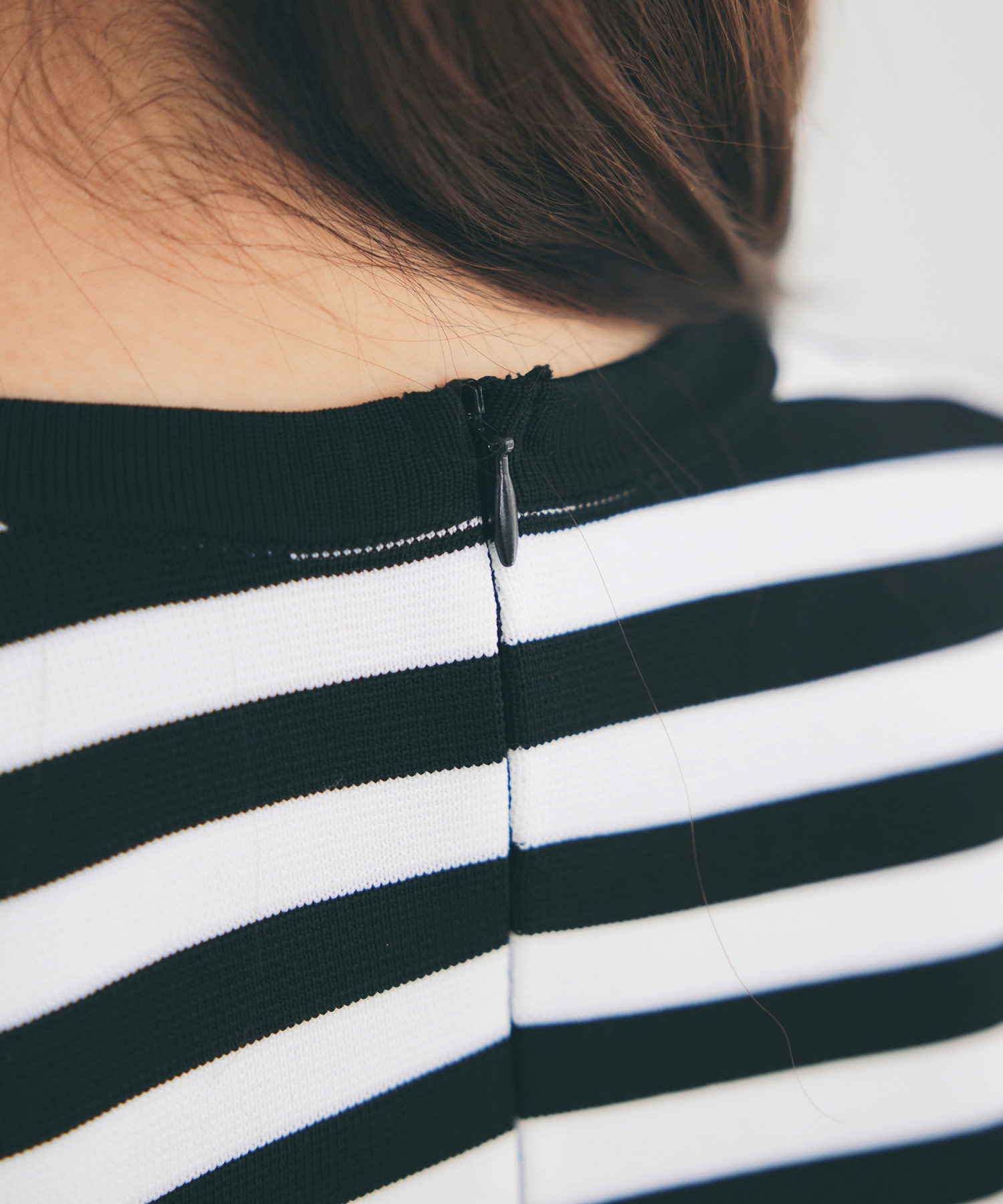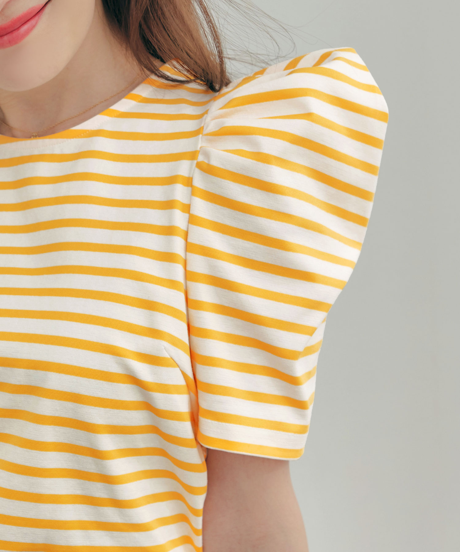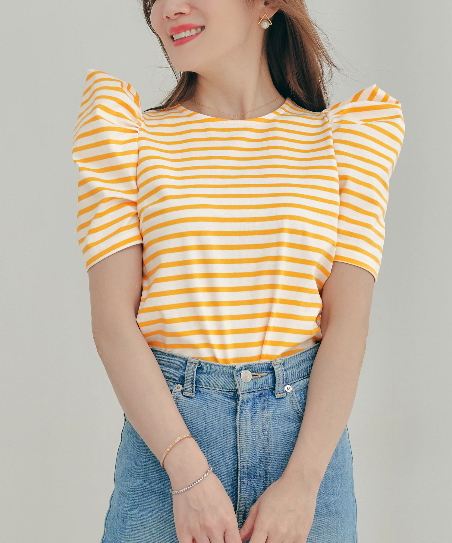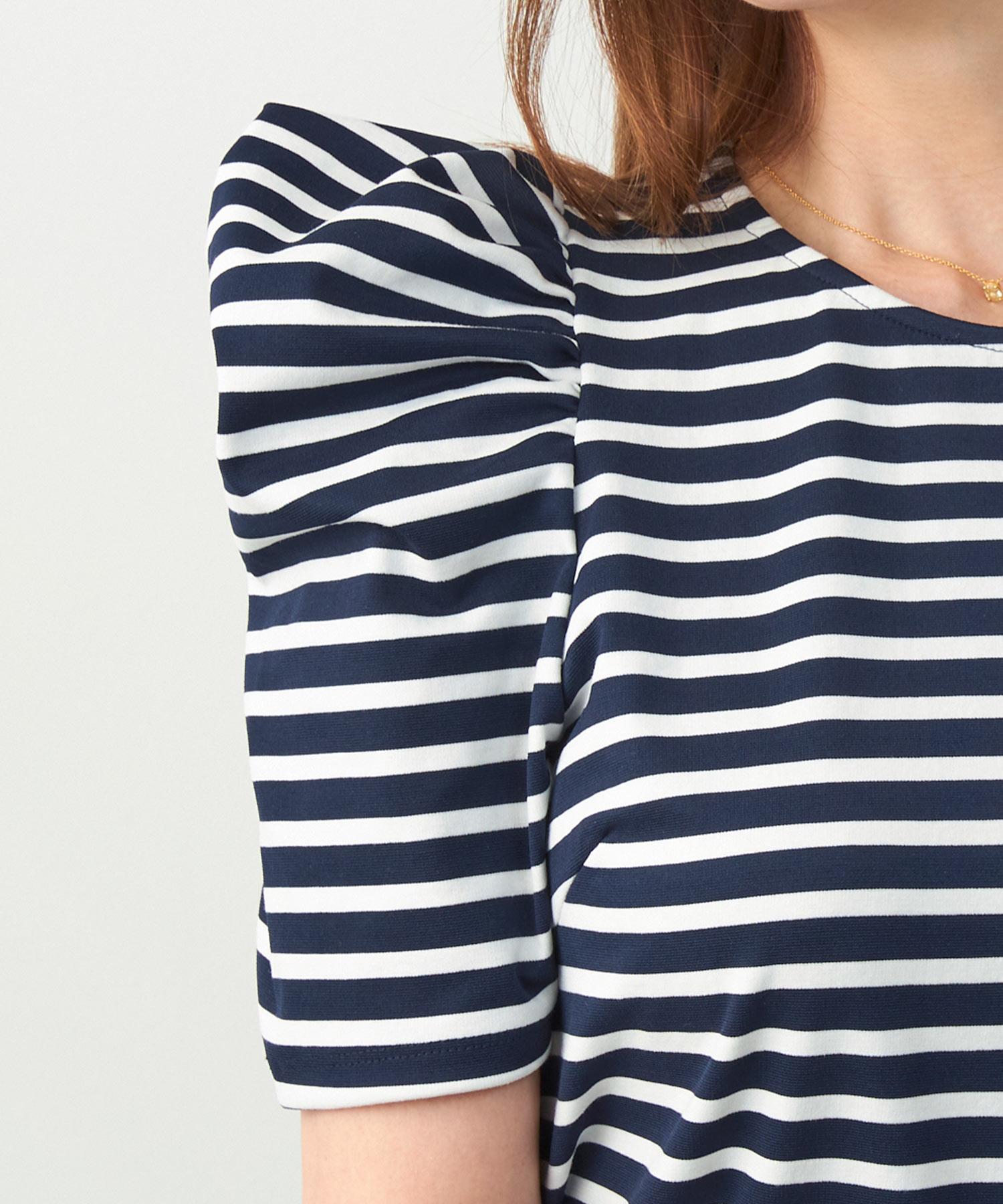 一枚で着映えるボーダートップスは、憂鬱になりがちな雨の日コーデの心強い味方。カジュアルになりがちな柄ですが、立体的なギャザースリーブがほどよく華やかさをプラスし、デートにもぴったりの印象に。モード感がありながらも着まわし力は抜群で、デイリーにも活躍。雨の日も気分が上がる、頼れるアイテムです。