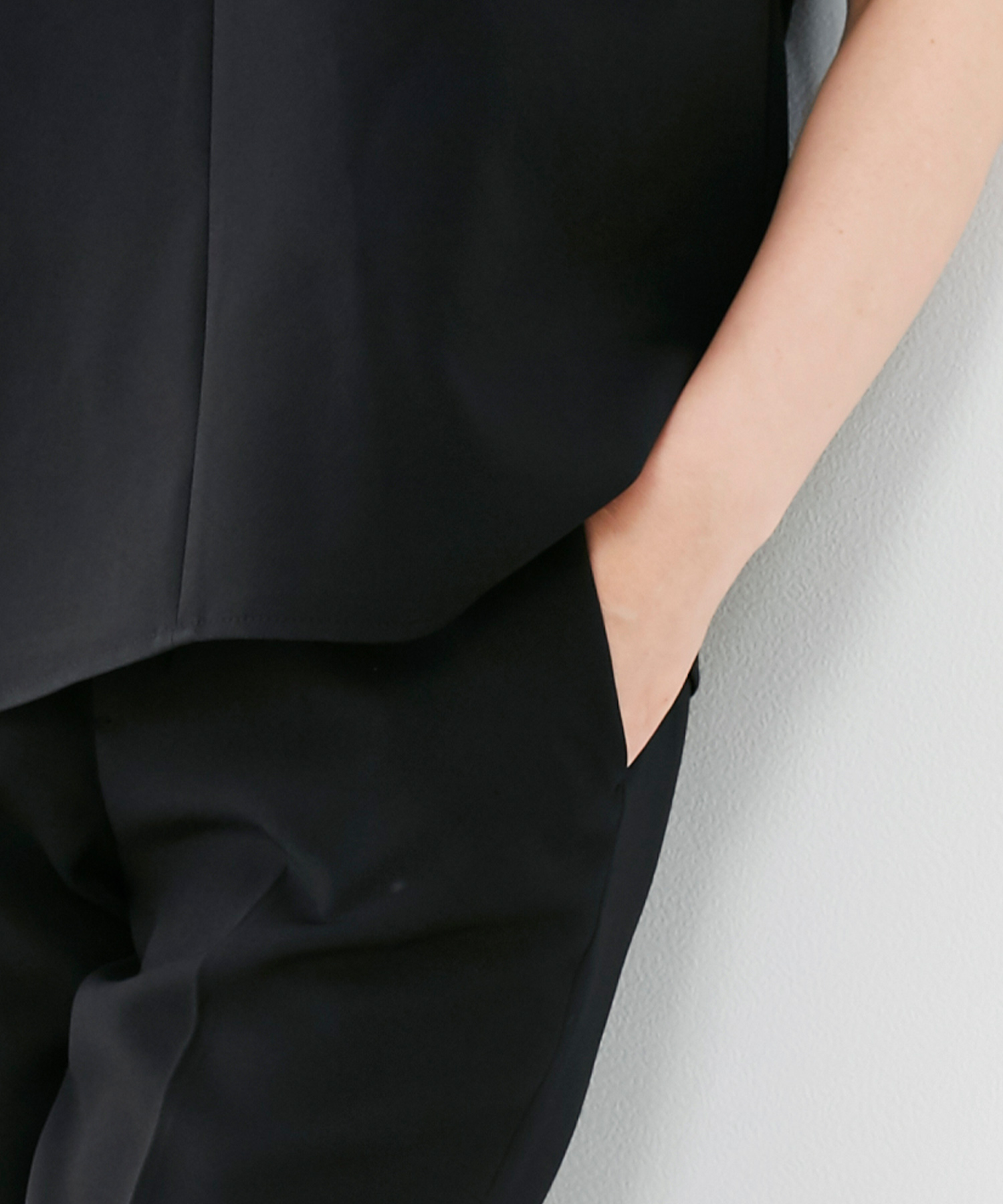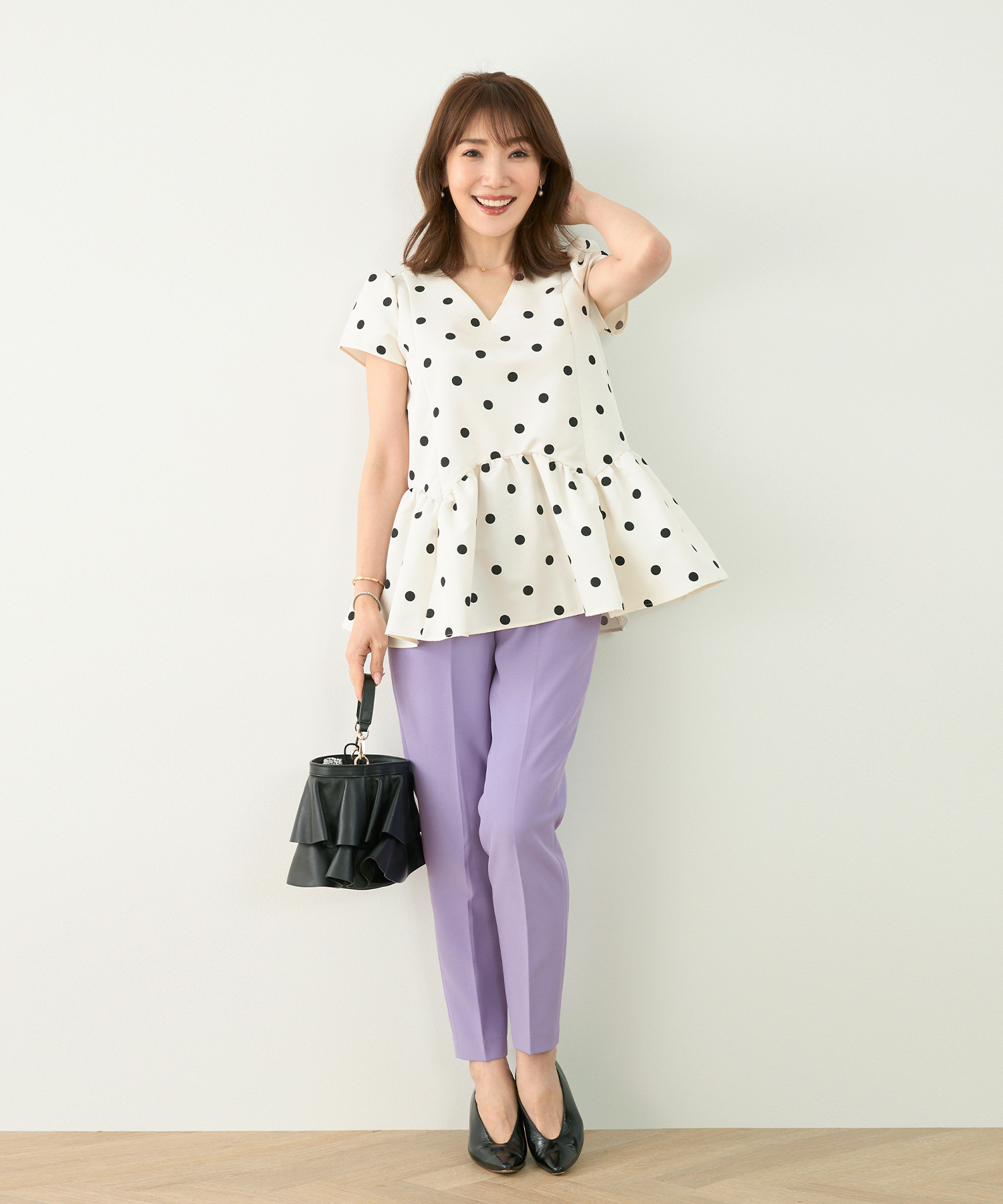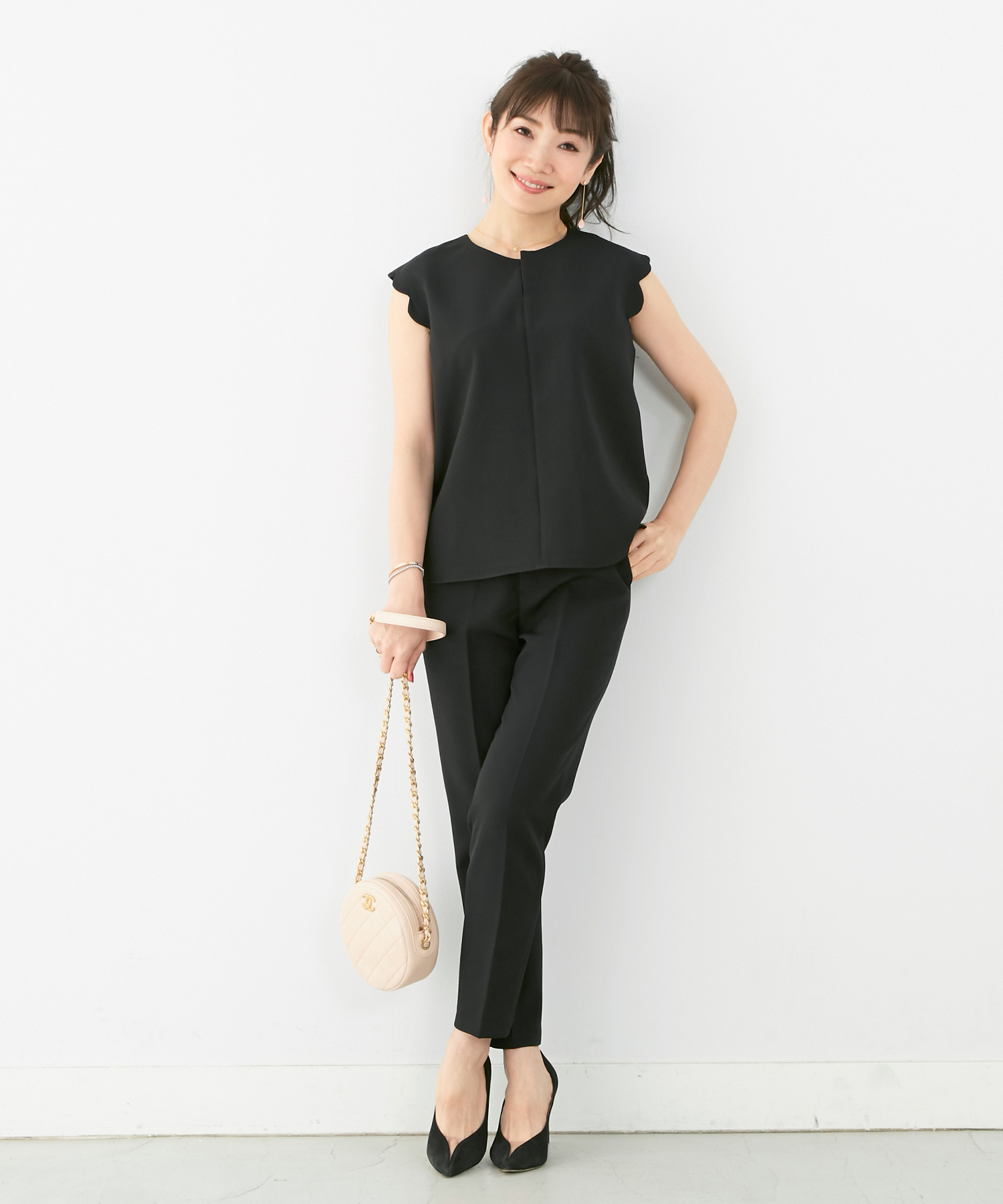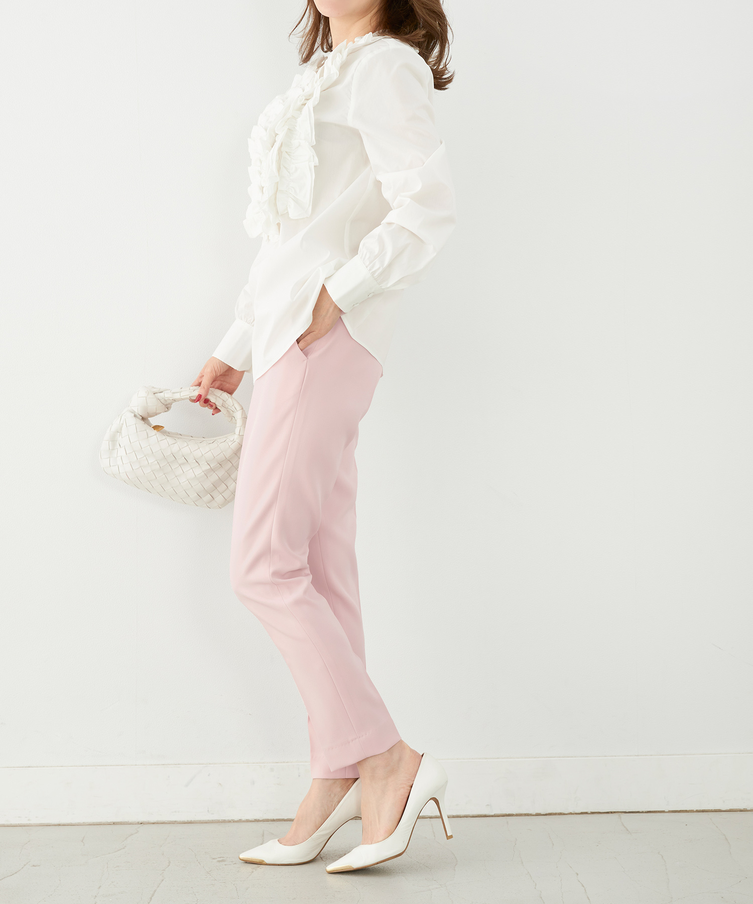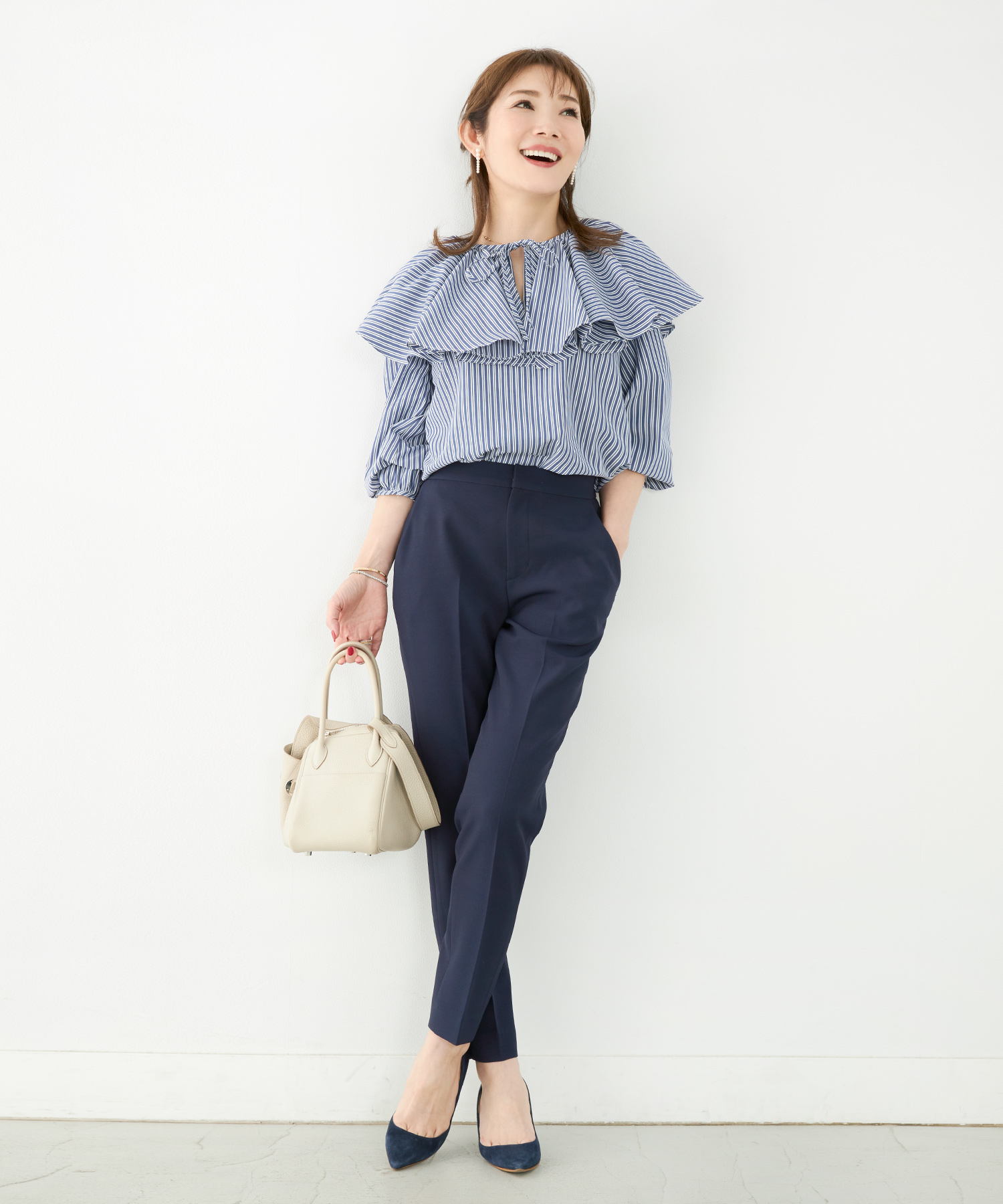 パンツは脚のラインが気になって…」という方にもおすすめなのが、とろみ素材×センタープレスの美脚パンツ。程よい落ち感が脚のラインをカバーしながら、縦ラインを強調してすらりとした印象に。さらっとした素材で梅雨時も快適に過ごせ、ふんわりブラウスとの相性も抜群。スタイルアップも叶えてくれる、雨の日の強い味方です。