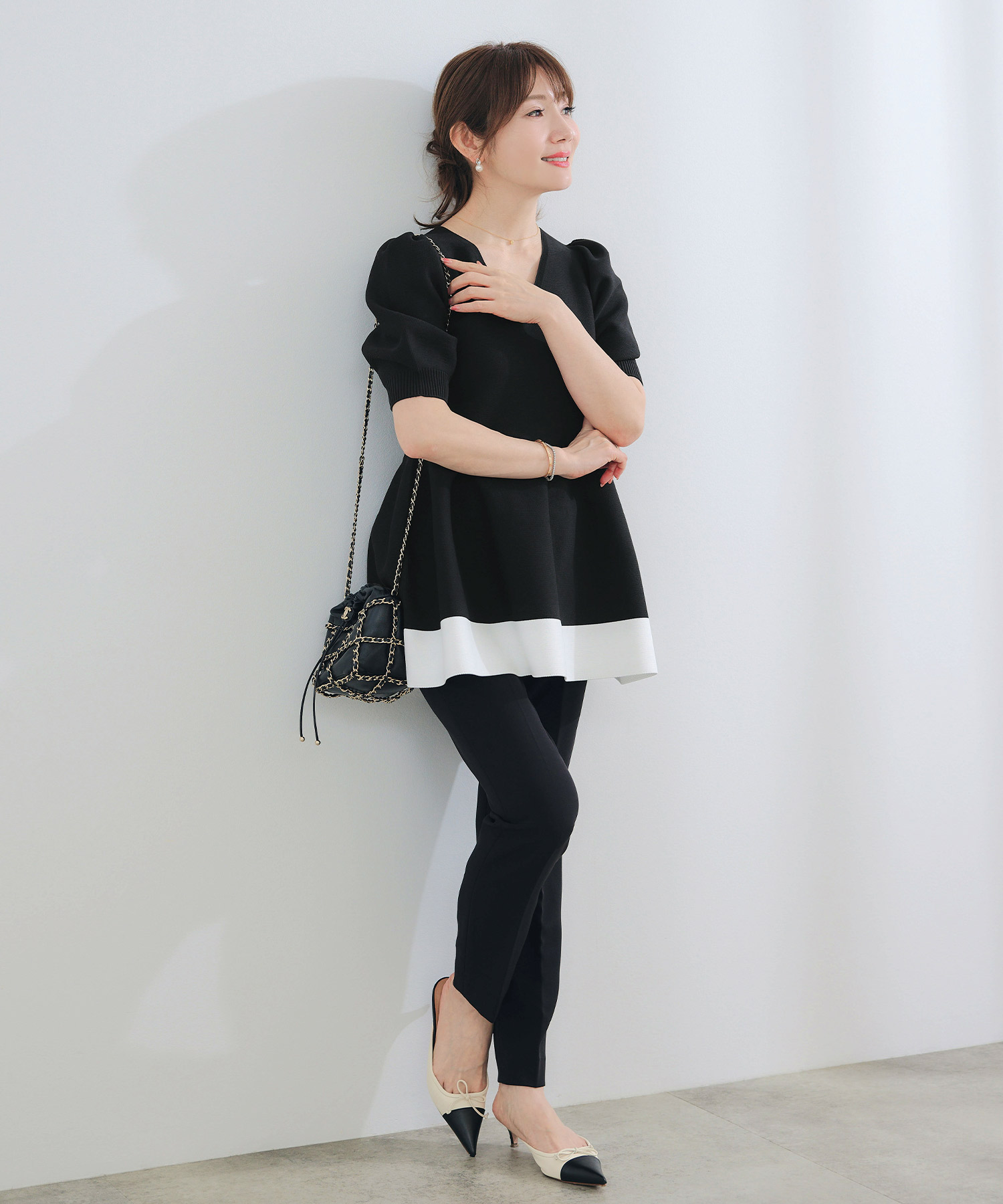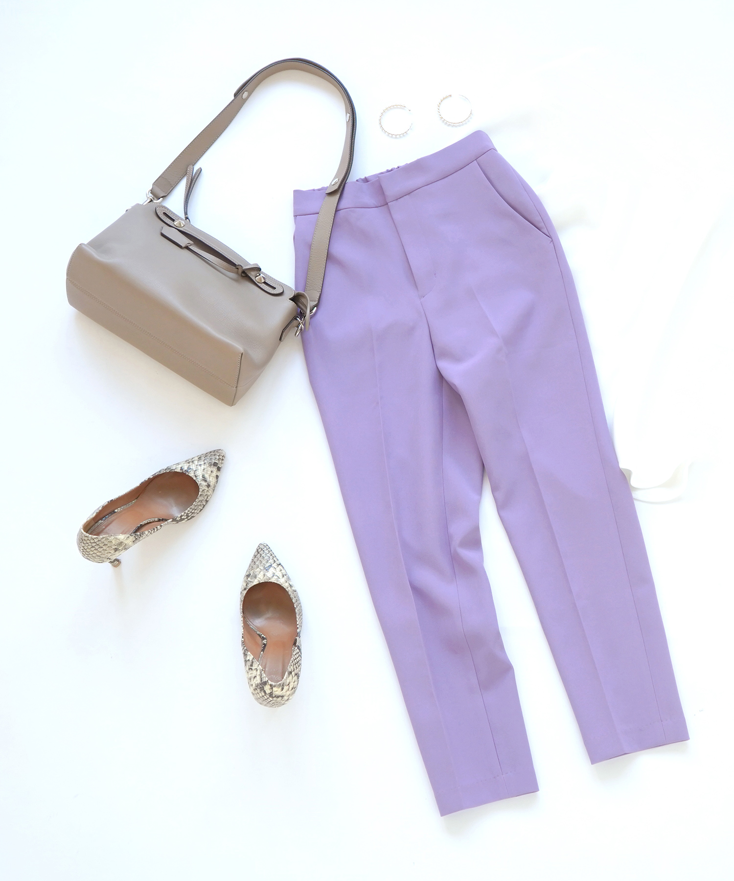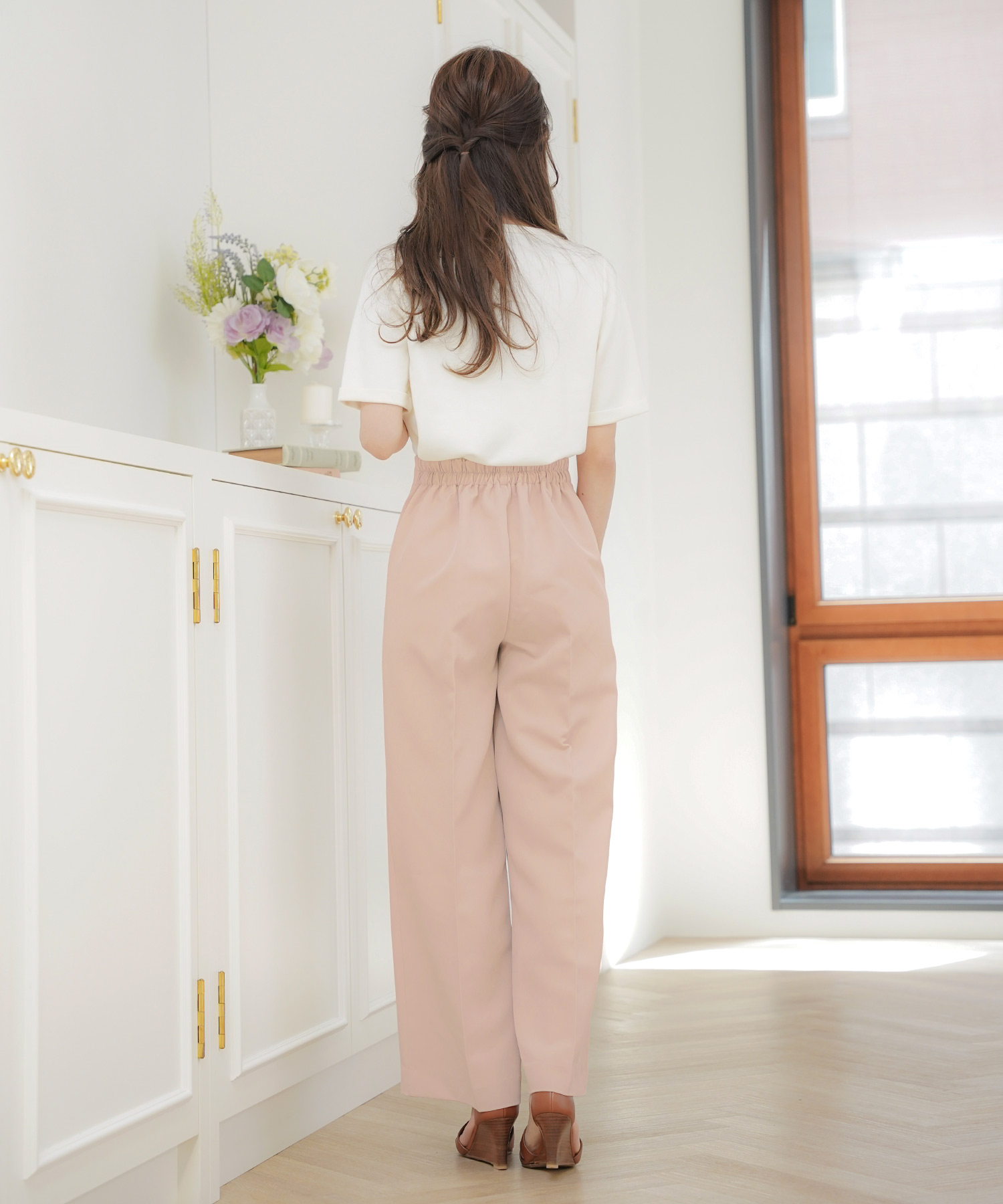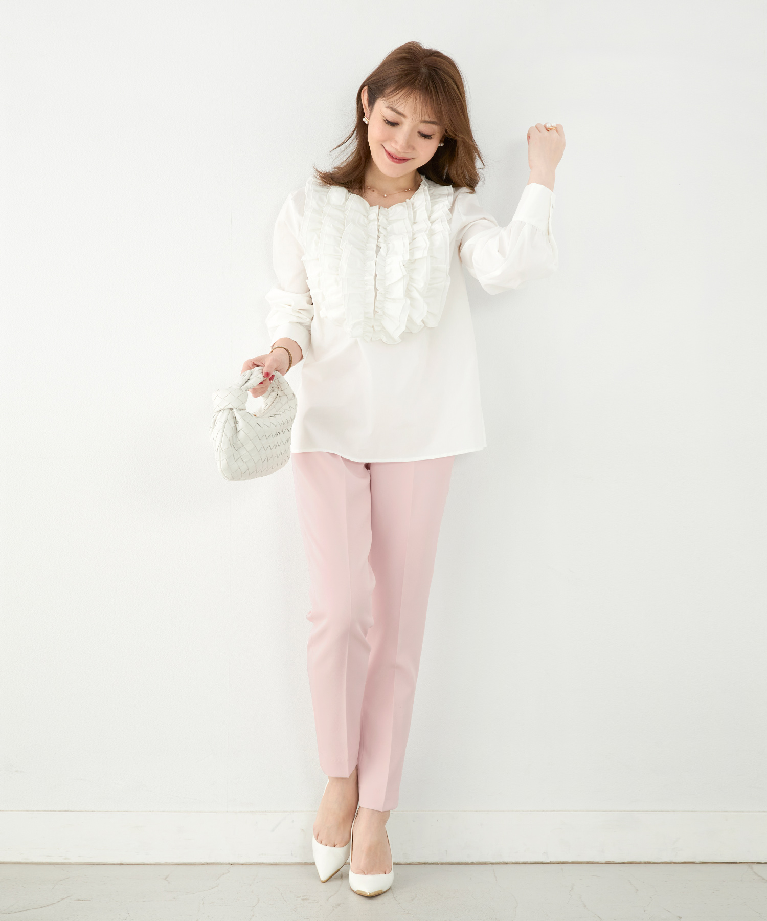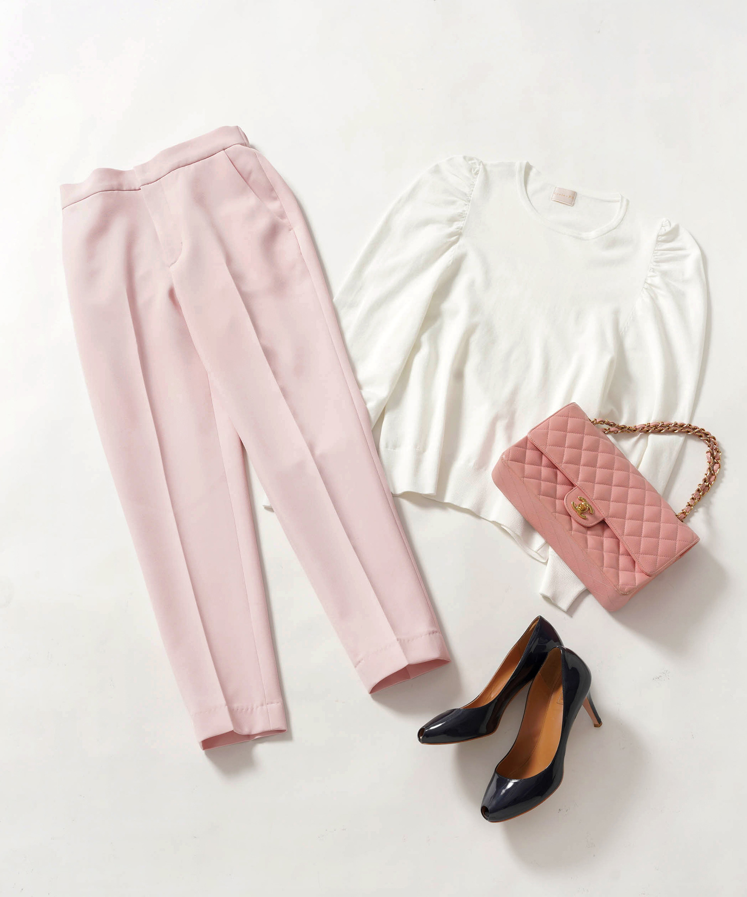 パンツは脚のラインが気になって…」という方にもおすすめなのが、とろみ素材×センタープレスの美脚パンツ。程よい落ち感が脚のラインをカバーしながら、縦ラインを強調してすらりとした印象に。さらっとした素材で梅雨時も快適に過ごせ、ふんわりブラウスとの相性も抜群。スタイルアップも叶えてくれる、雨の日の強い味方です。
