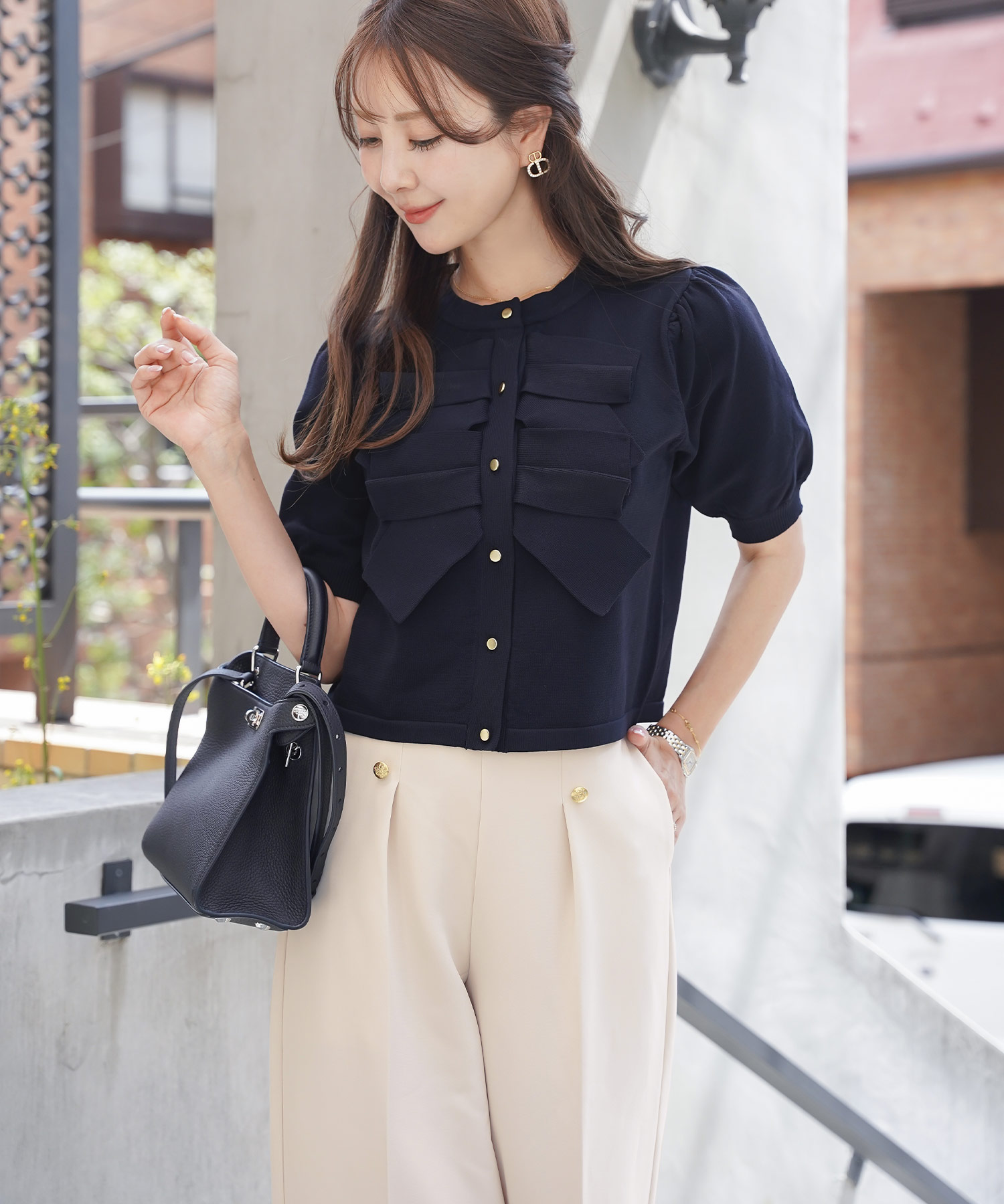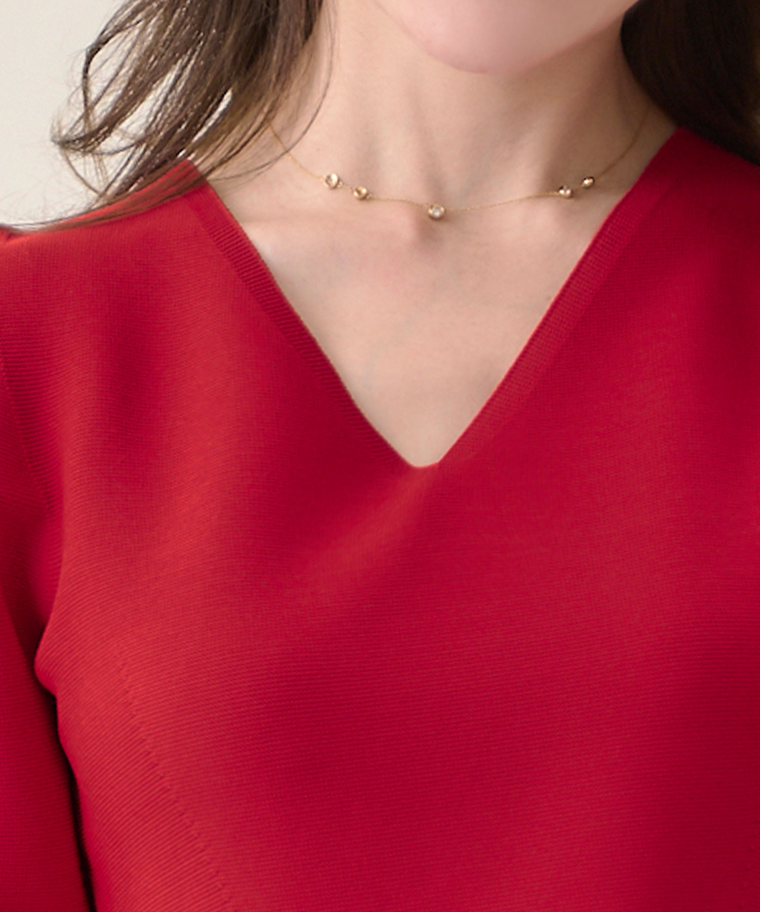 肌寒さを感じやすい梅雨や夏の冷房対策には、一枚あると安心な高機能ニットカーディガンがおすすめ。UVカット・接触冷感・アンチピリングの3つの機能付きで、汗ばむ季節でも快適に着られます。フロントボタンにはパールをあしらい、羽織るだけで品のある華やかさをプラス。ノースリーブワンピースの肩掛けとしても、ボタンをすべて留めてニットトップス風に着こなしても◎。
