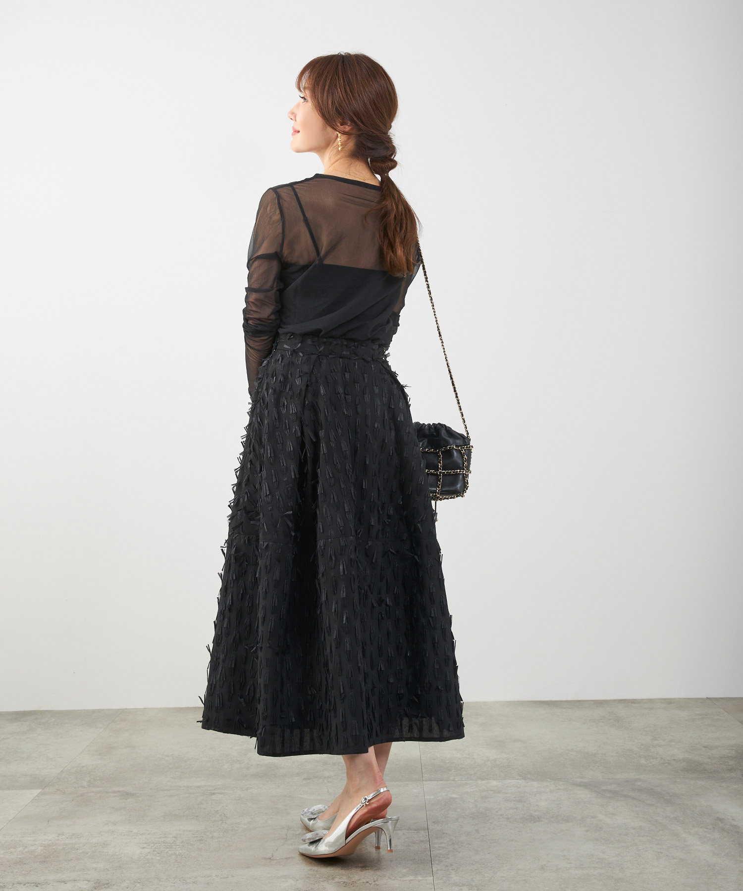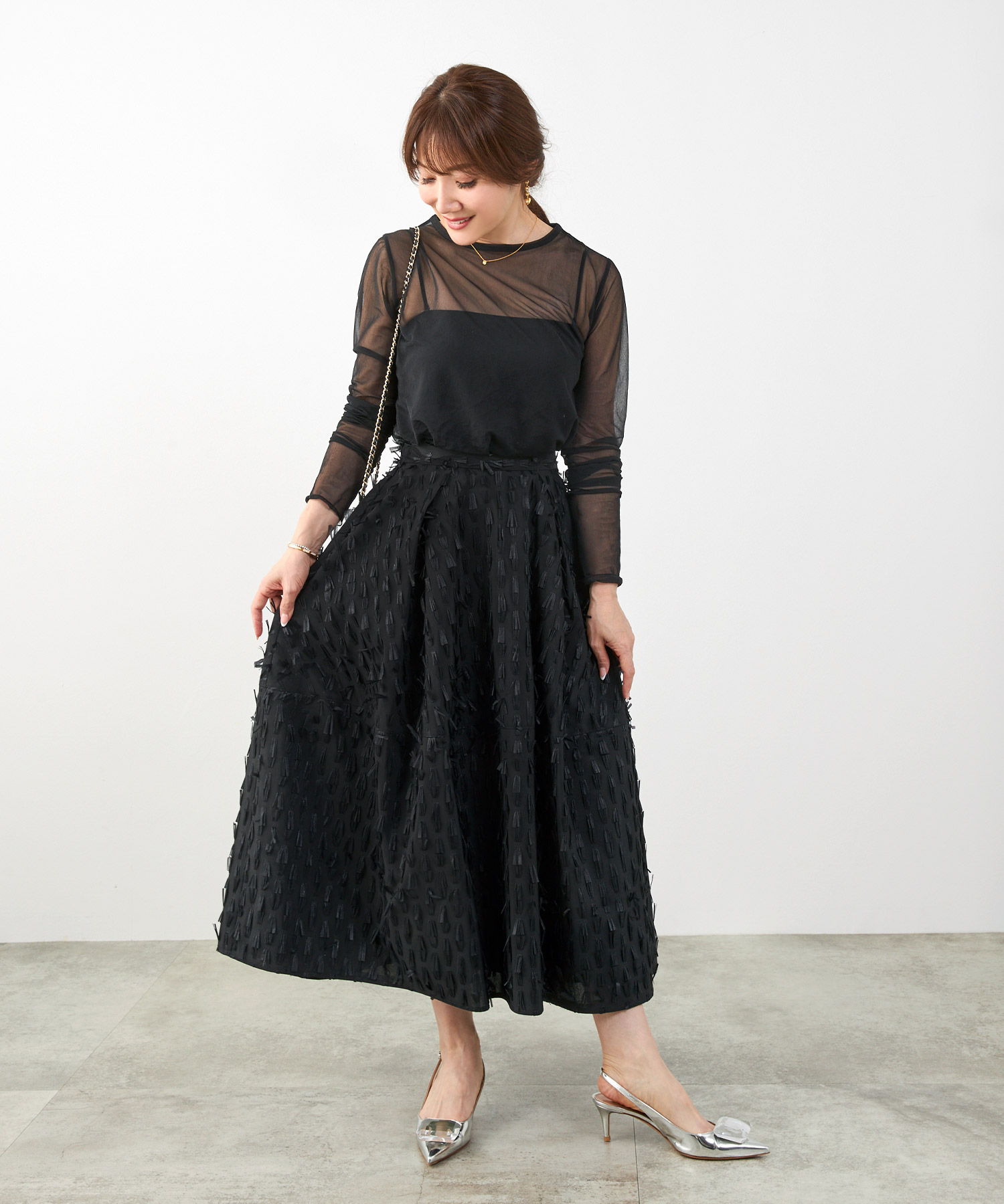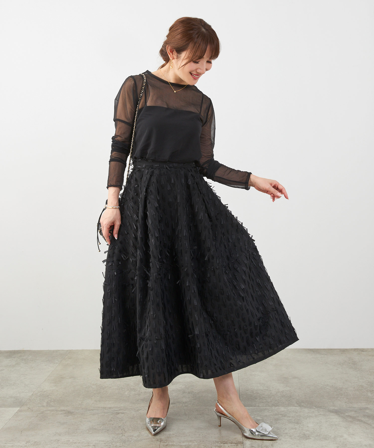 雨の日に活躍するブラックスカートは、一枚あると頼れる存在。中でも、フリンジディテールが印象的なフレアシルエットなら、重たく見えず華やかに着映えします。ブラックならではの泥ハネの心配も少なく、実用性も◎。シックなディナーシーンには、あえて全身ブラックでまとめた洗練コーディネートがおすすめです。