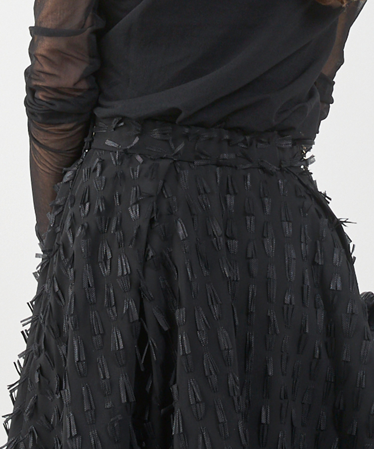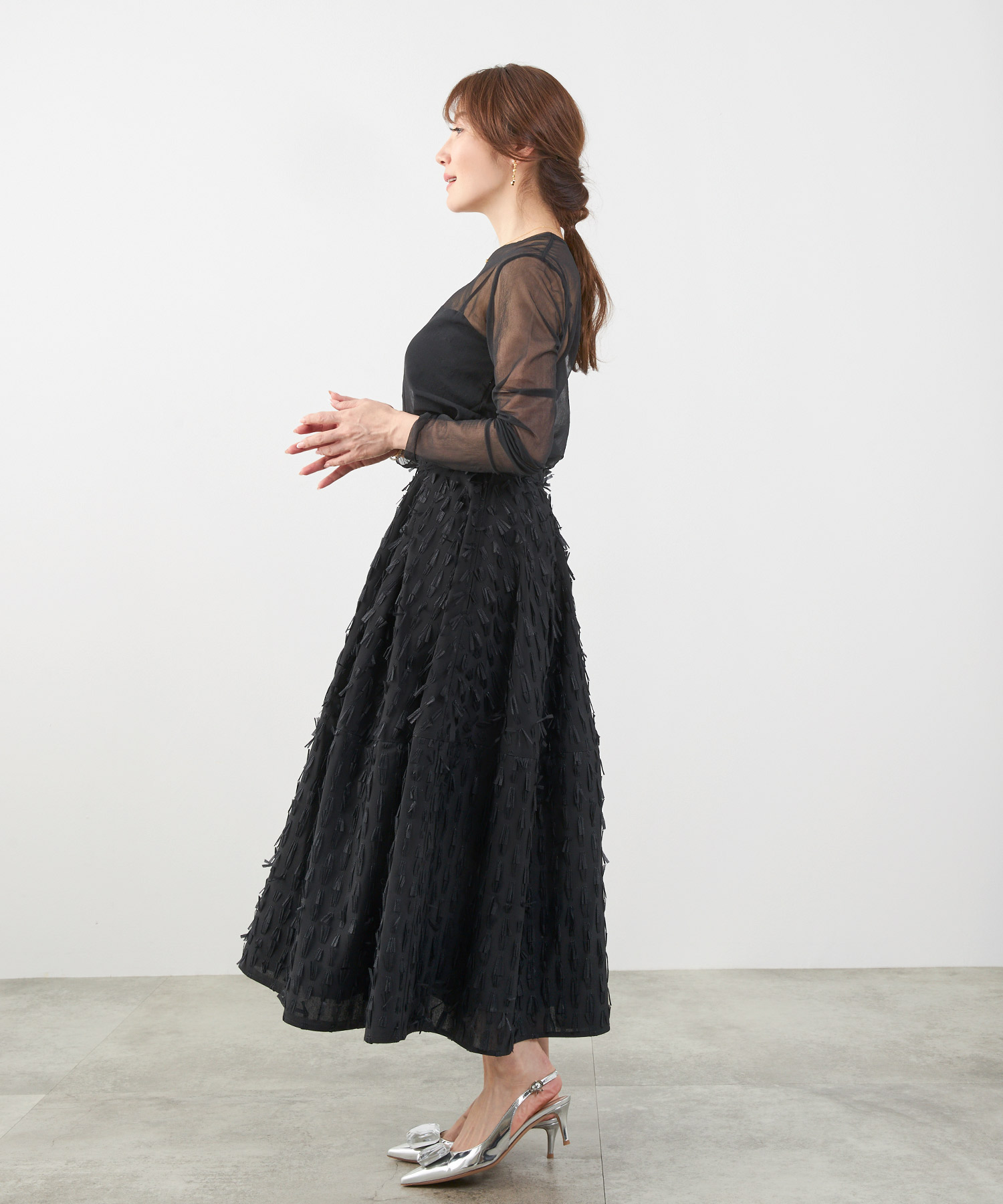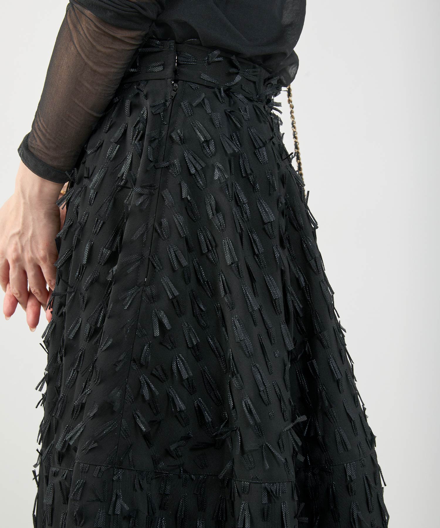雨の日に活躍するブラックスカートは、一枚あると頼れる存在。中でも、フリンジディテールが印象的なフレアシルエットなら、重たく見えず華やかに着映えします。ブラックならではの泥ハネの心配も少なく、実用性も◎。シックなディナーシーンには、あえて全身ブラックでまとめた洗練コーディネートがおすすめです。