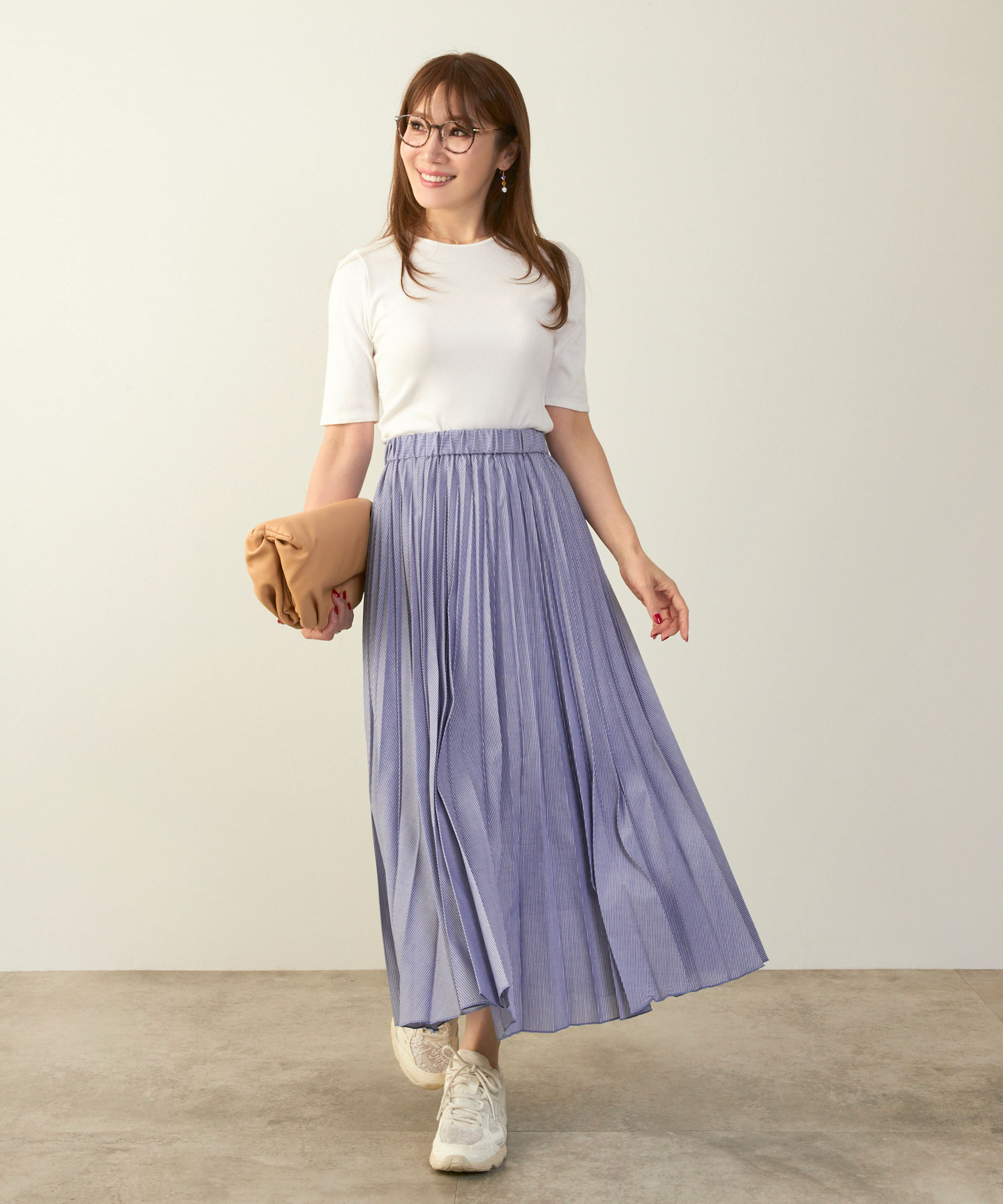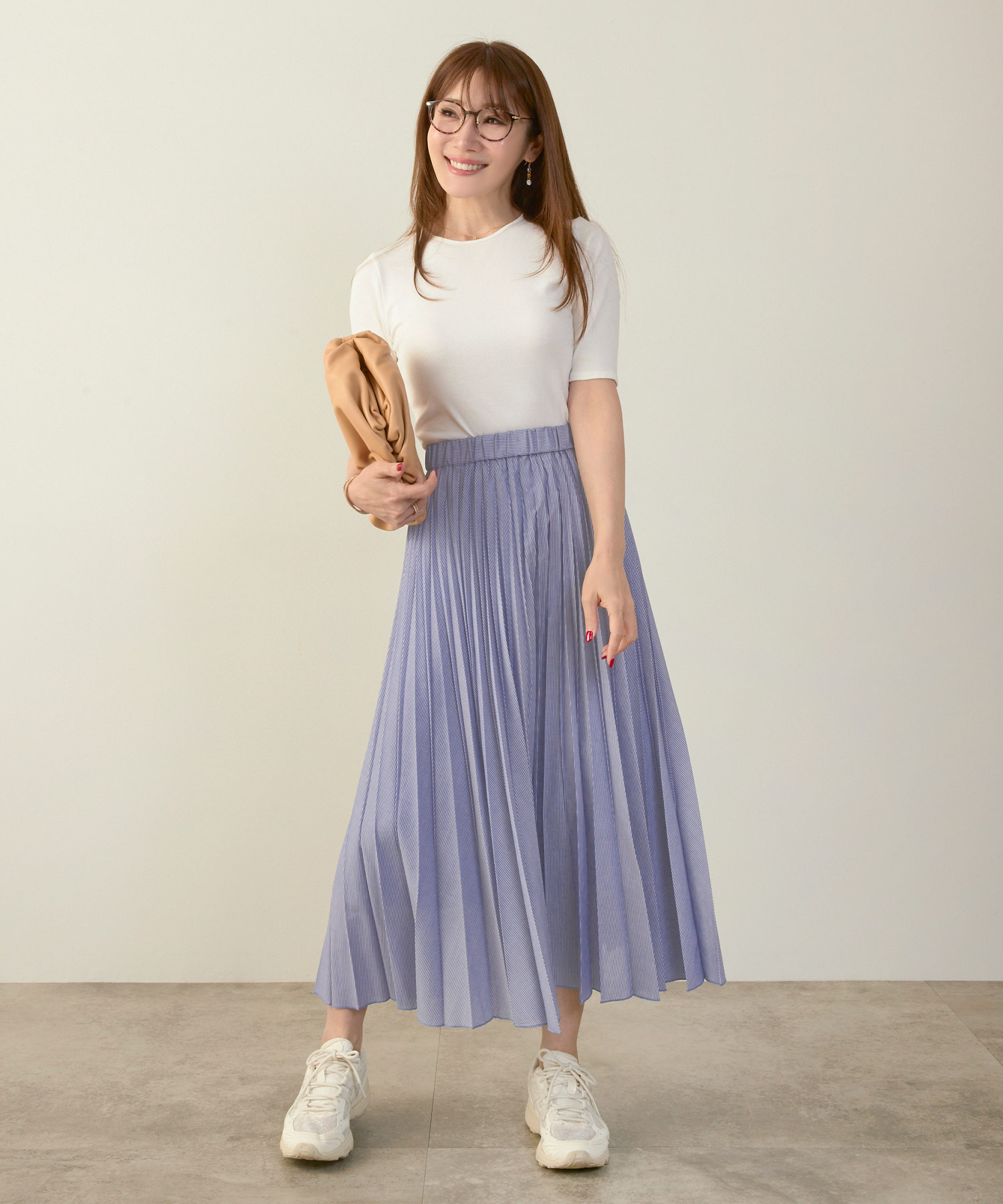 雨の日はどうしても装いが重くなりがち。そんなときは、軽やかに揺れるプリーツスカートで気分も印象も明るく。Tシャツと合わせるだけで、品のある甘さをプラスできるから、カジュアルになりすぎずデートにも最適です。