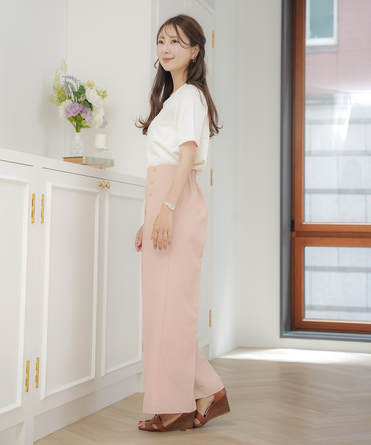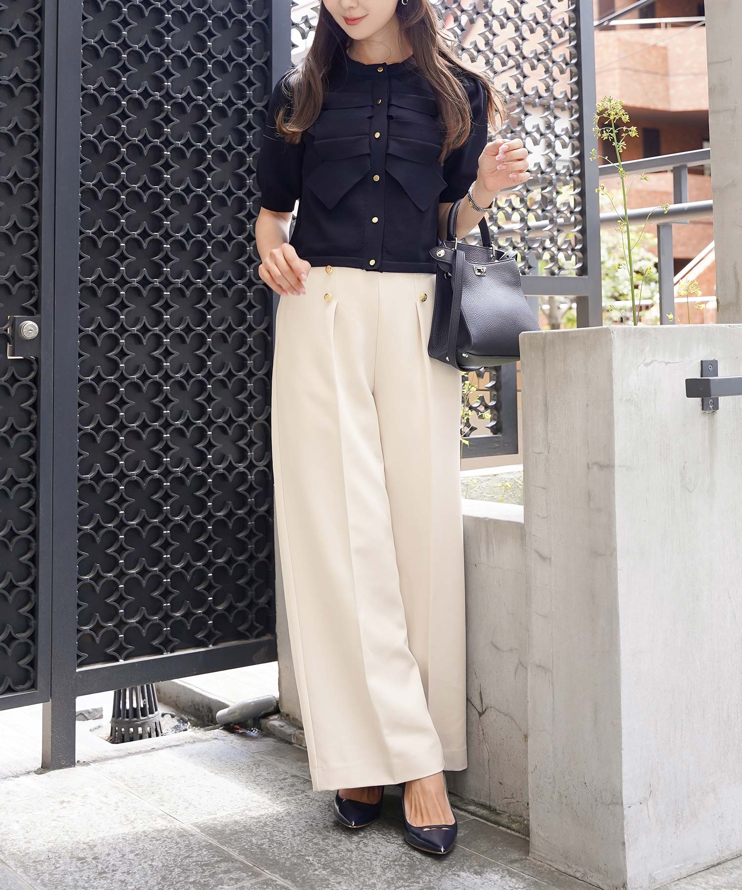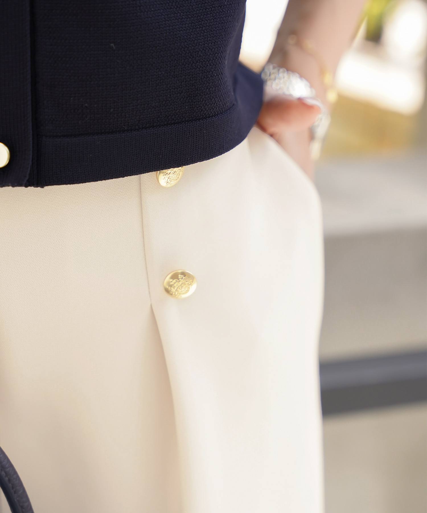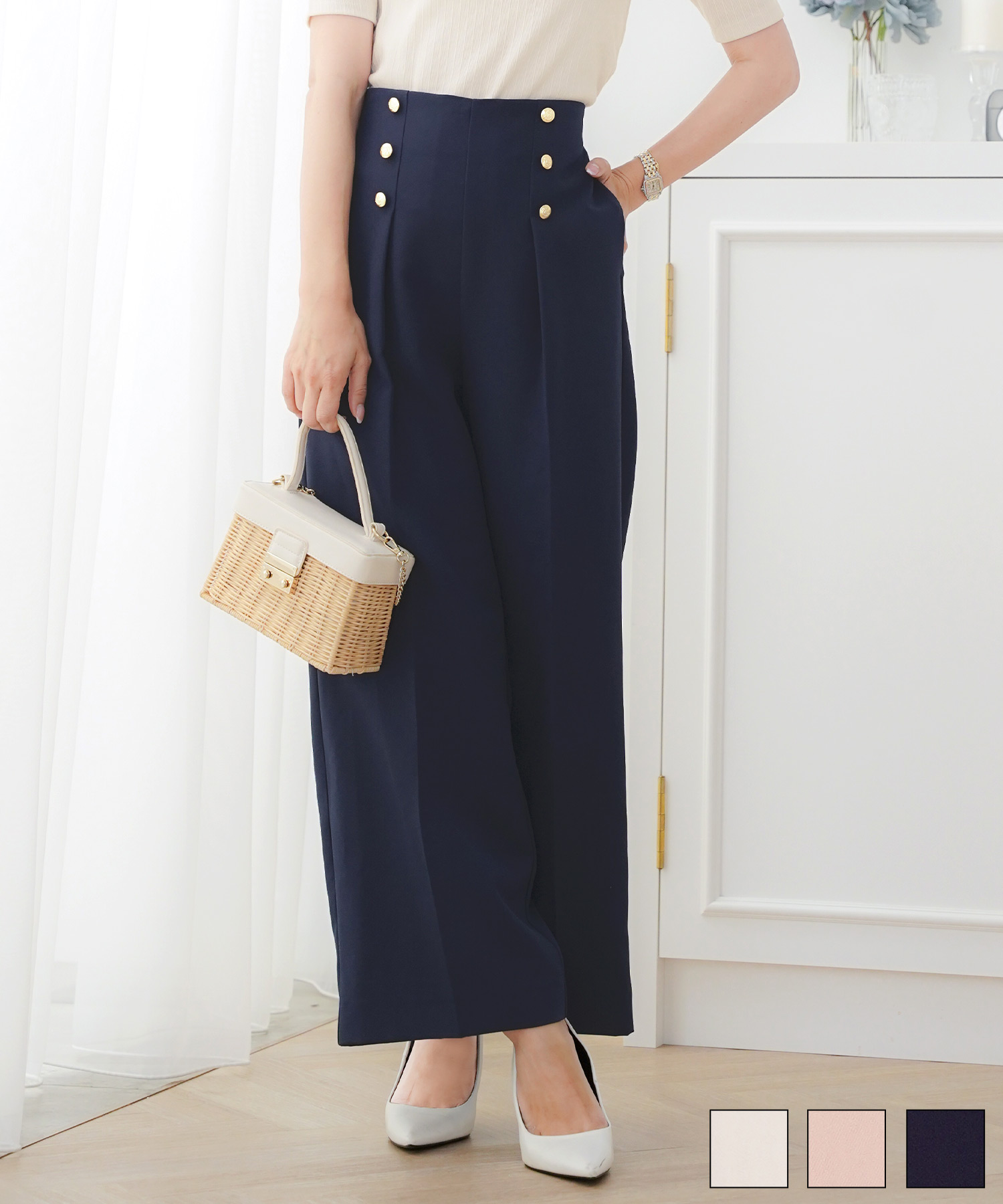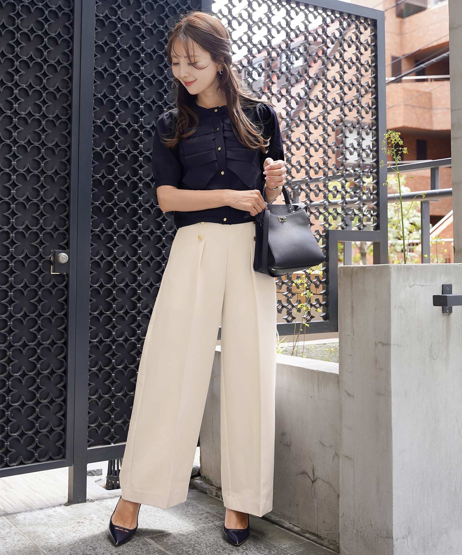 なかでも、金ボタンがアクセントになったマリンデザインのハイウエストパンツは、シンプルなTシャツやブラウスと合わせるだけでこなれた印象に。トップスをコンパクトにまとめれば、脚長効果も抜群。雨の日でもおしゃれを楽しみたい夏のデートにぴったりの1本です。