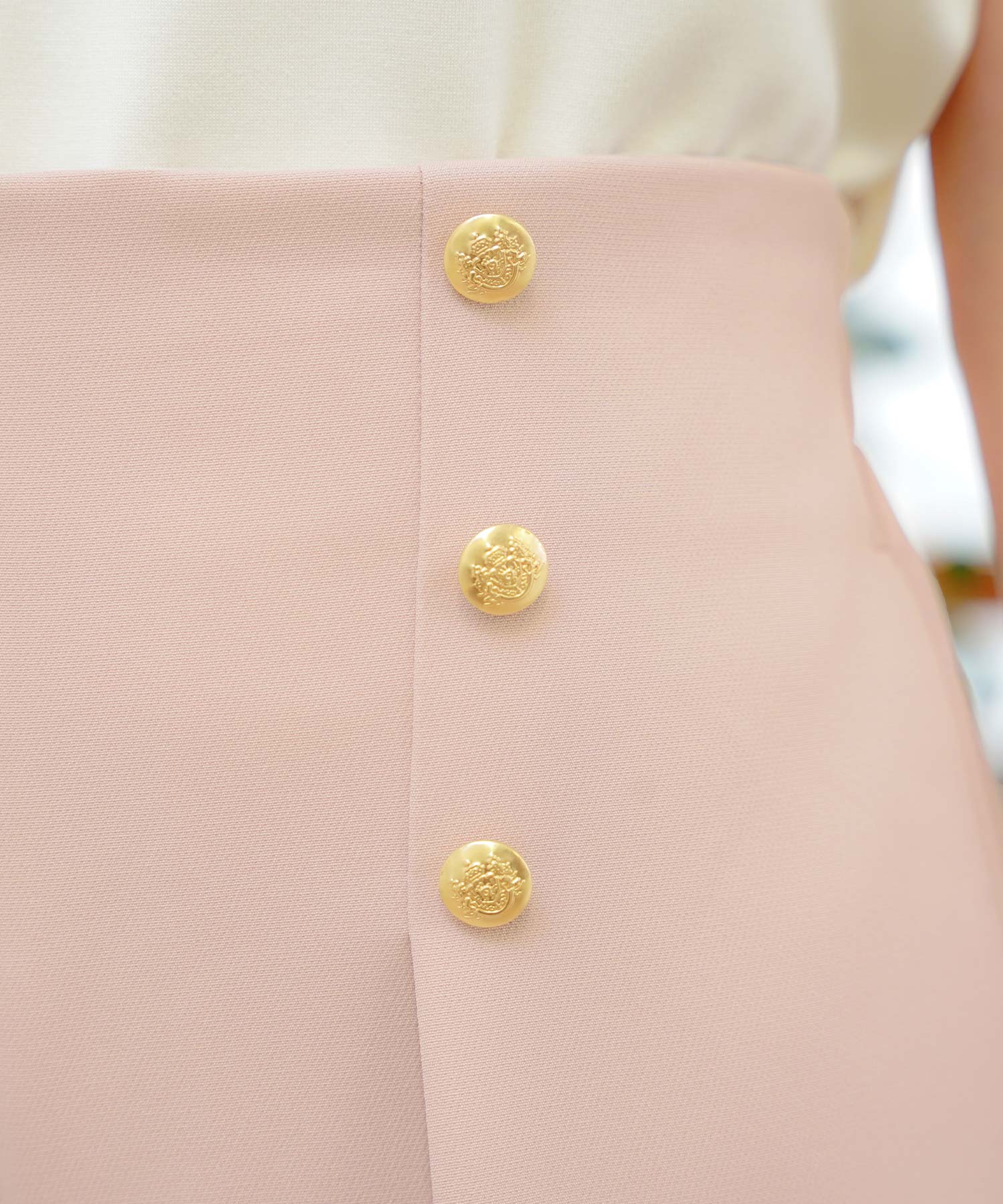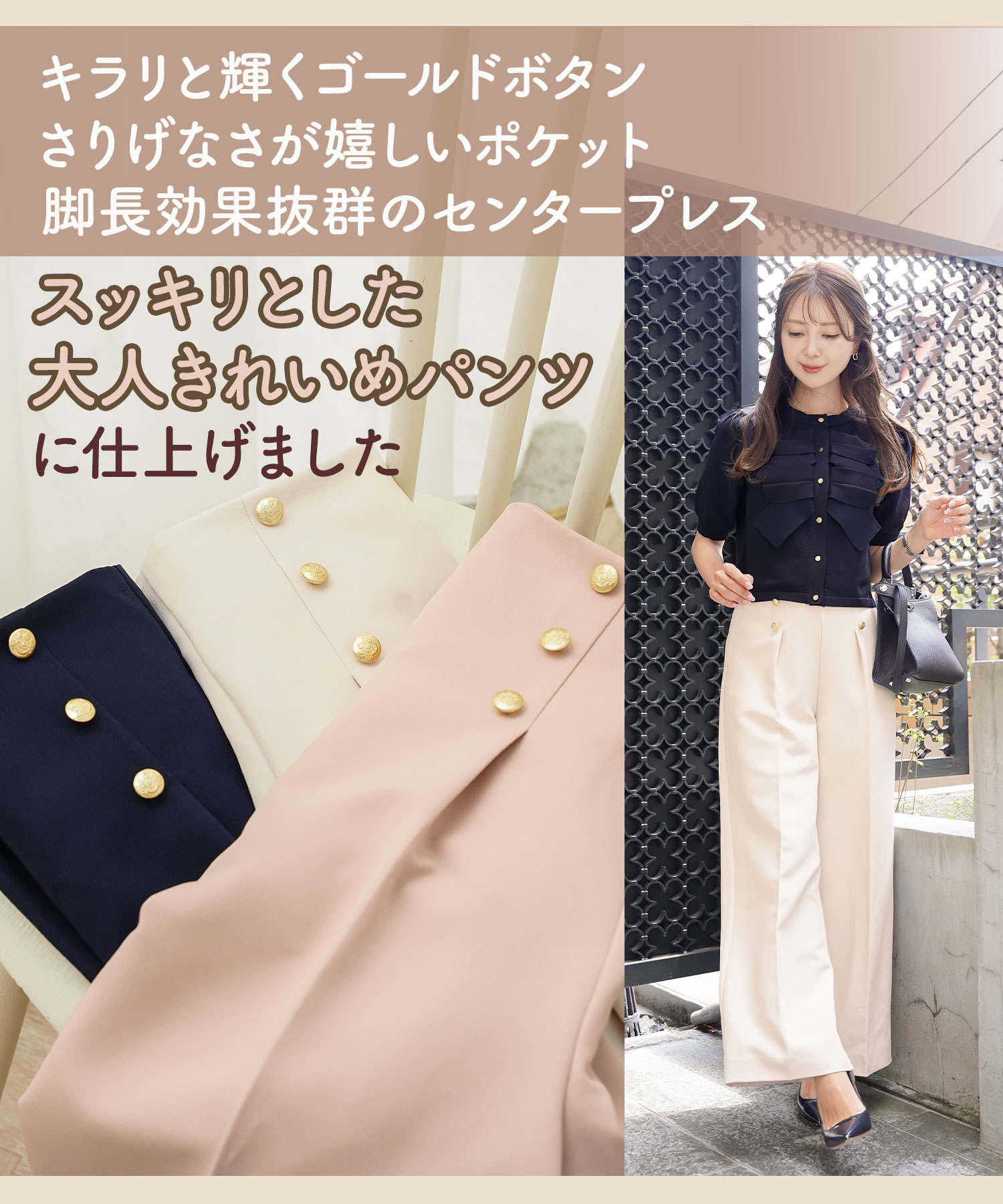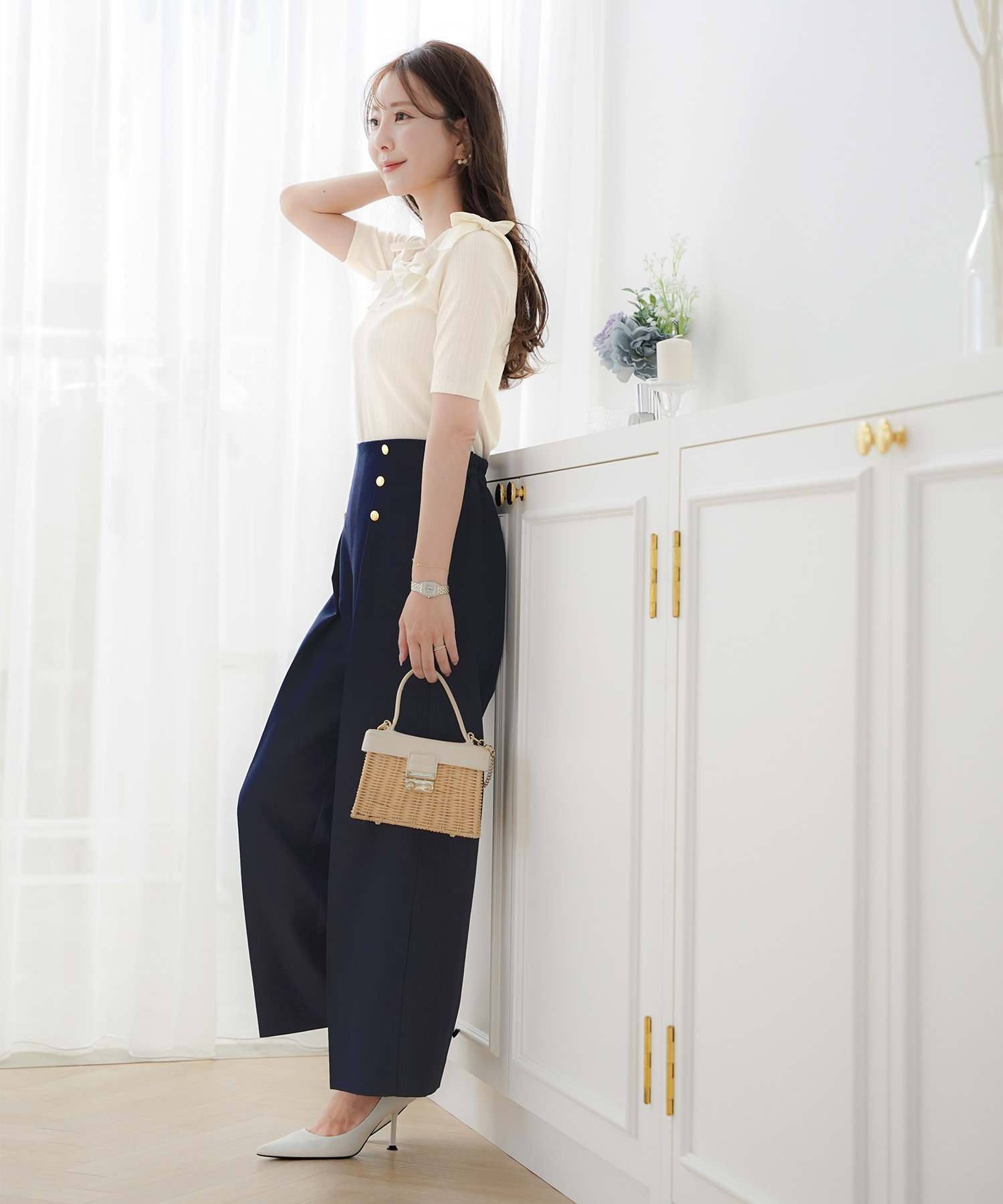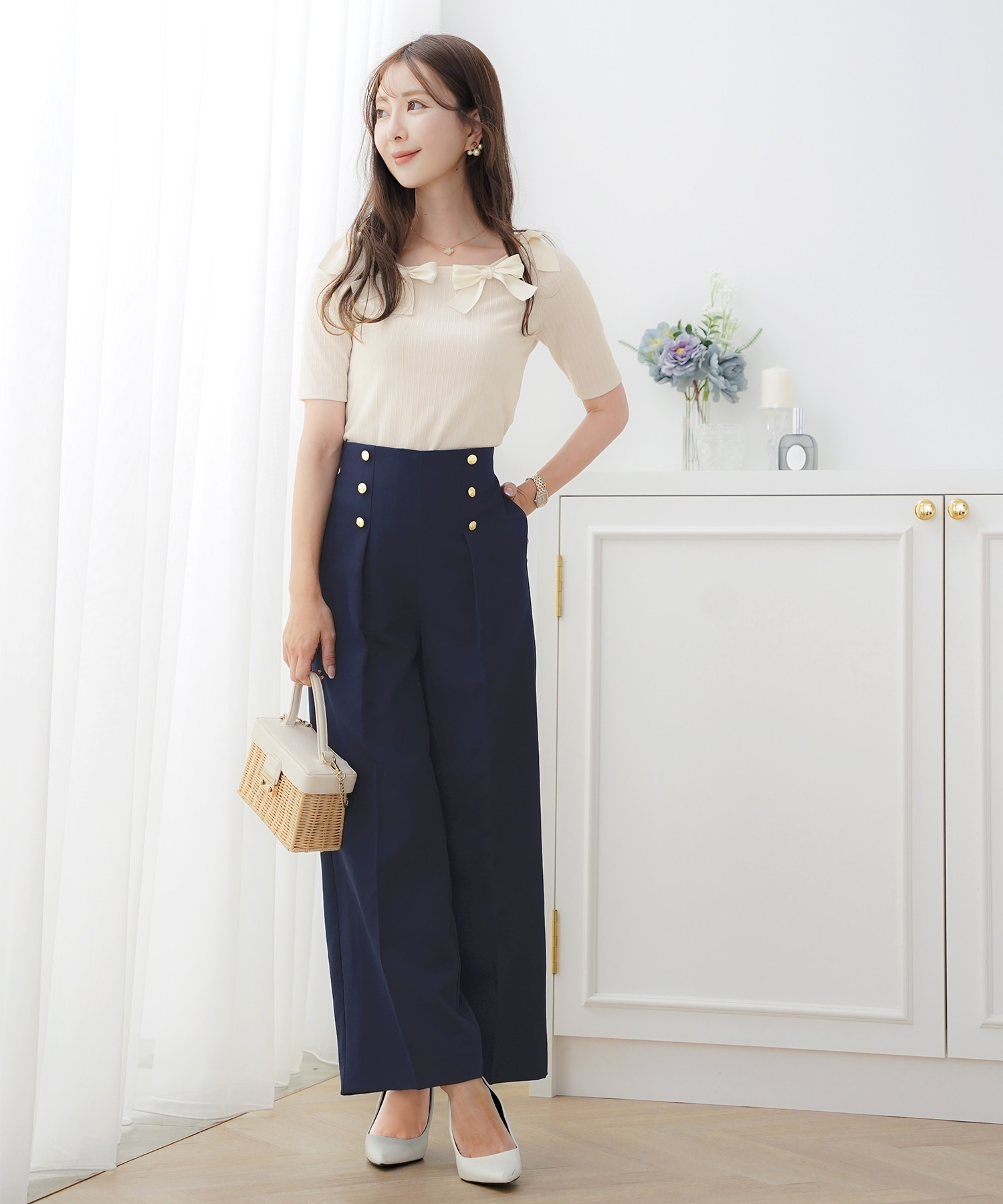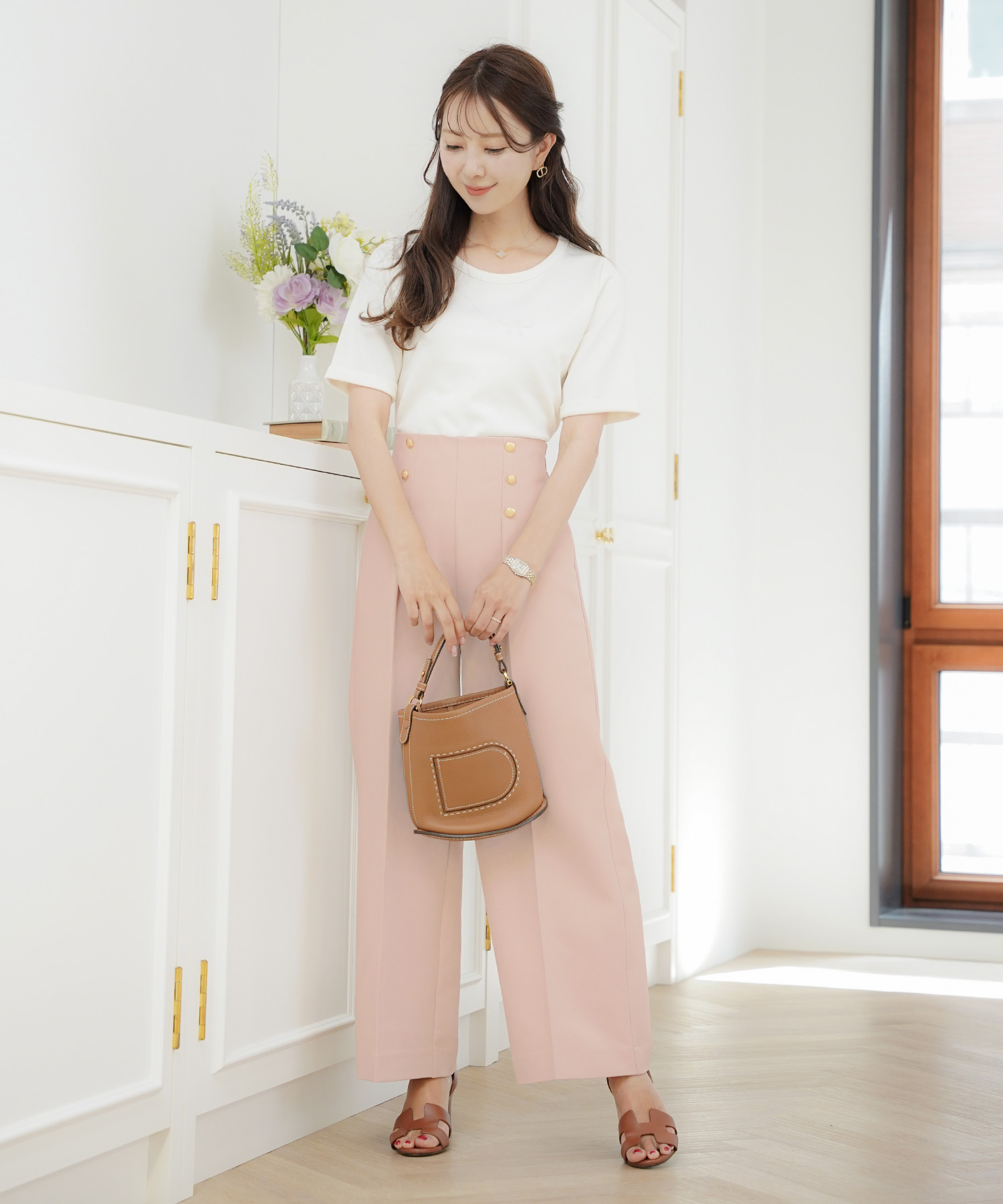 なかでも、金ボタンがアクセントになったマリンデザインのハイウエストパンツは、シンプルなTシャツやブラウスと合わせるだけでこなれた印象に。トップスをコンパクトにまとめれば、脚長効果も抜群。雨の日でもおしゃれを楽しみたい夏のデートにぴったりの1本です。