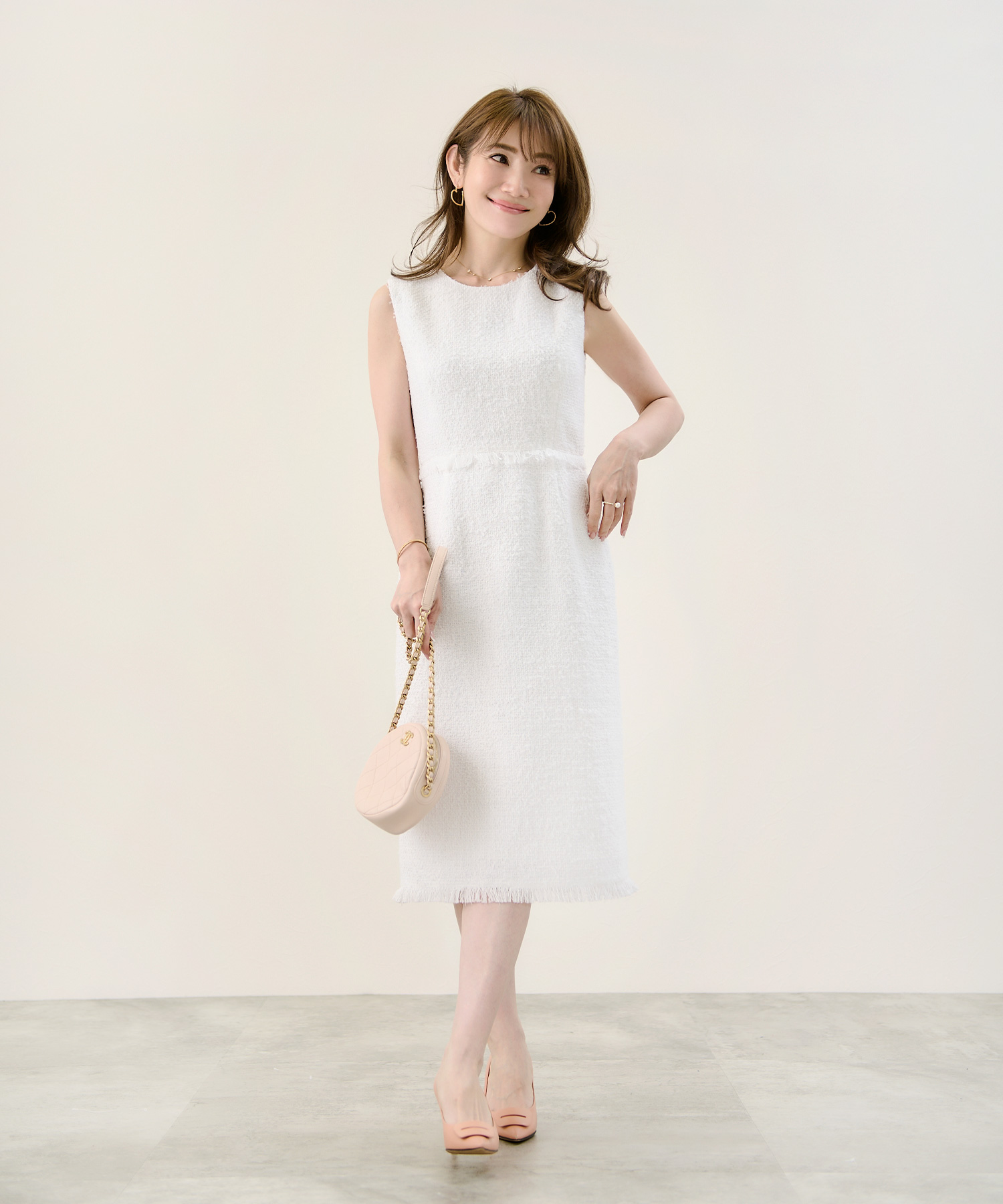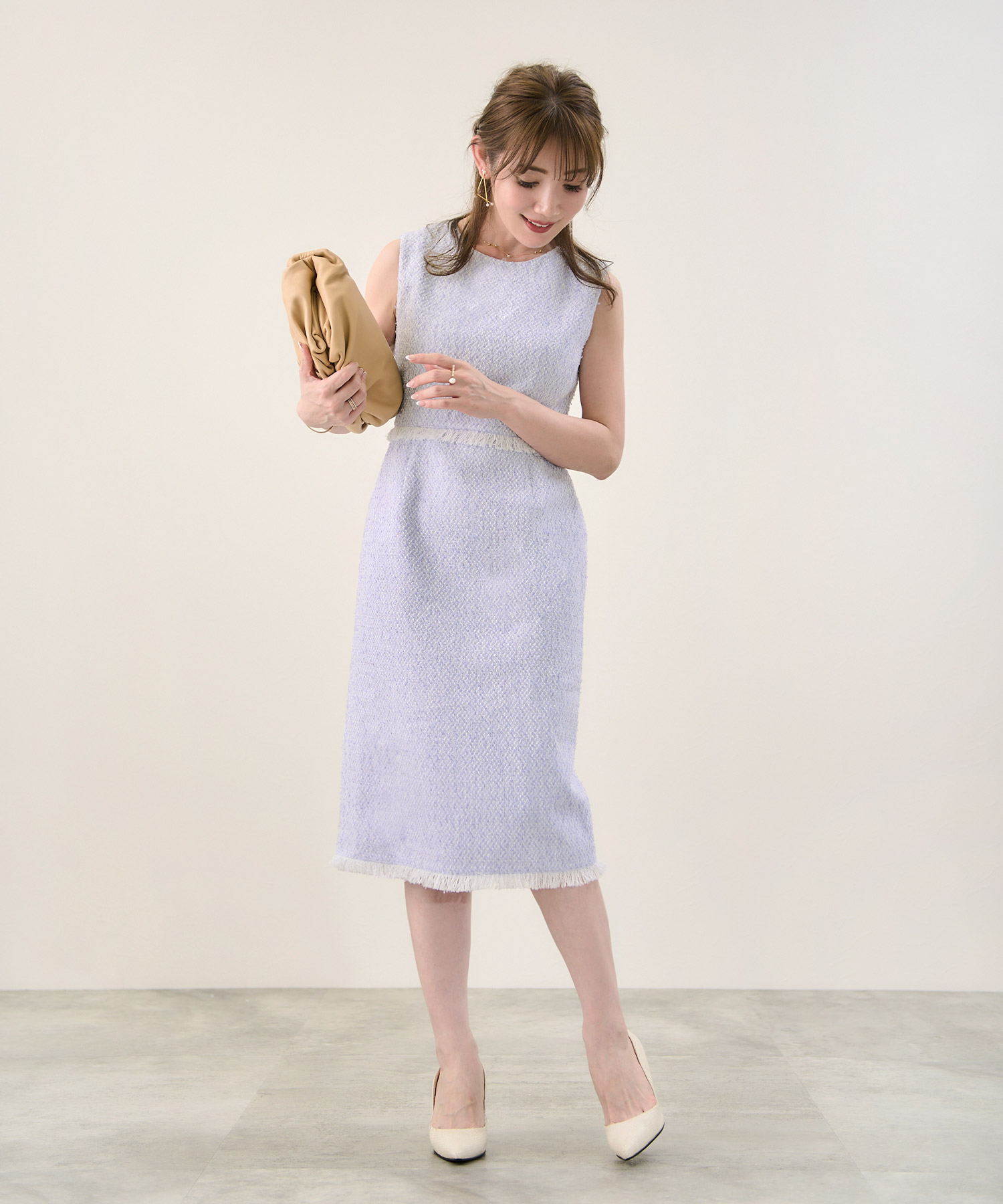 着用するだけできちんと感と育ちの良さが感じられるツイードワンピース。淡いラベンダーカラーで爽やかな印象に。シルエットは縦に長くほっそりとしたシルエットで体型自体もすっきり見えるのが特徴です。二の腕が気になる場合は肩にホワイトのニットカーディガンを羽織ると体型カバーになります。